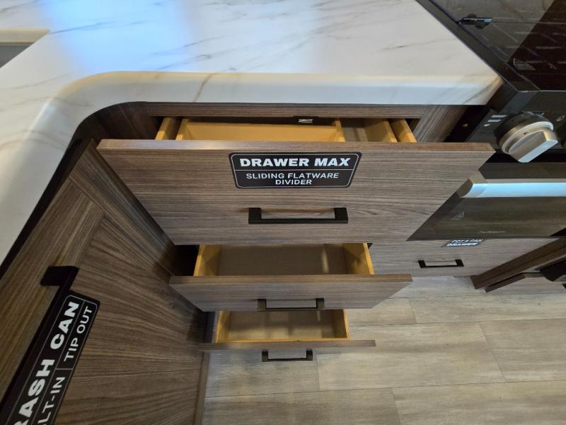 Spacious Living Area: A large slide-out expands the interior, accommodating a U-shaped dinette and theater seating, ensuring ample space for dining and relaxation.