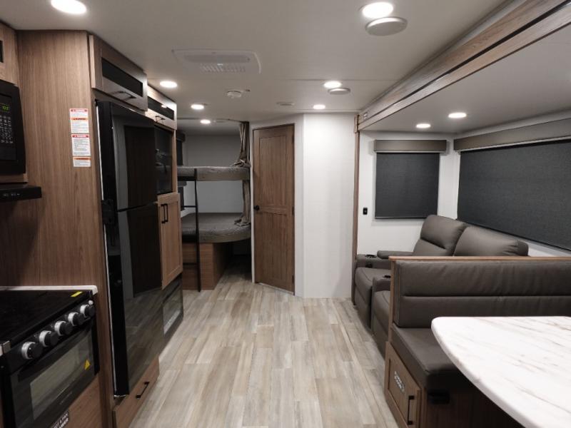 The perfect travel trailer for a larger family or one that enjoys traveling with friends! One large slide opens up the interior living space nice and features a U-shaped dinette and theater seating to provide plenty of seating for everyone. Enjoy the 40" HDTV opposite the seating for a movie indoors, and game night will be easy with everyone at the dinette which can also be converted for added sleeping if needed. The double entry doors will make loading and unloading simple, and allows you to easily slip in and out of the private bedroom for a morning walk. You can easily prepare all of your favorite meals and snacks with the kitchen amenities provided inside. A three burner range allows you to easily cook indoors, or you can enjoy cooking outside using the outdoor griddle/grill if you like. There is a 10 cu. ft. 12V refrigerator to keep all of your perishables and drinks nice and cold, plus a large sink for dishes and cleaning up, and there is also a flip-up counter extension for more prep space. You will also appreciate the rear corner bath featuring a 30" x 36" shower, vanity with sink, soft close porcelain toilet with foot flush, and linen cabinet for your towels.