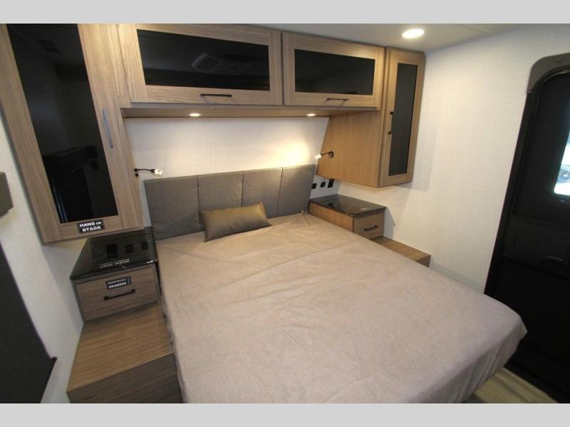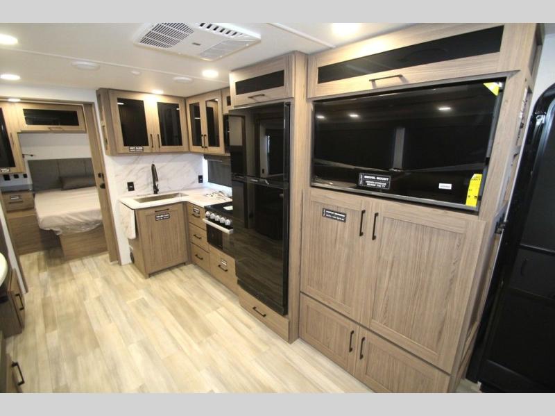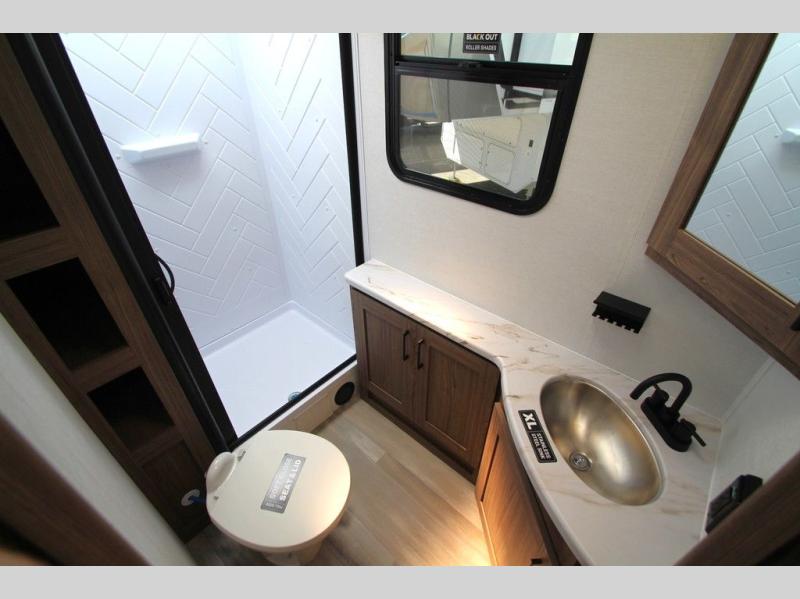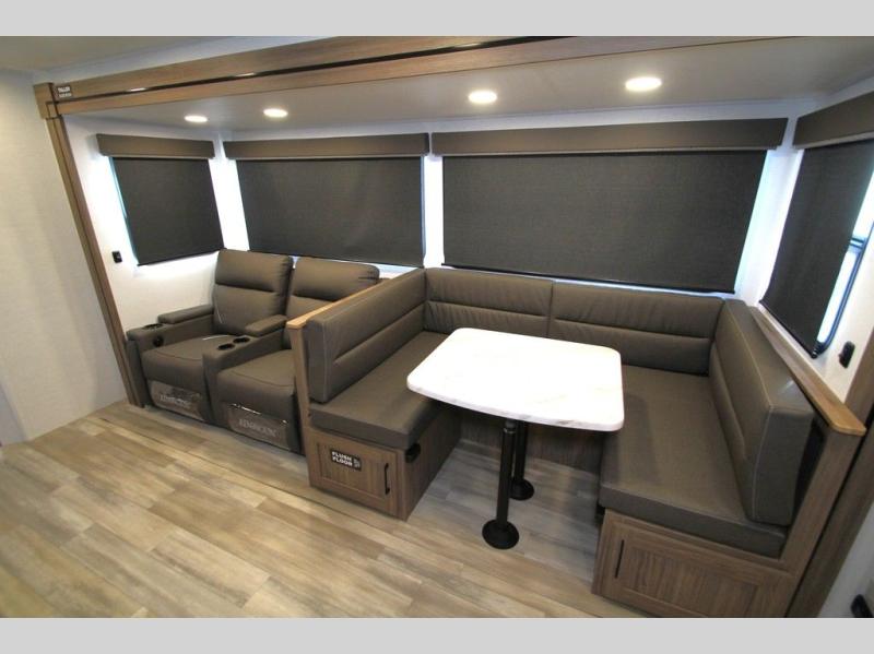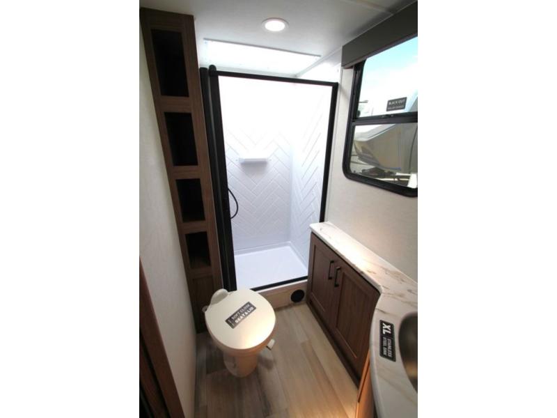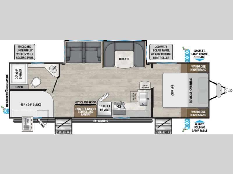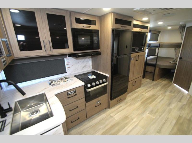 The perfect travel trailer for a larger family or one that enjoys traveling with friends! One large slide opens up the interior living space nice and features a U-shaped dinette and theater seating to provide plenty of seating for everyone. Enjoy the 40" HDTV opposite the seating for a movie indoors, and game night will be easy with everyone at the dinette which can also be converted for added sleeping if needed. The double entry doors will make loading and unloading simple, and allows you to easily slip in and out of the private bedroom for a morning walk. You can easily prepare all of your favorite meals and snacks with the kitchen amenities provided inside. A three burner range allows you to easily cook indoors, or you can enjoy cooking outside using the outdoor griddle/grill if you like. There is a 10 cu. ft. 12V refrigerator to keep all of your perishables and drinks nice and cold, plus a large sink for dishes and cleaning up, and there is also a flip-up counter extension for more prep space. You will also appreciate the rear corner bath featuring a 30" x 36" shower, vanity with sink, soft close porcelain toilet with foot flush, and linen cabinet for your towels.