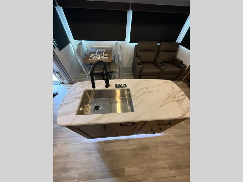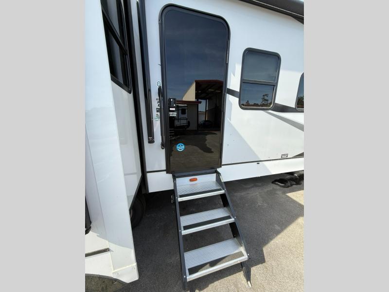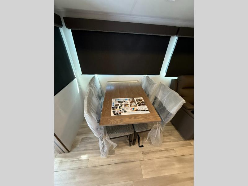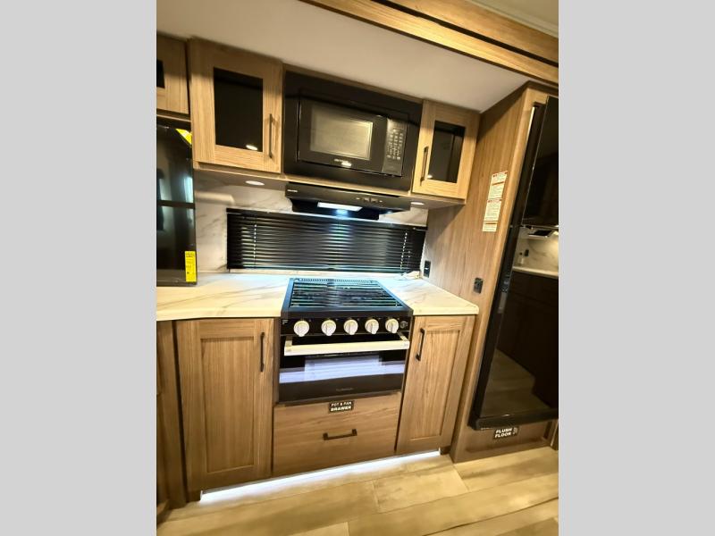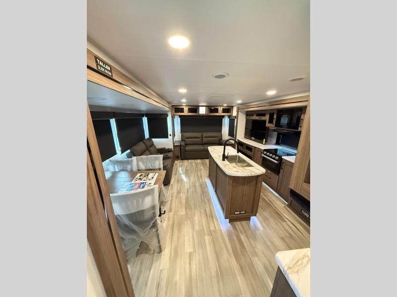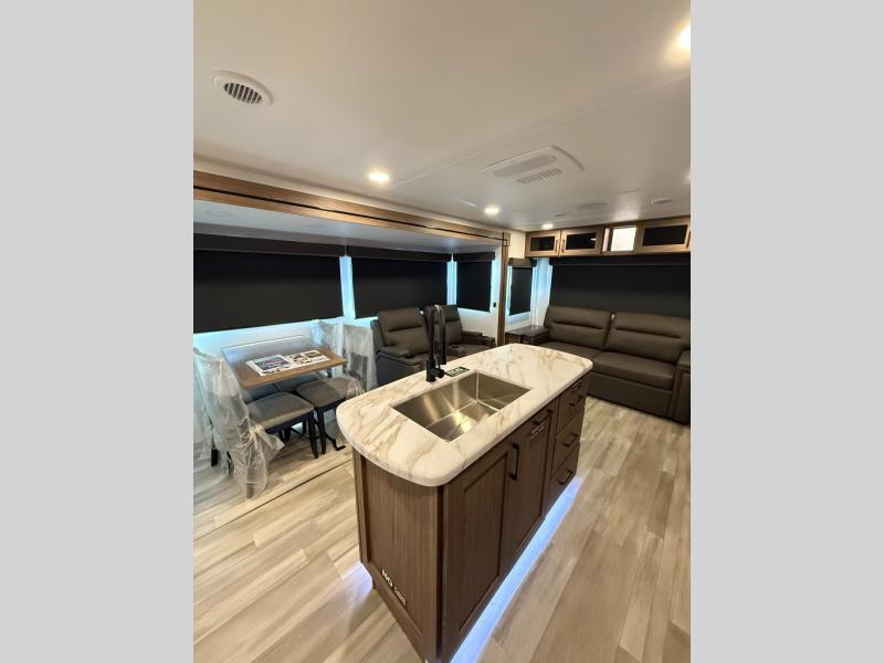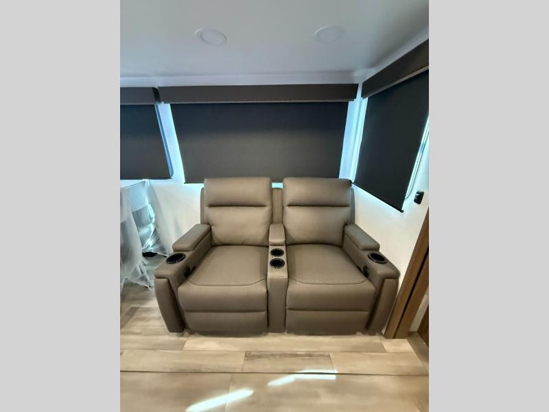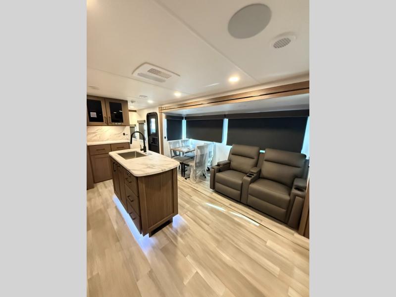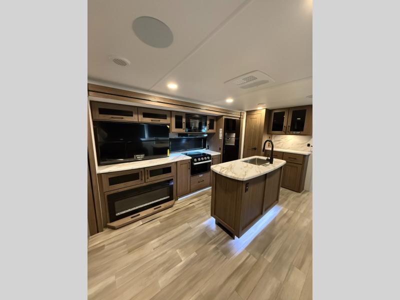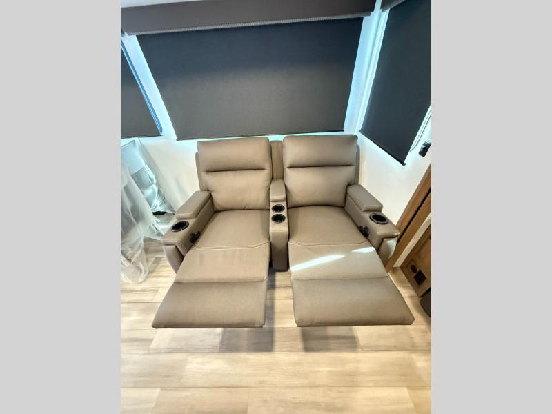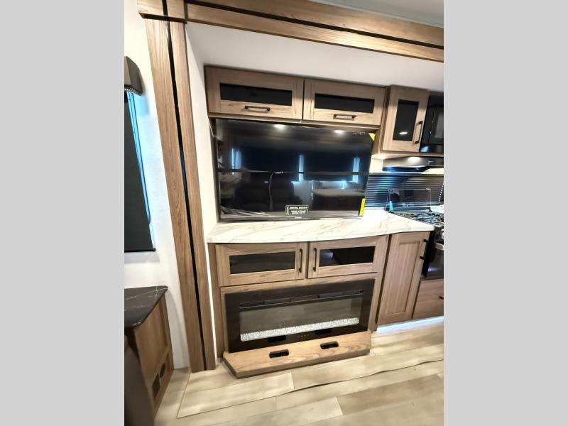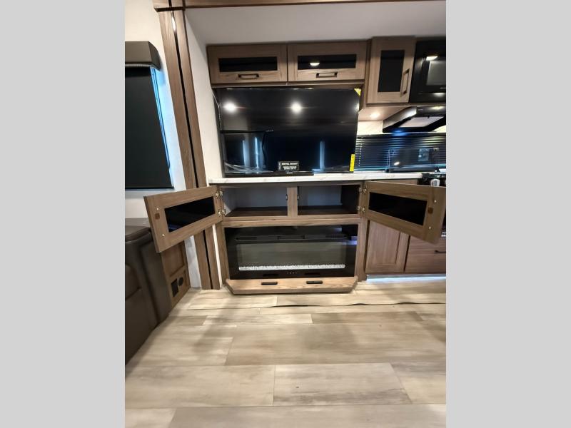 You will feel right at home camping in this travel trailer! The rear living area has a rear sofa and a set of theater seating conveniently across from the entertainment center with a 50" class HDTV above a pull-out fireplace storage for a cozy evening indoors. Prepare your best home cooked meals with the three burner cooktop, kitchen island which even has a tip-out trash can, and 10 cu. ft. 12V refrigerator. Enjoy your meals at the free standing dinette then either freshen up in the full bathroom with the 30" x 36" shower or head outside to relax under one of the two awnings. The front private bedroom has a queen bed for you to lay your head on at night and has wardrobe nightstands for your items!