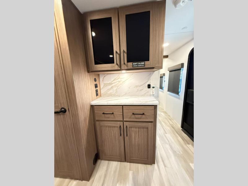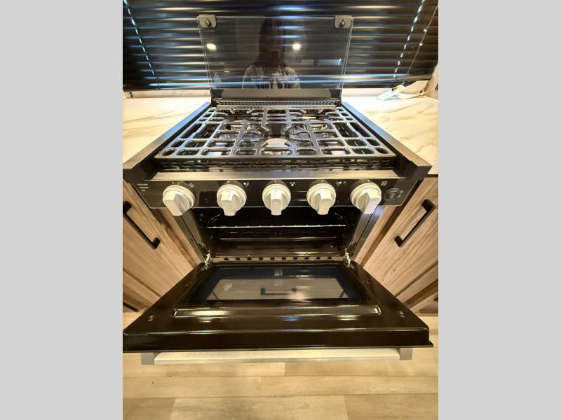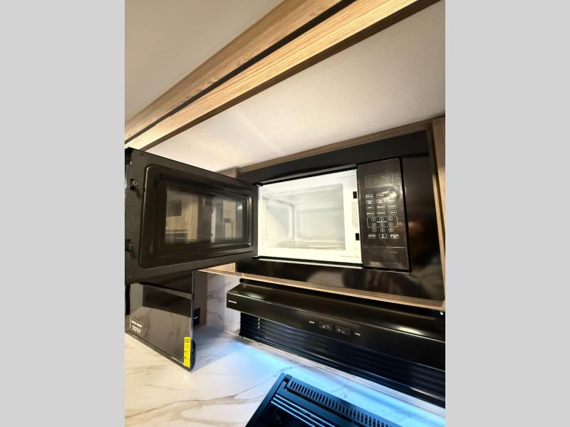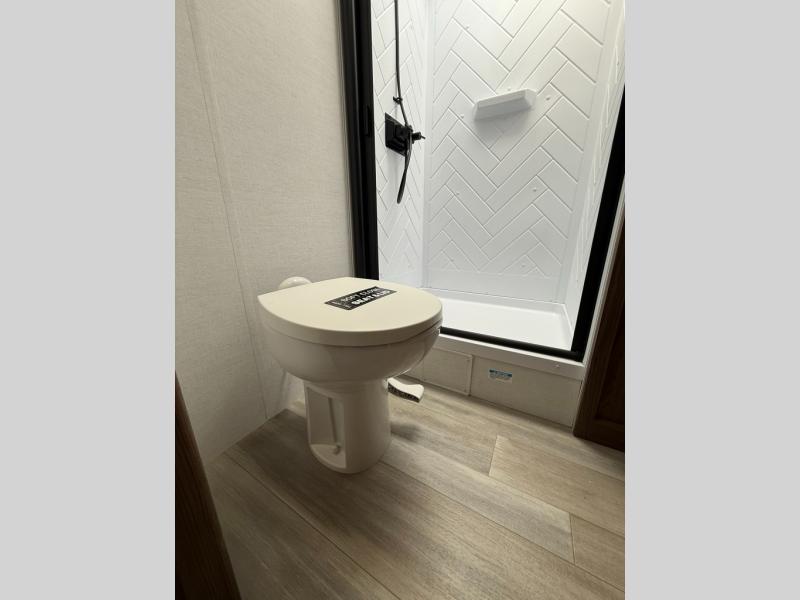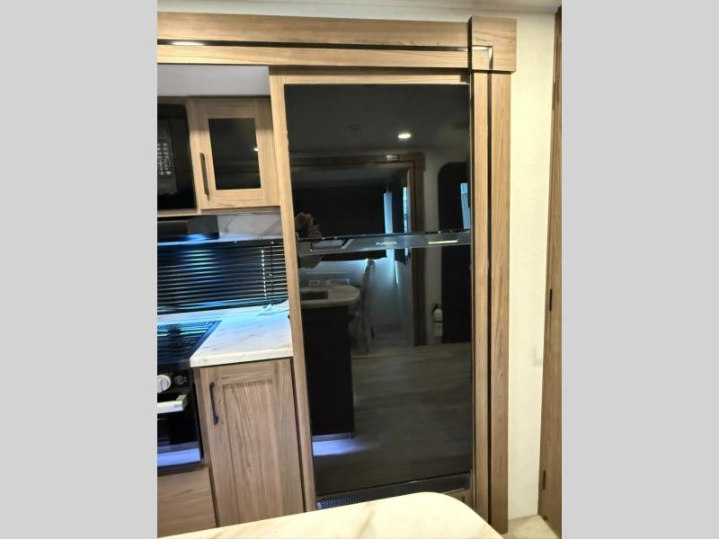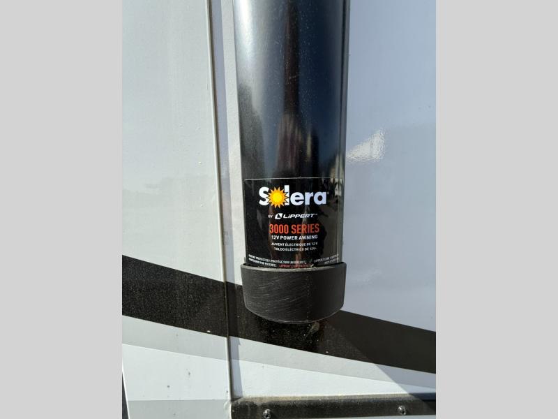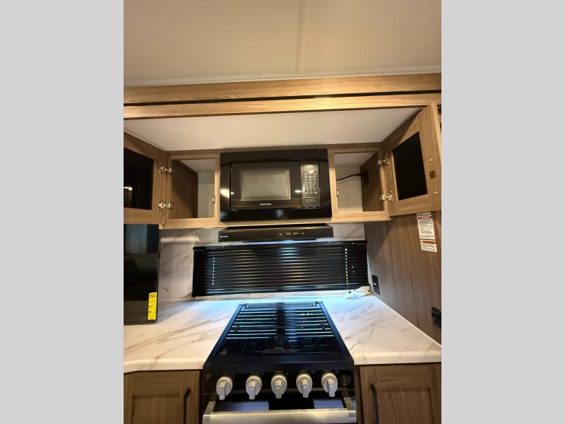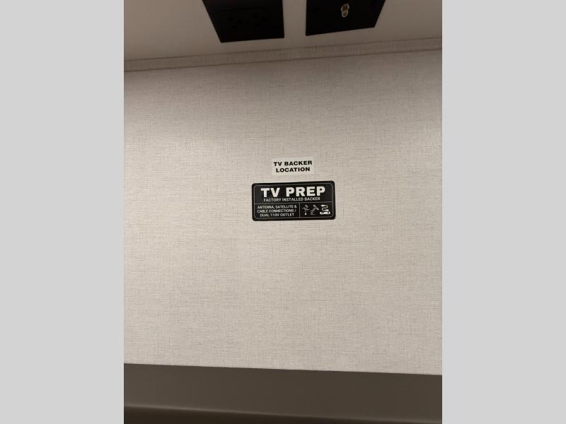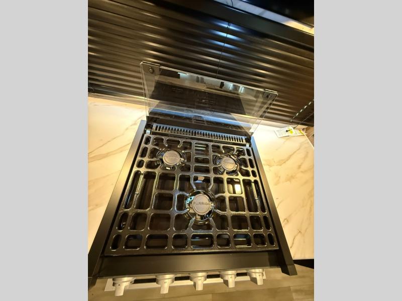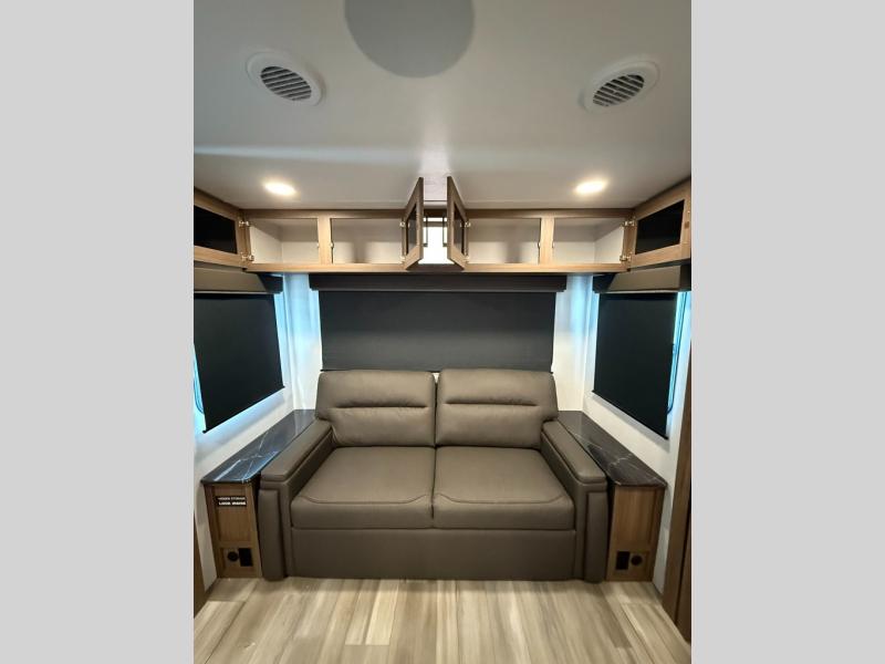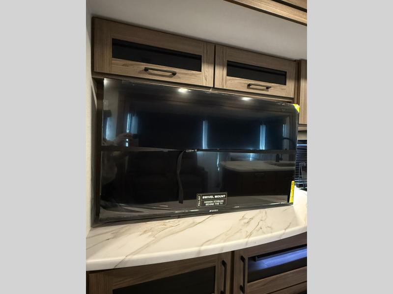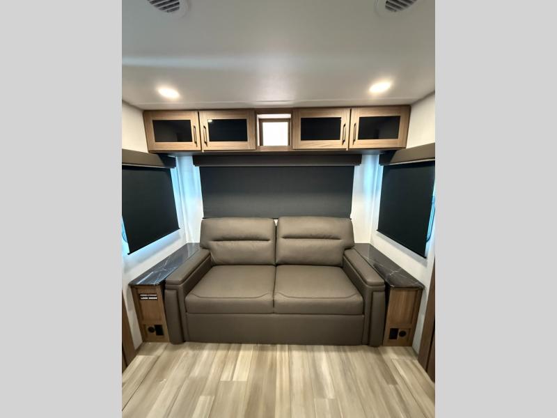 You will feel right at home camping in this travel trailer! The rear living area has a rear sofa and a set of theater seating conveniently across from the entertainment center with a 50" class HDTV above a pull-out fireplace storage for a cozy evening indoors. Prepare your best home cooked meals with the three burner cooktop, kitchen island which even has a tip-out trash can, and 10 cu. ft. 12V refrigerator. Enjoy your meals at the free standing dinette then either freshen up in the full bathroom with the 30" x 36" shower or head outside to relax under one of the two awnings. The front private bedroom has a queen bed for you to lay your head on at night and has wardrobe nightstands for your items!
