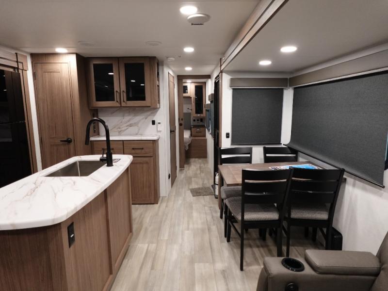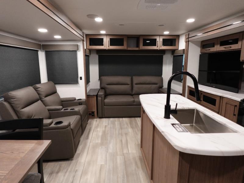 You will feel right at home camping in this travel trailer! The rear living area has a rear sofa and a set of theater seating conveniently across from the entertainment center with a 50" class HDTV above a pull-out fireplace storage for a cozy evening indoors. Prepare your best home cooked meals with the three burner cooktop, kitchen island which even has a tip-out trash can, and 10 cu. ft. 12V refrigerator. Enjoy your meals at the free standing dinette then either freshen up in the full bathroom with the 30" x 36" shower or head outside to relax under one of the two awnings. The front private bedroom has a queen bed for you to lay your head on at night and has wardrobe nightstands for your items!
