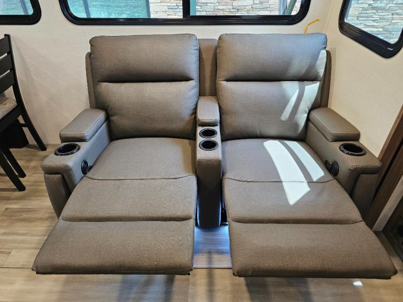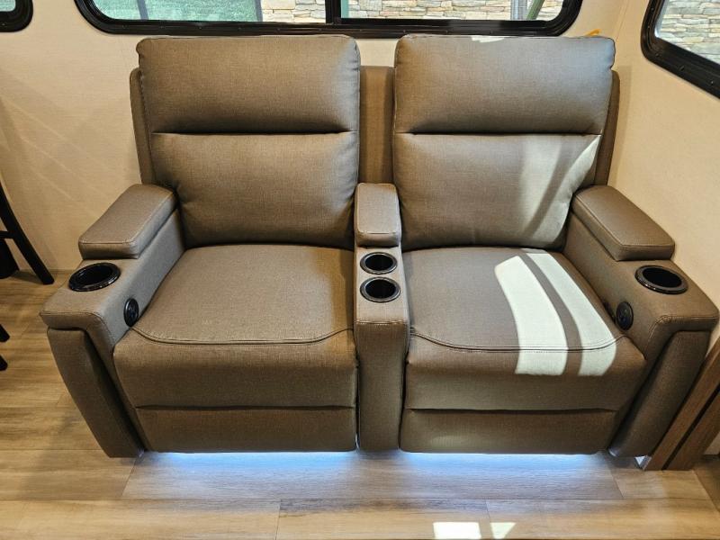 Dual theater seating across from a 50" HDTV and pull-out fireplace with hidden storage