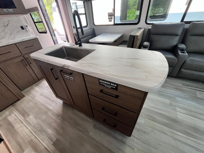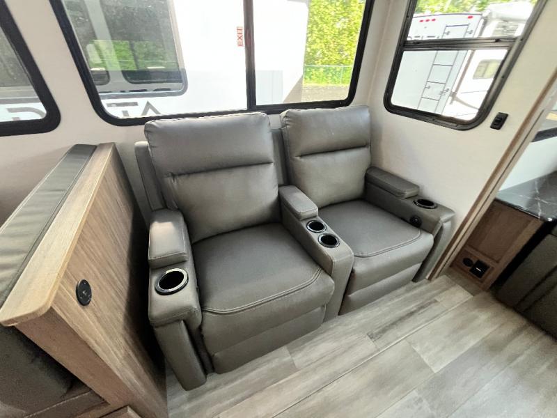 You will feel right at home camping in this travel trailer! The rear living area has a rear sofa and a set of theater seating conveniently across from the entertainment center with a 50" class HDTV above a pull-out fireplace storage for a cozy evening indoors. Prepare your best home cooked meals with the three burner cooktop, kitchen island which even has a tip-out trash can, and 10 cu. ft. 12V refrigerator. Enjoy your meals at the free standing dinette then either freshen up in the full bathroom with the 30" x 36" shower or head outside to relax under one of the two awnings. The front private bedroom has a queen bed for you to lay your head on at night and has wardrobe nightstands for your items!