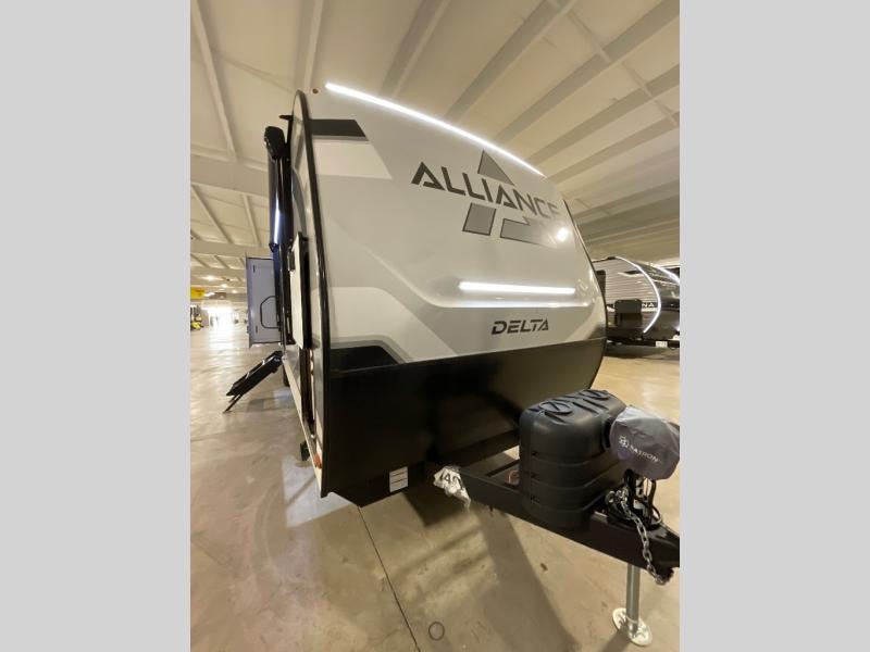 Form and function works together with every one of these Alliance RV Delta travel trailers! They are built with a walk-on roof with a seamless PVC roof covering, Mylar reinforced exterior seals, and a heated and enclosed underbelly to protect your unit in all seasons. The commercial grade vinyl flooring will be easy to clean and the oversized atrium windows throughout let in plenty of natural sunlight. With 62 cu. ft. of drop frame pass-through storage, you can bring along all of your essential camping gear plus it has USB charging for more convenience. There are many at home interior conveniences including a Bluetooth speaker, USB charging throughout, and even a pull-out kitchen trash can. Come find your favorite model today!