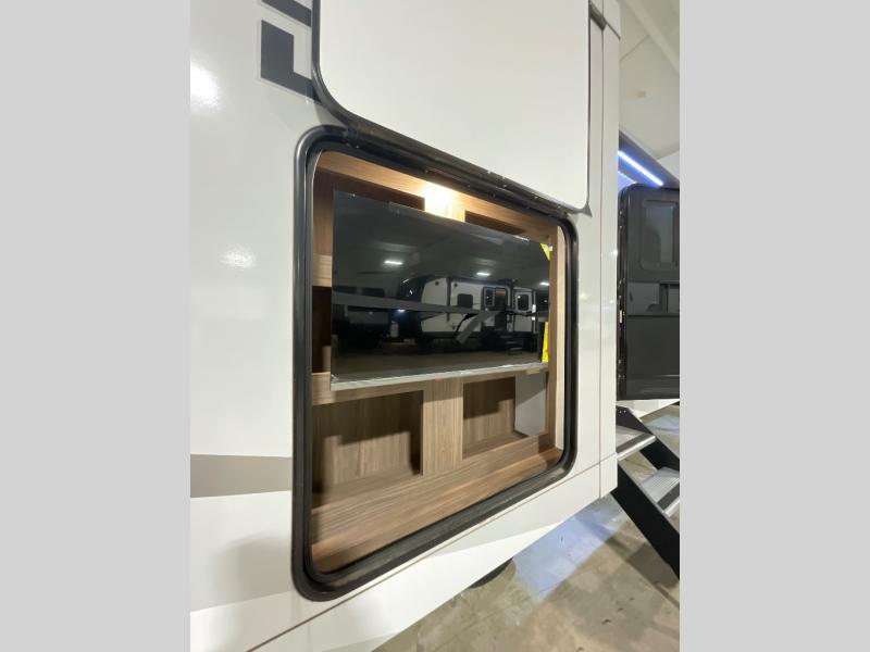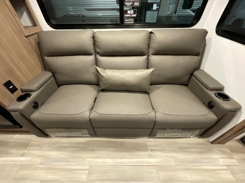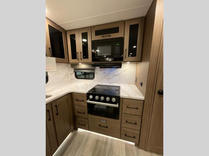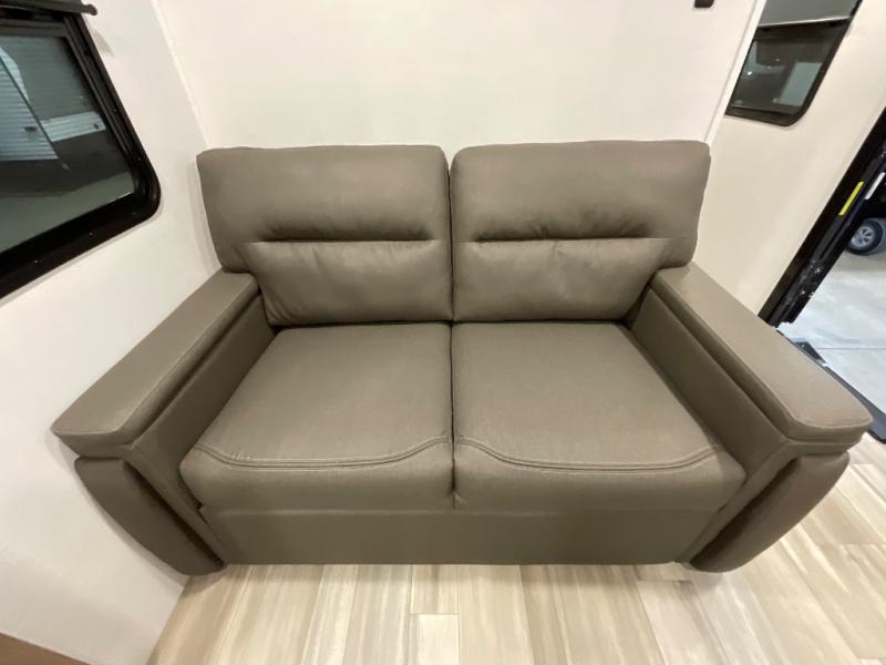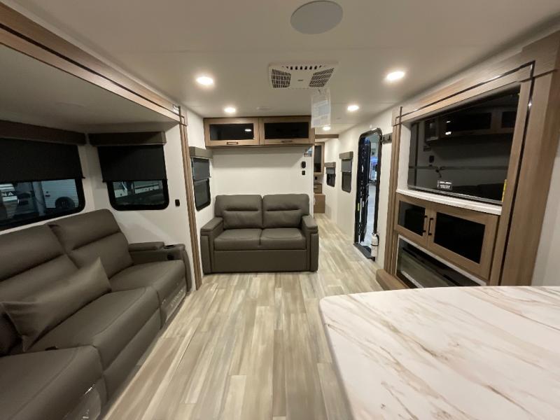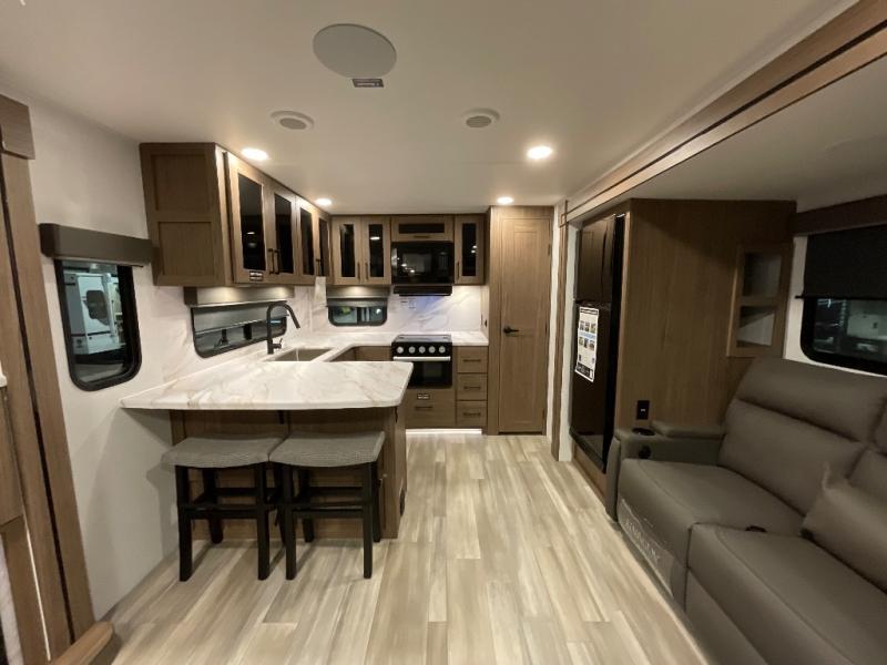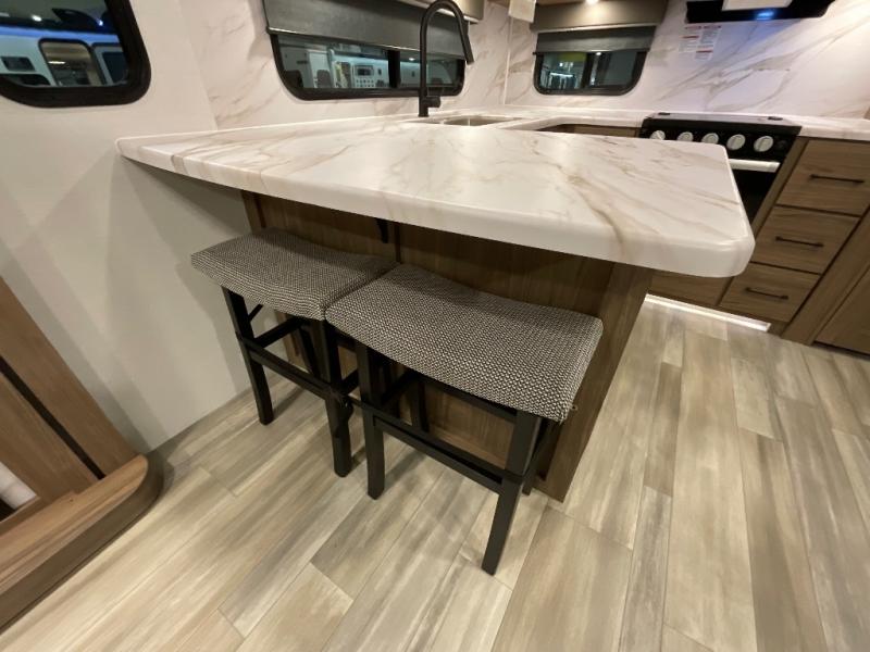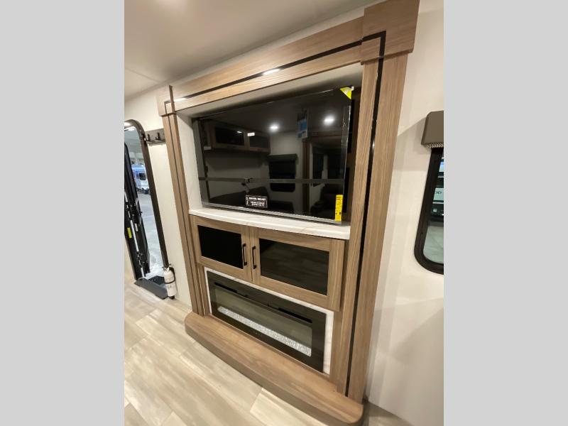 Start camping in luxury with this travel trailer! Prepare your best home cooked meals in the rear kitchen with the three burner cooktop, 10 cu. ft. 12V refrigerator, tip-out trash can, and even two bar stools to enjoy your morning coffee while reading the newspaper. Freshen up in the full bathroom with the 30" x 36" shower or head outside to relax under one of the two awnings. There is even an outdoor griddle/grill underneath one of the awnings to protect you while you grill up some juicy burgers, plus an outside 32" TV. The front private bedroom has a queen bed for you to lay your head on at night and has wardrobe nightstands for your items. Relax in true comfort each night on one of the two furniture spots in front of the entertainment center with a 50" class HDTV with a fireplace below it!