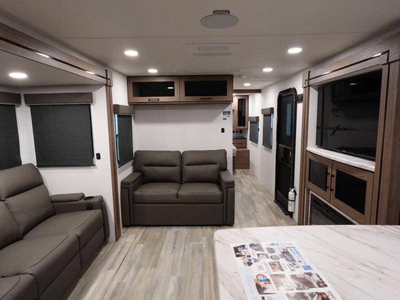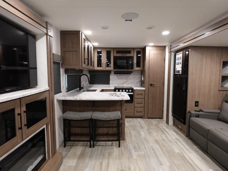 Start camping in luxury with this travel trailer! Prepare your best home cooked meals in the rear kitchen with the three burner cooktop, 10 cu. ft. 12V refrigerator, tip-out trash can, and even two bar stools to enjoy your morning coffee while reading the newspaper. Freshen up in the full bathroom with the 30" x 36" shower or head outside to relax under one of the two awnings. There is even an outdoor griddle/grill underneath one of the awnings to protect you while you grill up some juicy burgers, plus an outside 32" TV. The front private bedroom has a queen bed for you to lay your head on at night and has wardrobe nightstands for your items. Relax in true comfort each night on one of the two furniture spots in front of the entertainment center with a 50" class HDTV with a fireplace below it!