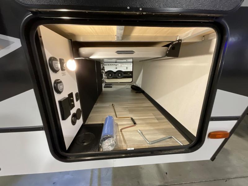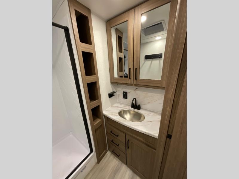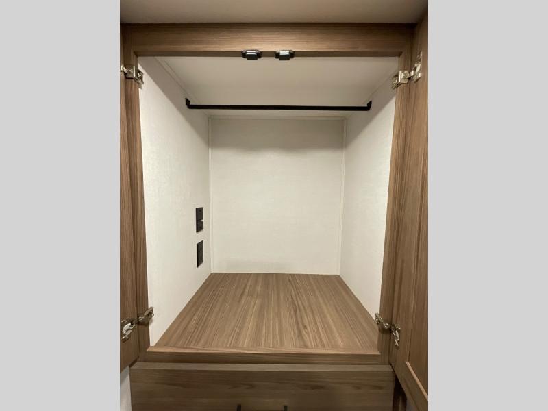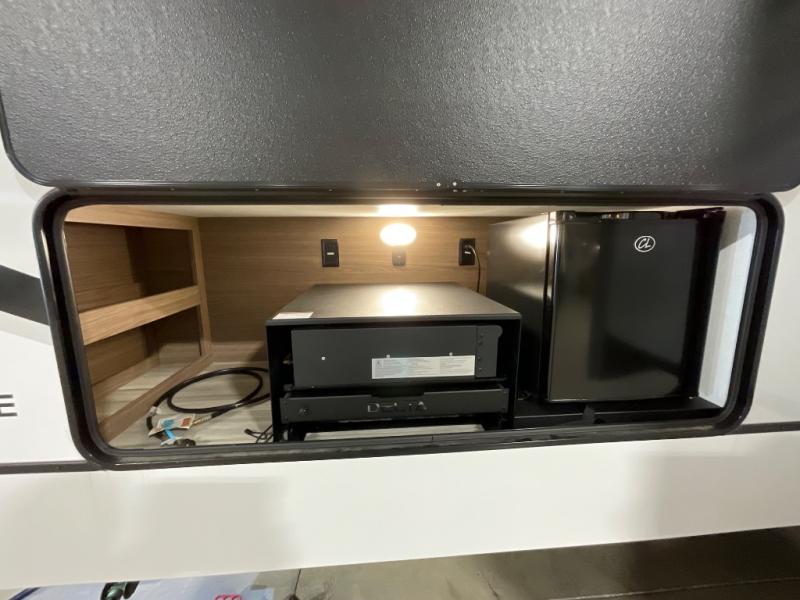 Enjoy glamping in this spacious travel trailer for eight! Your guests or the kids will love the rear bunkhouse with 40" x 72" bunk beds across from a third bunk with a cube sofa below, and the slide out will make this space more open. The slide out also includes the booth dinette in the main living area, which is across from the sofa slide out. The chef will love cooking in this Delta kitchen with generous counter space, a 10 cu. ft. 12V refrigerator, plus pull-out pantry trays for dry goods and snacks. The full bath with a 30" x 36" shower and a soft close porcelain foot flush toilet will allow you to fresh up each day without having to use the camp's facilities. And don't overlook the front private bedroom with a queen bed, wardrobe nightstands, a third wardrobe plus overhead storage; now nothing has to get left behind!