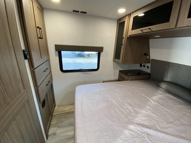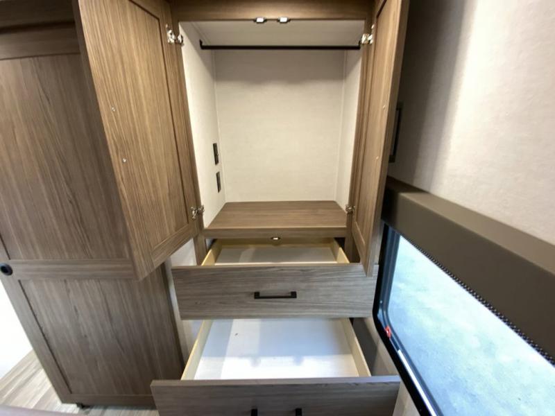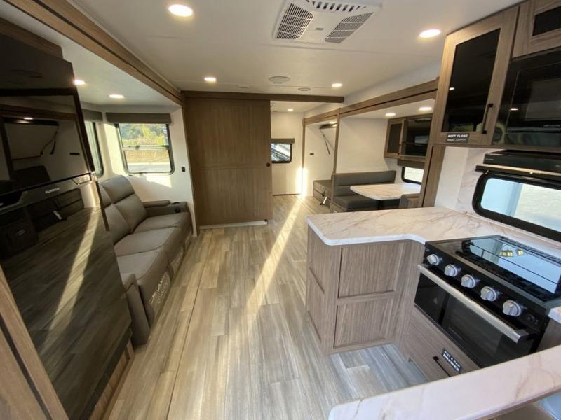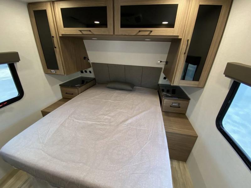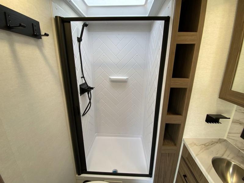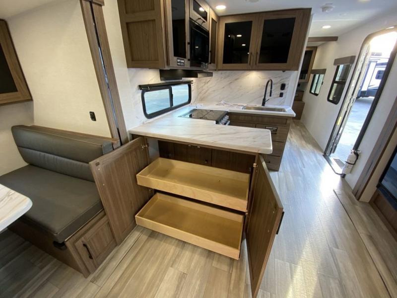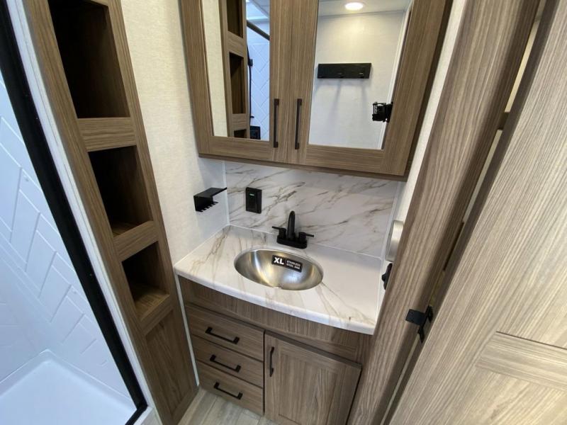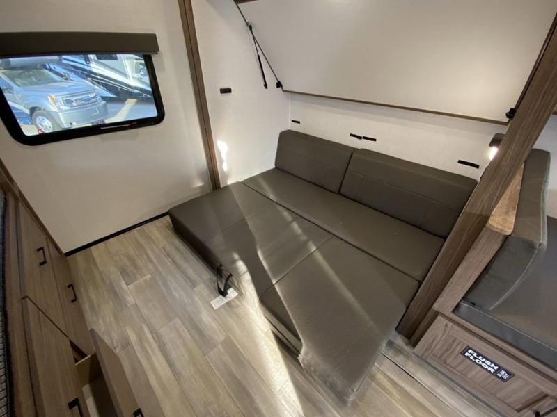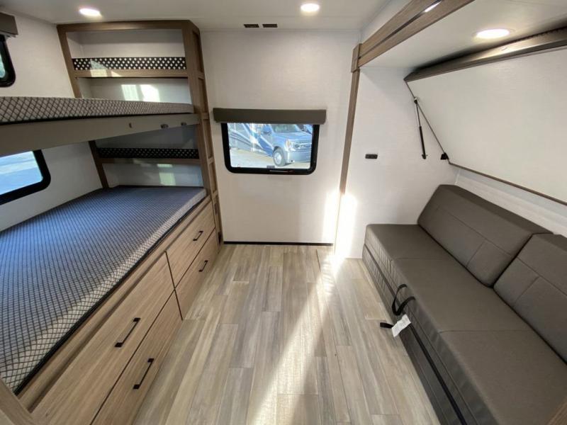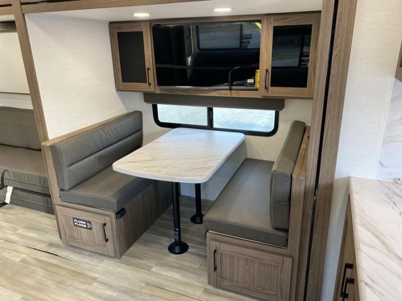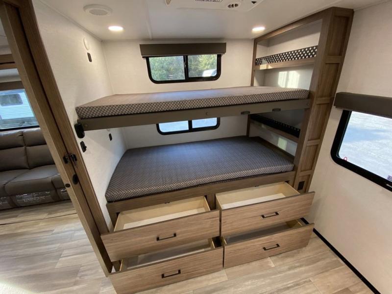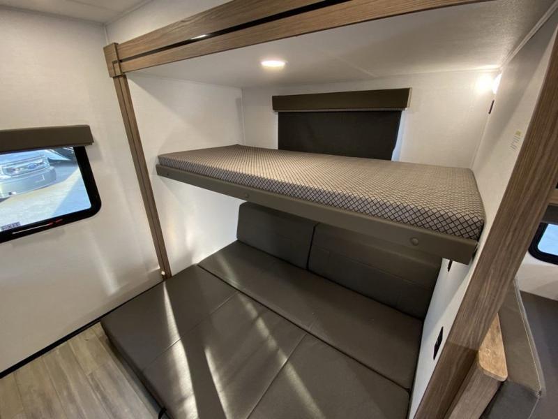 Enjoy glamping in this spacious travel trailer for eight! Your guests or the kids will love the rear bunkhouse with 40" x 72" bunk beds across from a third bunk with a cube sofa below, and the slide out will make this space more open. The slide out also includes the booth dinette in the main living area, which is across from the sofa slide out. The chef will love cooking in this Delta kitchen with generous counter space, a 10 cu. ft. 12V refrigerator, plus pull-out pantry trays for dry goods and snacks. The full bath with a 30" x 36" shower and a soft close porcelain foot flush toilet will allow you to fresh up each day without having to use the camp's facilities. And don't overlook the front private bedroom with a queen bed, wardrobe nightstands, a third wardrobe plus overhead storage; now nothing has to get left behind!