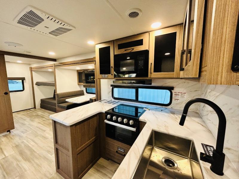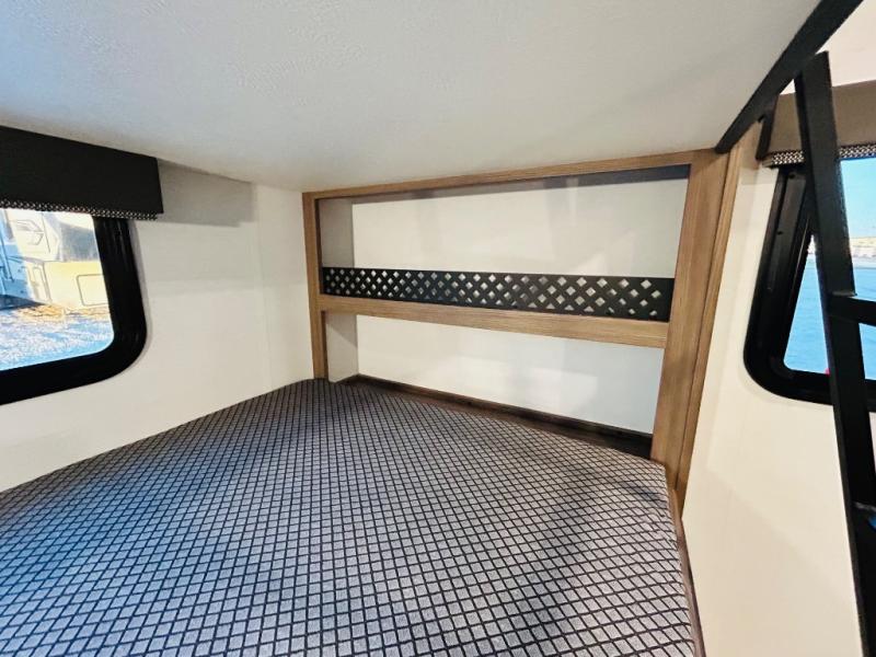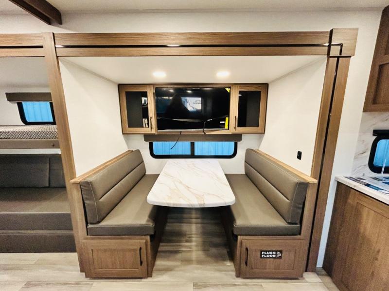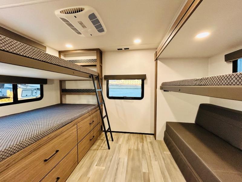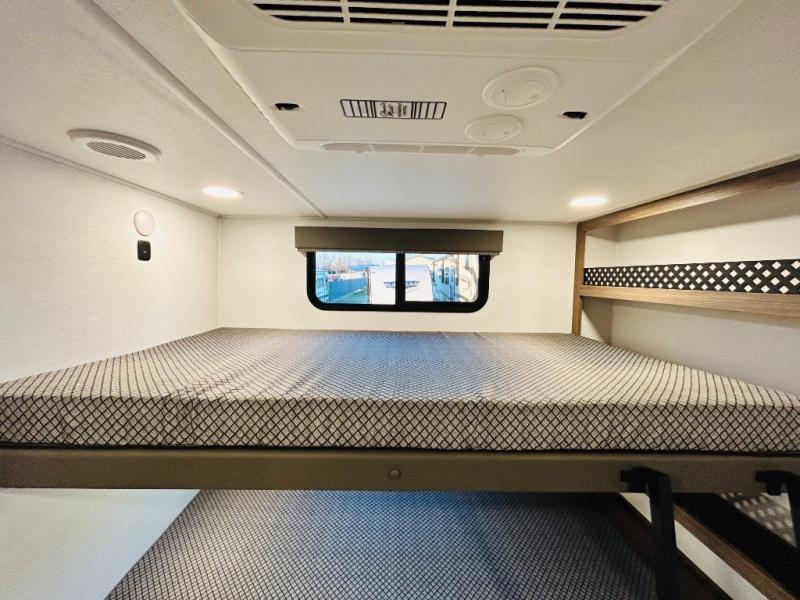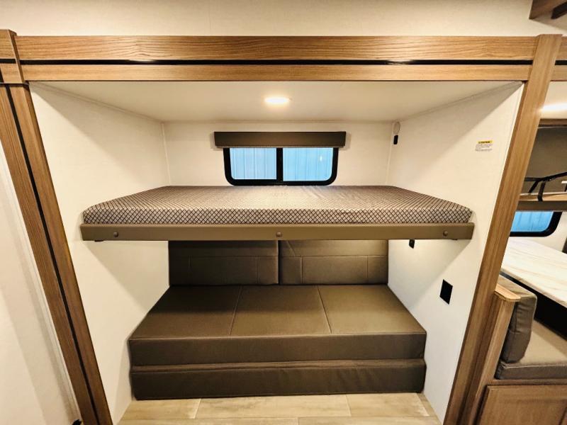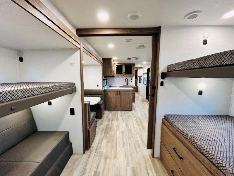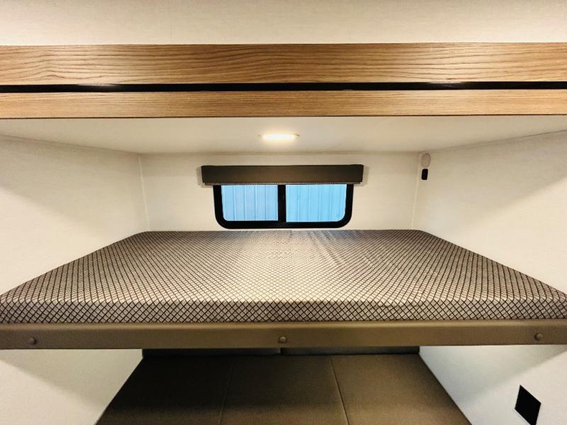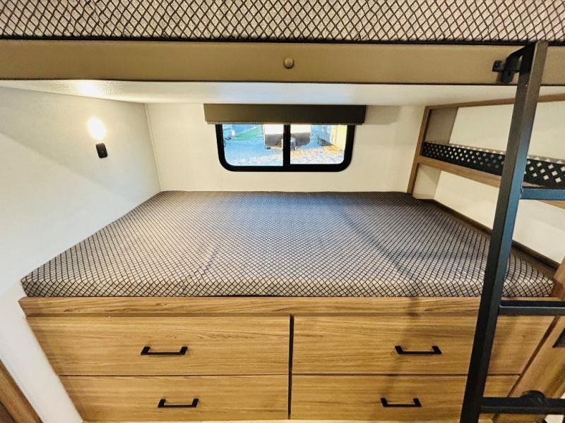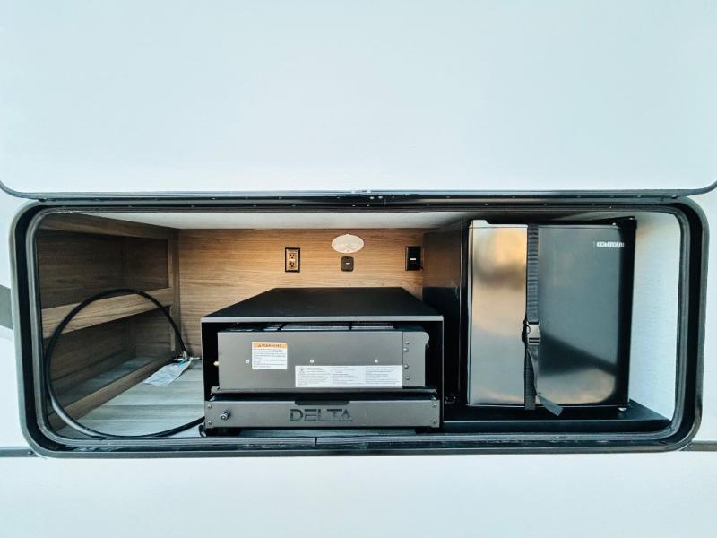 Enjoy glamping in this spacious travel trailer for eight! Your guests or the kids will love the rear bunkhouse with 40" x 72" bunk beds across from a third bunk with a cube sofa below, and the slide out will make this space more open. The slide out also includes the booth dinette in the main living area, which is across from the sofa slide out. The chef will love cooking in this Delta kitchen with generous counter space, a 10 cu. ft. 12V refrigerator, plus pull-out pantry trays for dry goods and snacks. The full bath with a 30" x 36" shower and a soft close porcelain foot flush toilet will allow you to fresh up each day without having to use the camp's facilities. And don't overlook the front private bedroom with a queen bed, wardrobe nightstands, a third wardrobe plus overhead storage; now nothing has to get left behind!