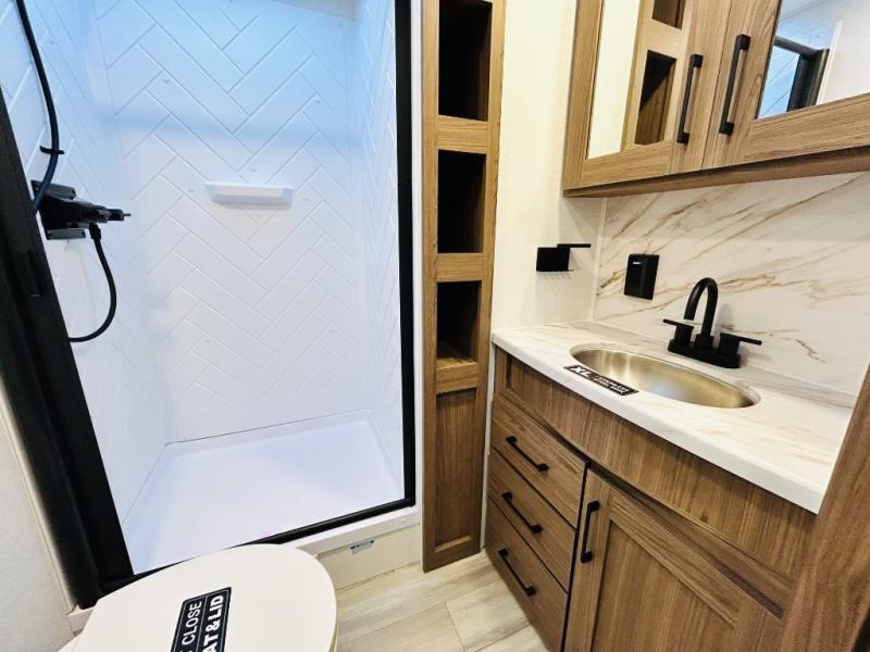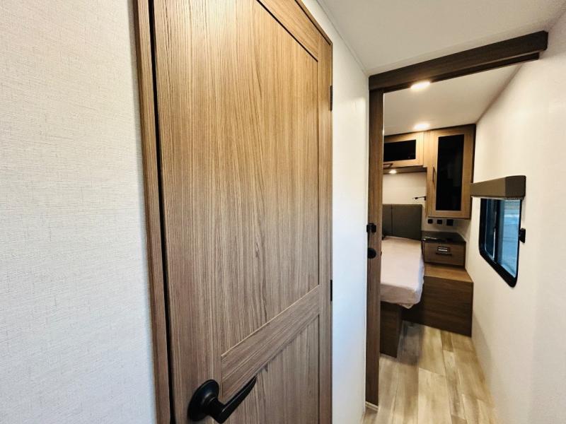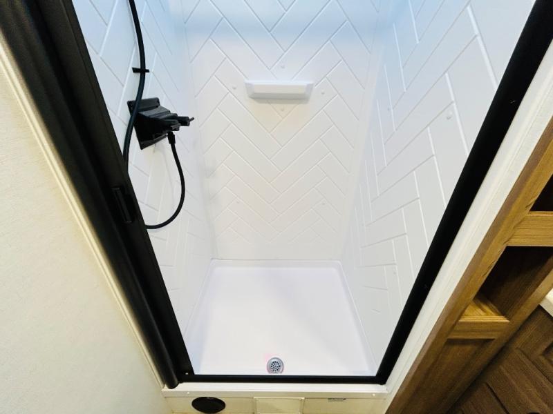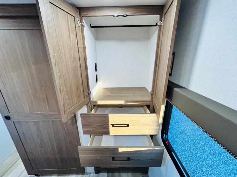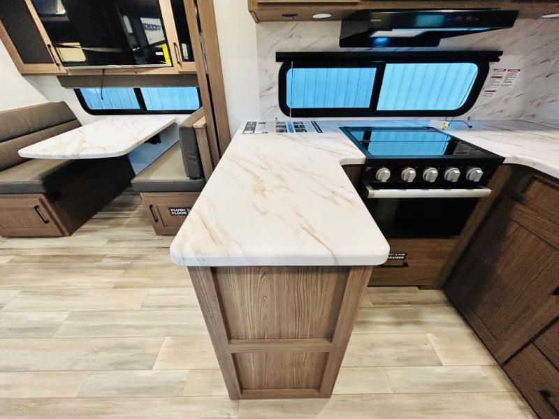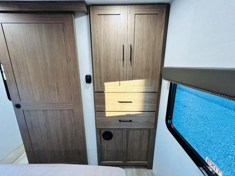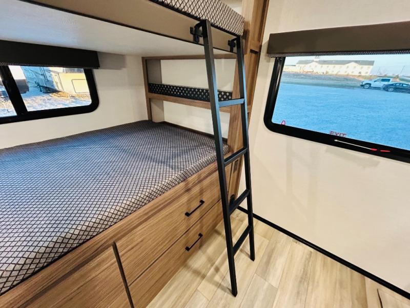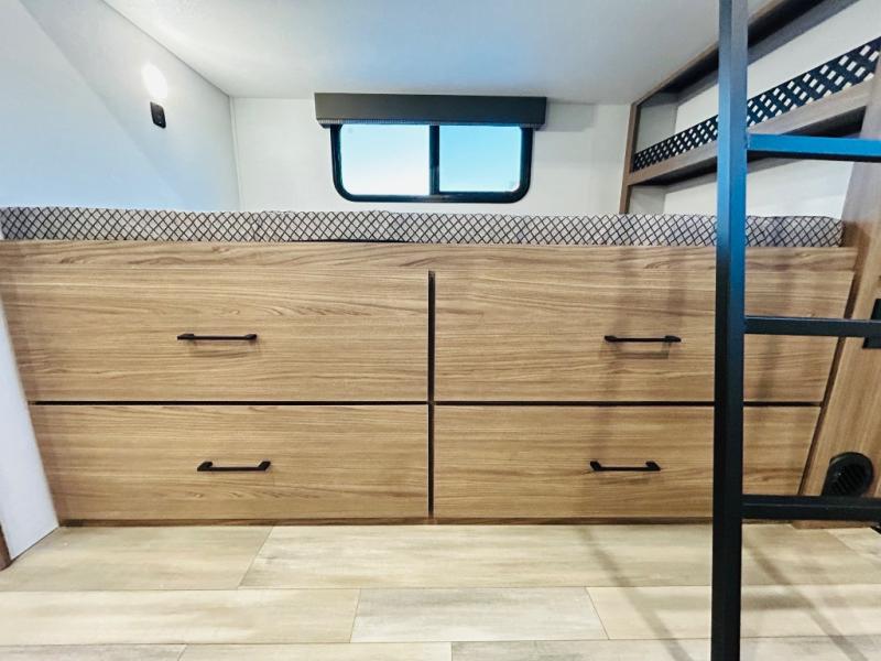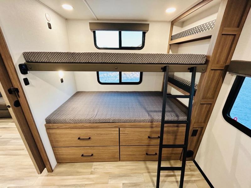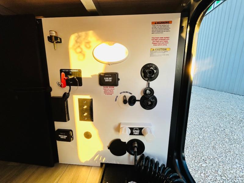 Enjoy glamping in this spacious travel trailer for eight! Your guests or the kids will love the rear bunkhouse with 40" x 72" bunk beds across from a third bunk with a cube sofa below, and the slide out will make this space more open. The slide out also includes the booth dinette in the main living area, which is across from the sofa slide out. The chef will love cooking in this Delta kitchen with generous counter space, a 10 cu. ft. 12V refrigerator, plus pull-out pantry trays for dry goods and snacks. The full bath with a 30" x 36" shower and a soft close porcelain foot flush toilet will allow you to fresh up each day without having to use the camp's facilities. And don't overlook the front private bedroom with a queen bed, wardrobe nightstands, a third wardrobe plus overhead storage; now nothing has to get left behind!