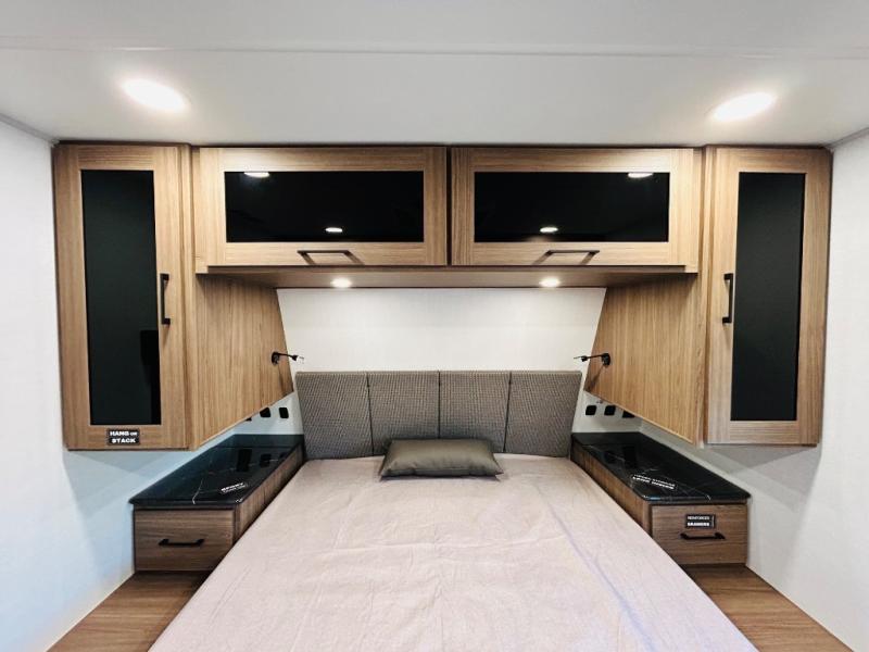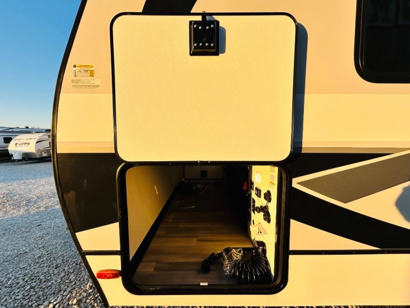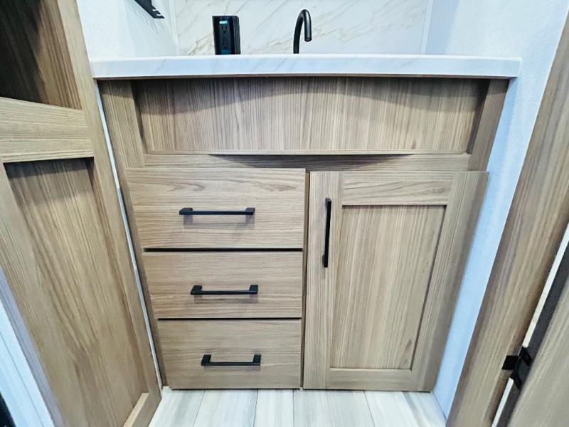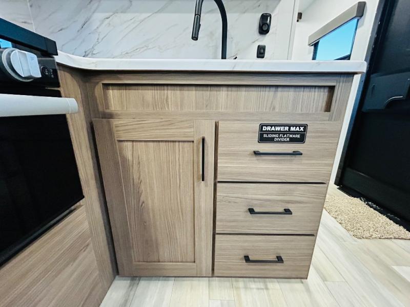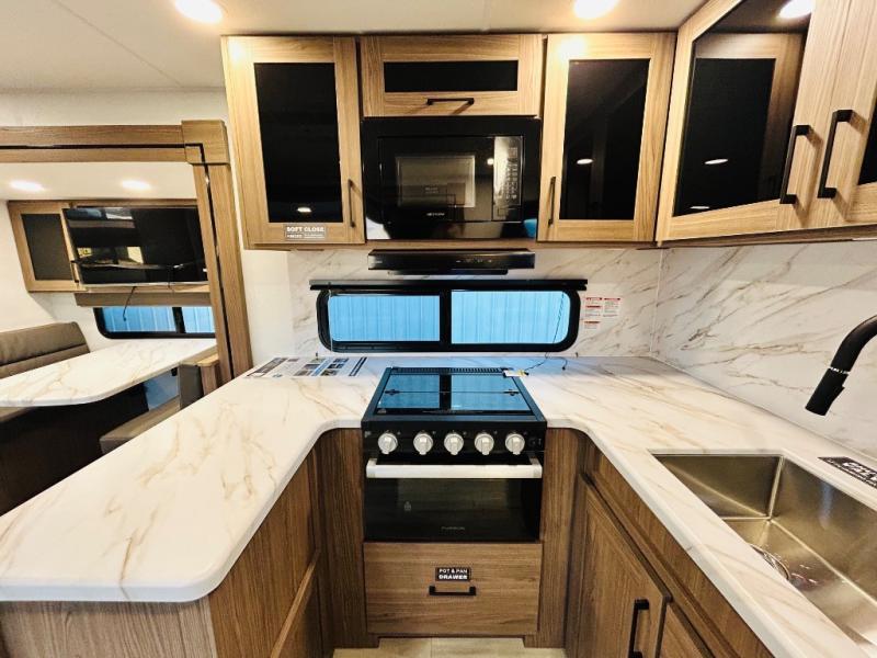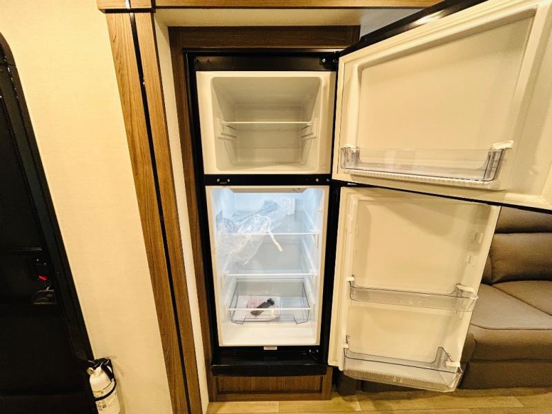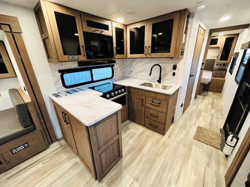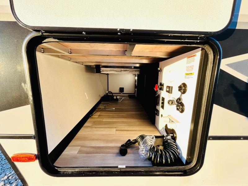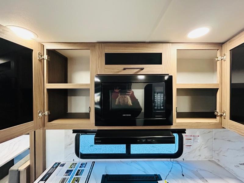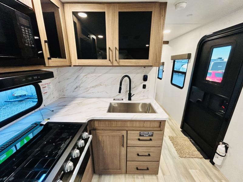 Enjoy glamping in this spacious travel trailer for eight! Your guests or the kids will love the rear bunkhouse with 40" x 72" bunk beds across from a third bunk with a cube sofa below, and the slide out will make this space more open. The slide out also includes the booth dinette in the main living area, which is across from the sofa slide out. The chef will love cooking in this Delta kitchen with generous counter space, a 10 cu. ft. 12V refrigerator, plus pull-out pantry trays for dry goods and snacks. The full bath with a 30" x 36" shower and a soft close porcelain foot flush toilet will allow you to fresh up each day without having to use the camp's facilities. And don't overlook the front private bedroom with a queen bed, wardrobe nightstands, a third wardrobe plus overhead storage; now nothing has to get left behind!