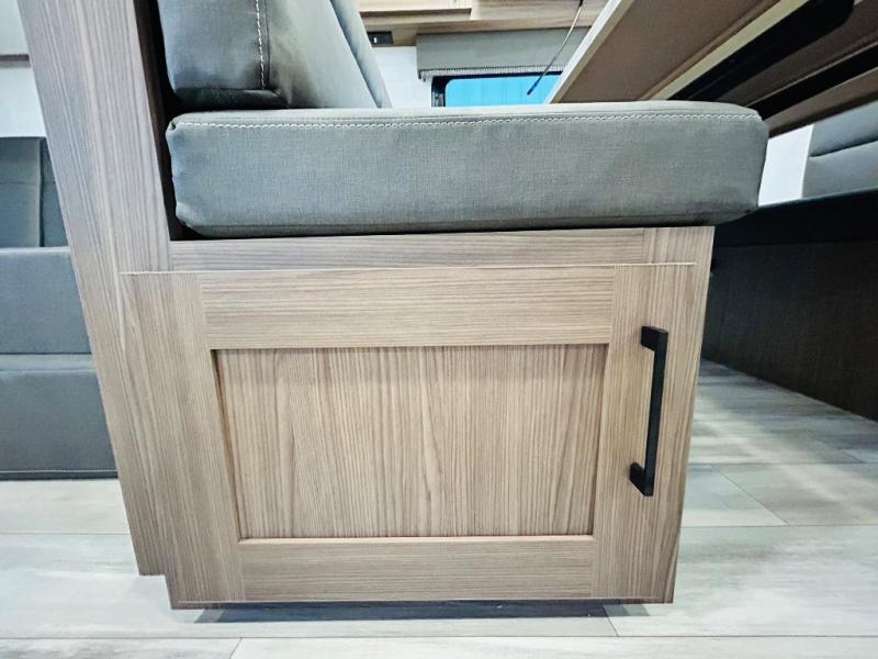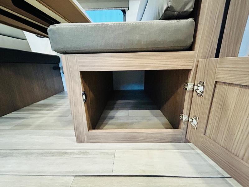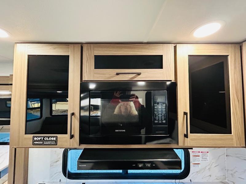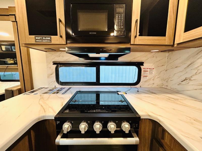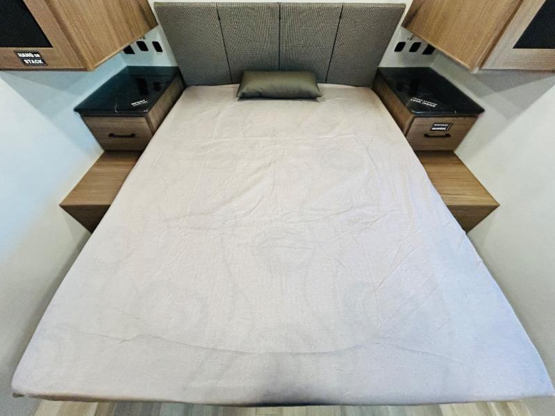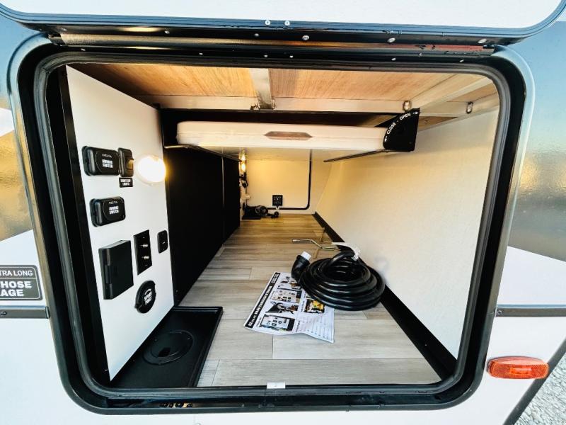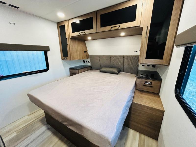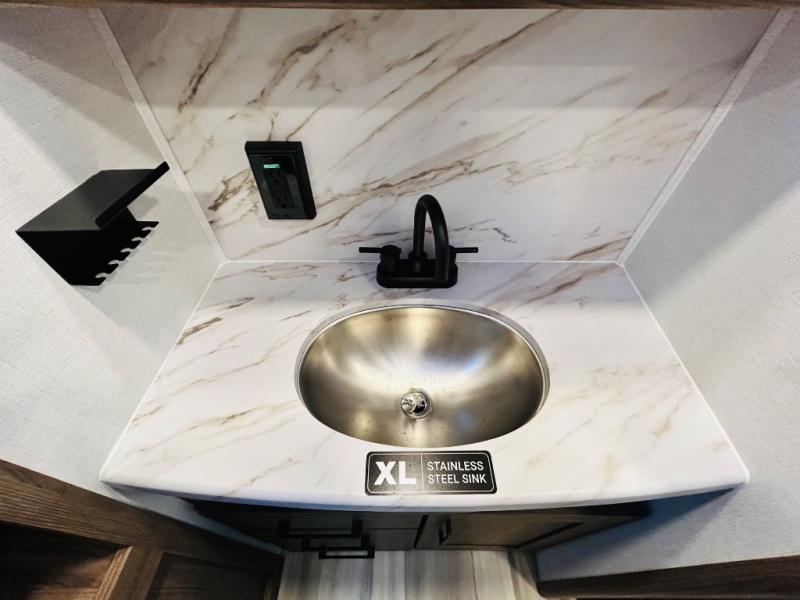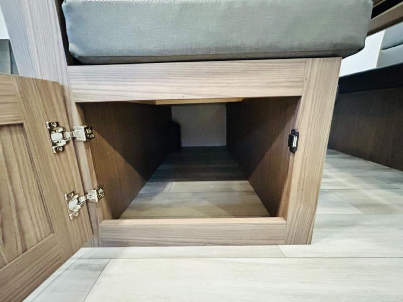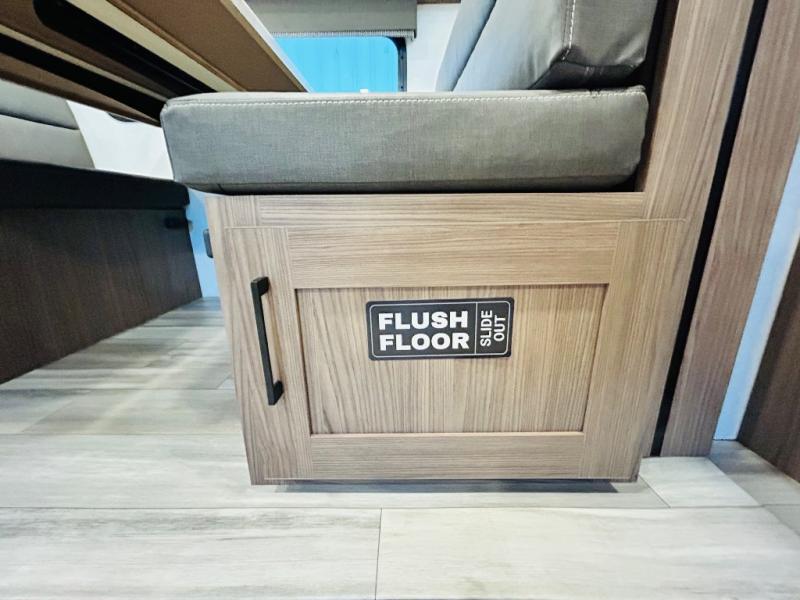 Enjoy glamping in this spacious travel trailer for eight! Your guests or the kids will love the rear bunkhouse with 40" x 72" bunk beds across from a third bunk with a cube sofa below, and the slide out will make this space more open. The slide out also includes the booth dinette in the main living area, which is across from the sofa slide out. The chef will love cooking in this Delta kitchen with generous counter space, a 10 cu. ft. 12V refrigerator, plus pull-out pantry trays for dry goods and snacks. The full bath with a 30" x 36" shower and a soft close porcelain foot flush toilet will allow you to fresh up each day without having to use the camp's facilities. And don't overlook the front private bedroom with a queen bed, wardrobe nightstands, a third wardrobe plus overhead storage; now nothing has to get left behind!