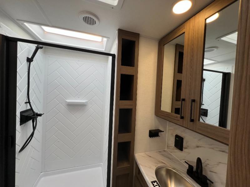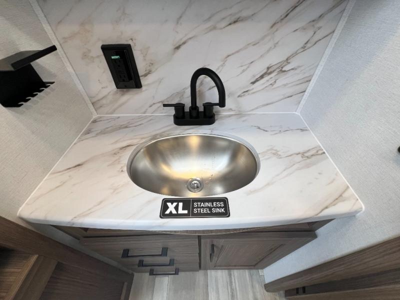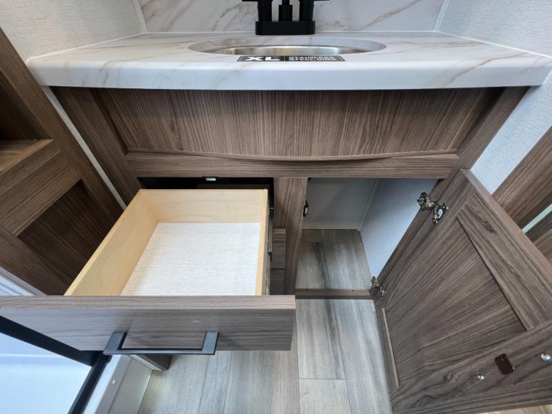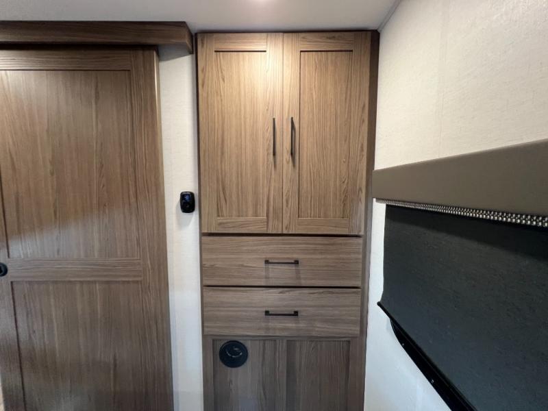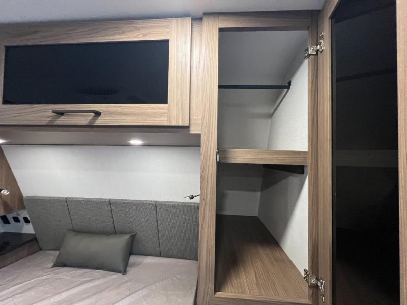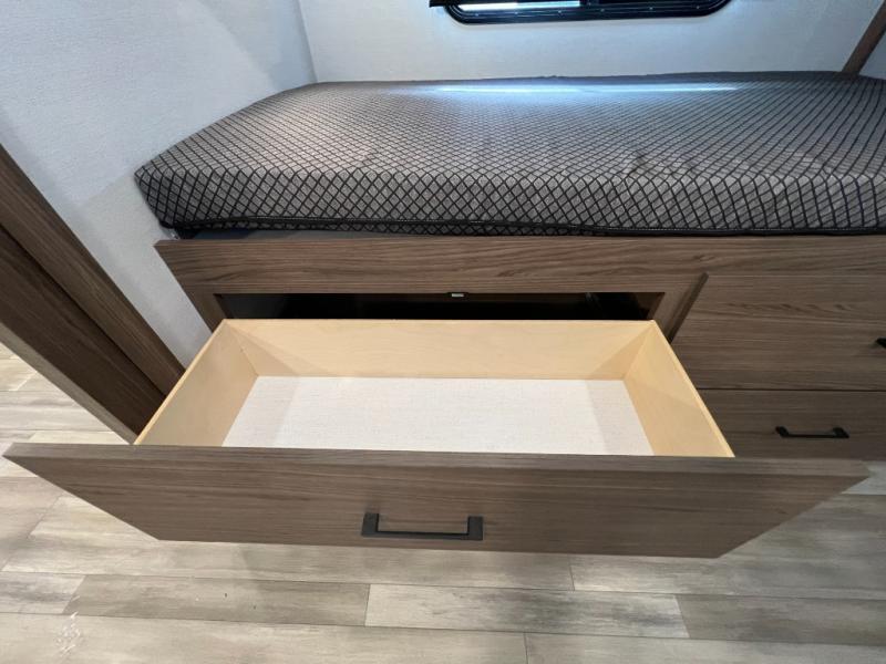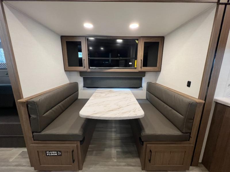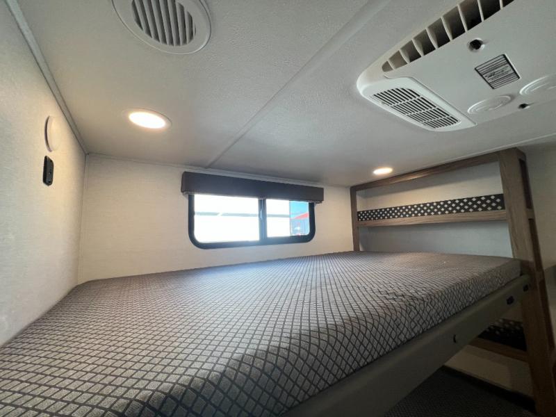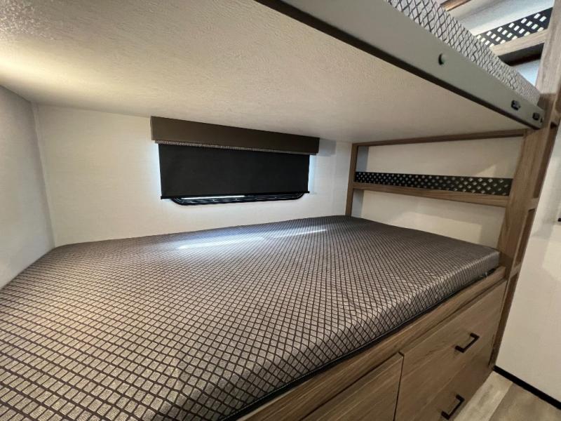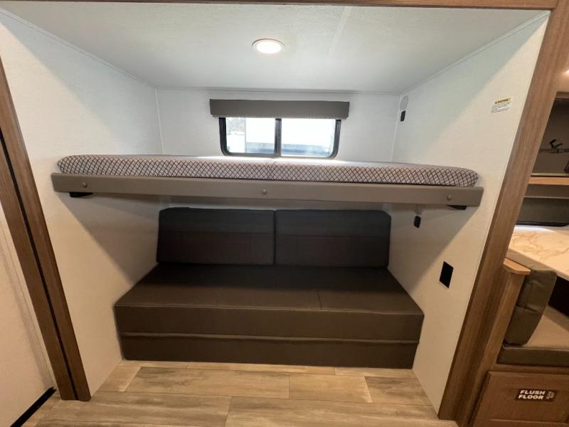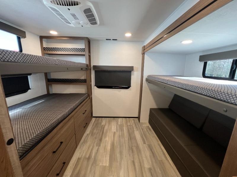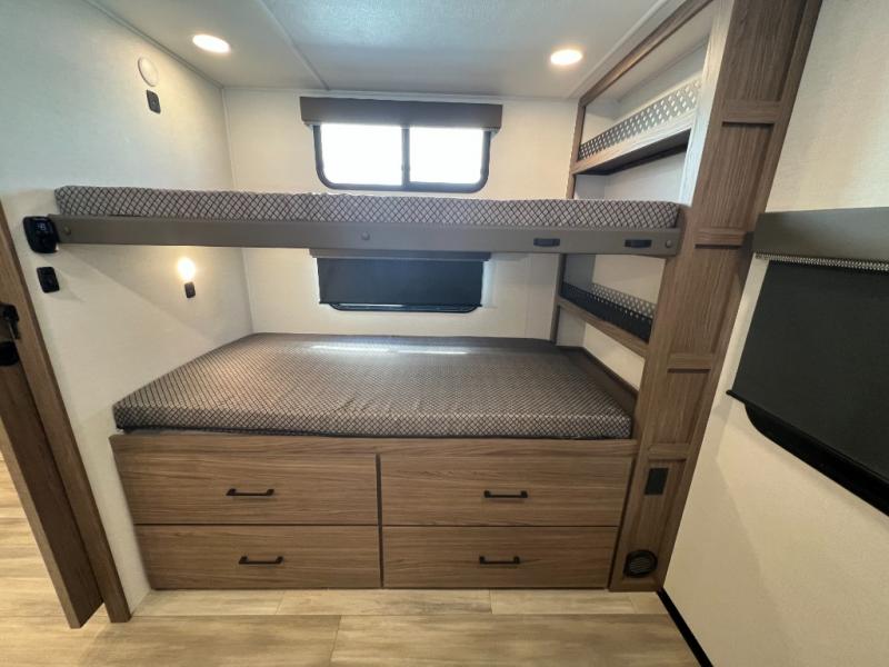 Enjoy glamping in this spacious travel trailer for eight! Your guests or the kids will love the rear bunkhouse with 40" x 72" bunk beds across from a third bunk with a cube sofa below, and the slide out will make this space more open. The slide out also includes the booth dinette in the main living area, which is across from the sofa slide out. The chef will love cooking in this Delta kitchen with generous counter space, a 10 cu. ft. 12V refrigerator, plus pull-out pantry trays for dry goods and snacks. The full bath with a 30" x 36" shower and a soft close porcelain foot flush toilet will allow you to fresh up each day without having to use the camp's facilities. And don't overlook the front private bedroom with a queen bed, wardrobe nightstands, a third wardrobe plus overhead storage; now nothing has to get left behind!
