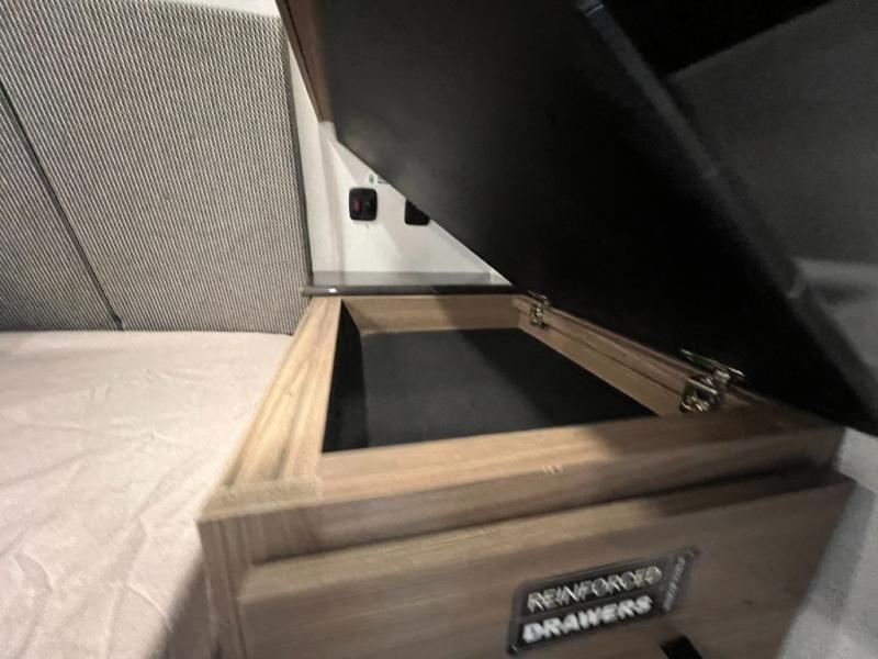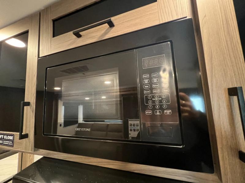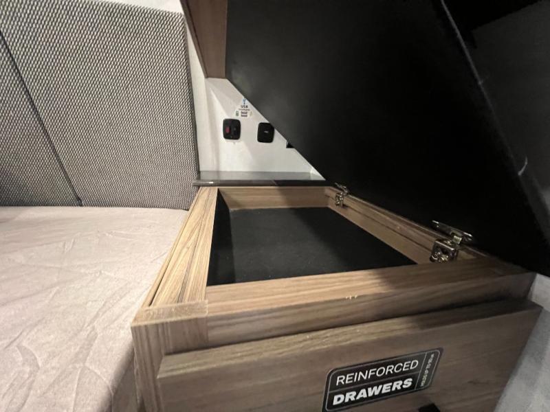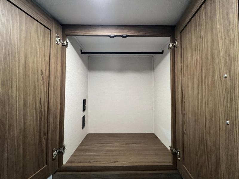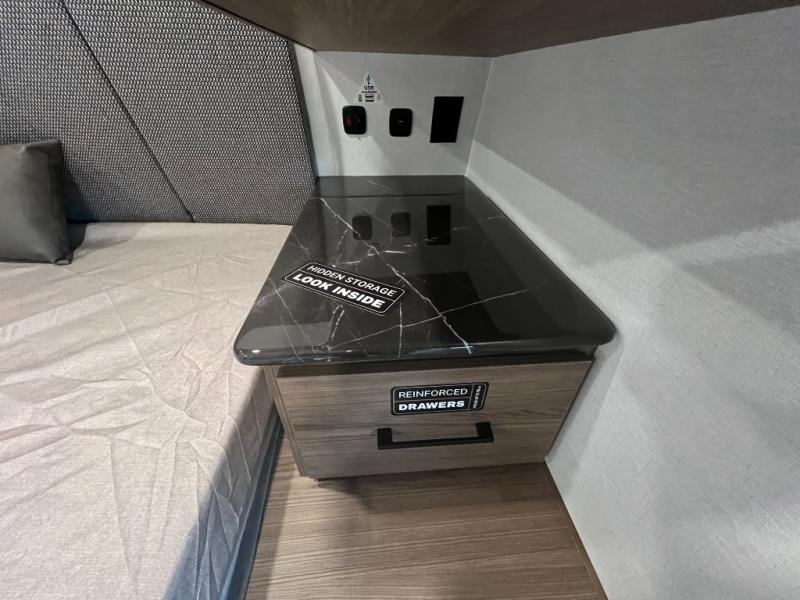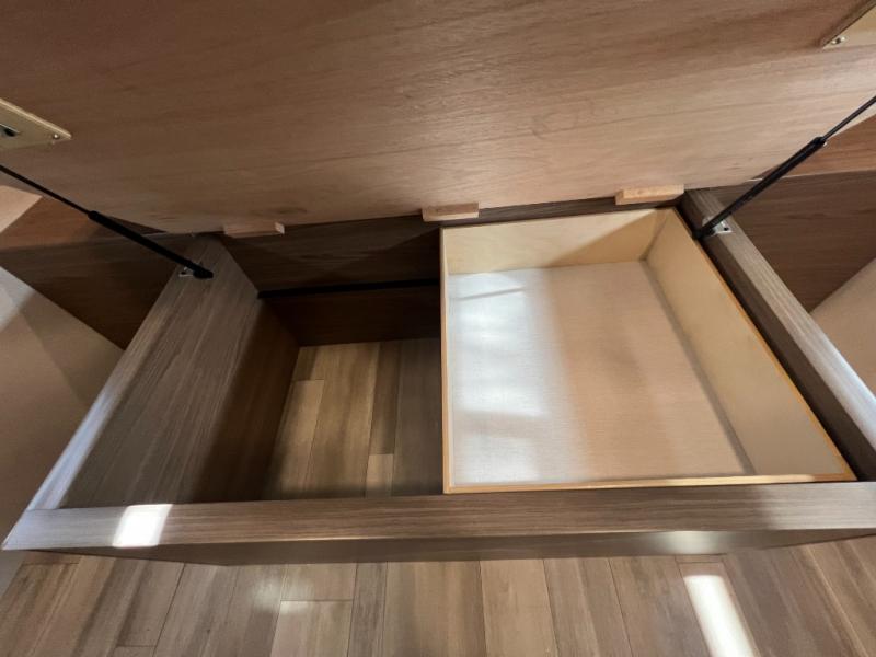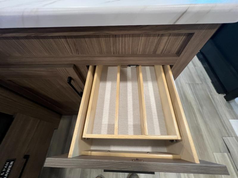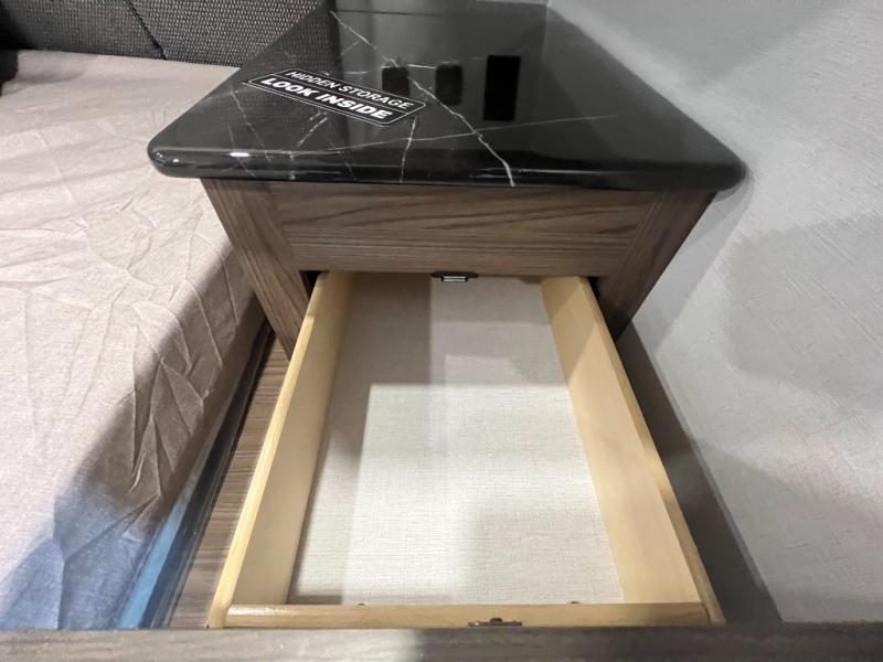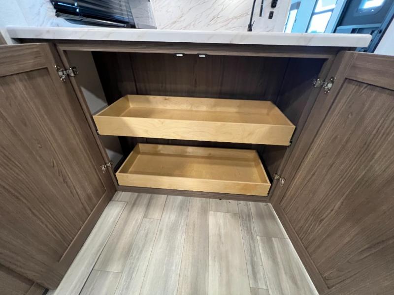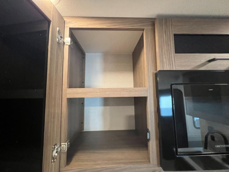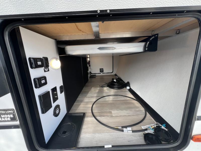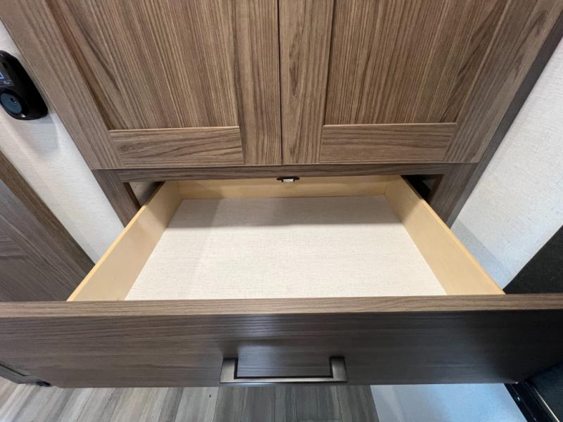 Enjoy glamping in this spacious travel trailer for eight! Your guests or the kids will love the rear bunkhouse with 40" x 72" bunk beds across from a third bunk with a cube sofa below, and the slide out will make this space more open. The slide out also includes the booth dinette in the main living area, which is across from the sofa slide out. The chef will love cooking in this Delta kitchen with generous counter space, a 10 cu. ft. 12V refrigerator, plus pull-out pantry trays for dry goods and snacks. The full bath with a 30" x 36" shower and a soft close porcelain foot flush toilet will allow you to fresh up each day without having to use the camp's facilities. And don't overlook the front private bedroom with a queen bed, wardrobe nightstands, a third wardrobe plus overhead storage; now nothing has to get left behind!