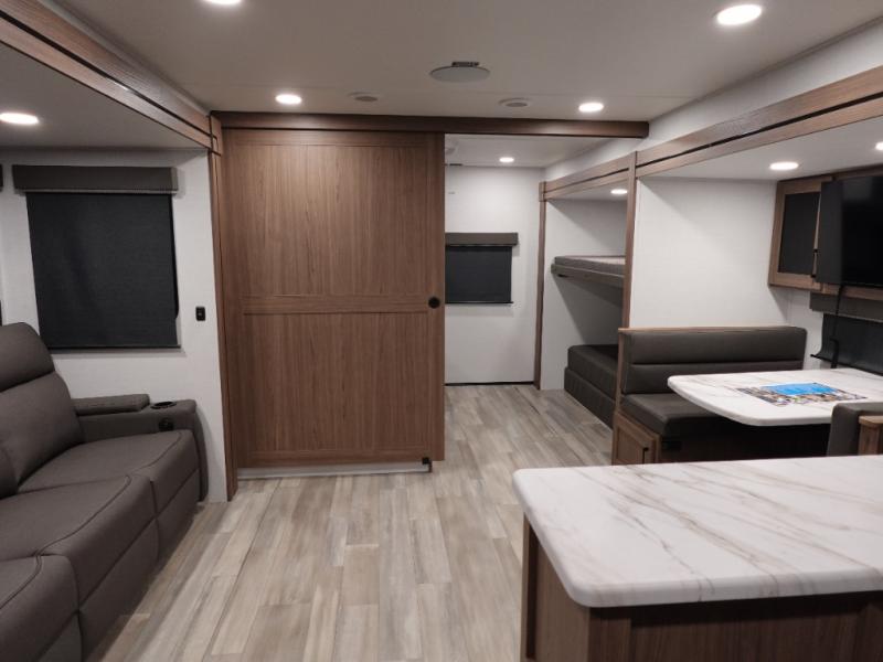 Enjoy glamping in this spacious travel trailer for eight! Your guests or the kids will love the rear bunkhouse with 40" x 72" bunk beds across from a third bunk with a cube sofa below, and the slide out will make this space more open. The slide out also includes the booth dinette in the main living area, which is across from the sofa slide out. The chef will love cooking in this Delta kitchen with generous counter space, a 10 cu. ft. 12V refrigerator, plus pull-out pantry trays for dry goods and snacks. The full bath with a 30" x 36" shower and a soft close porcelain foot flush toilet will allow you to fresh up each day without having to use the camp's facilities. And don't overlook the front private bedroom with a queen bed, wardrobe nightstands, a third wardrobe plus overhead storage; now nothing has to get left behind!