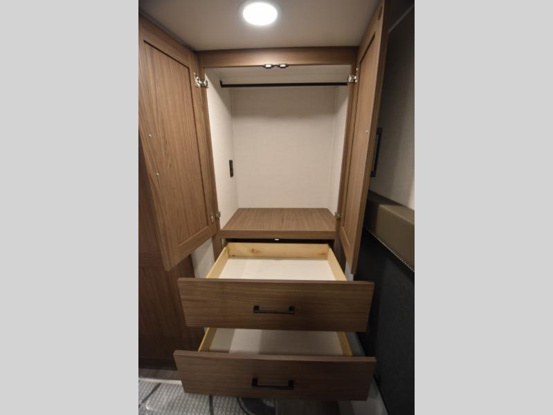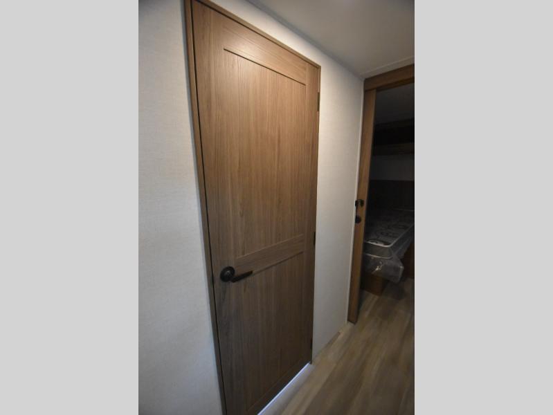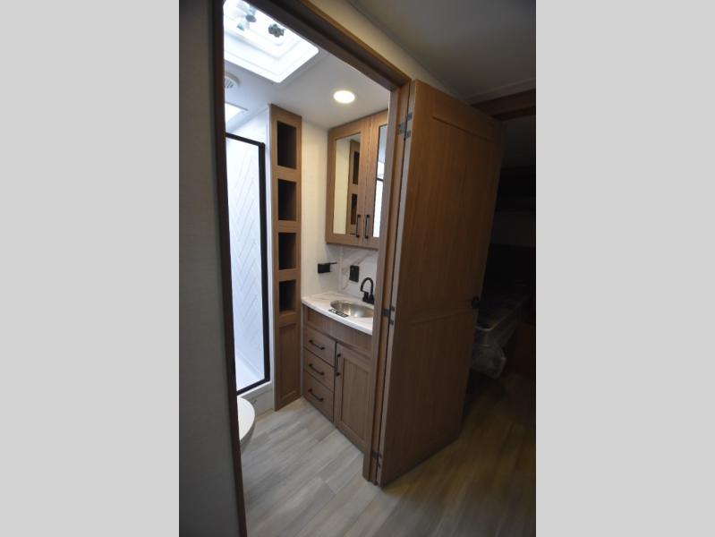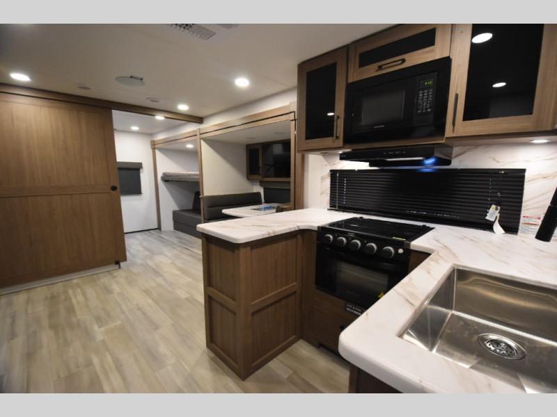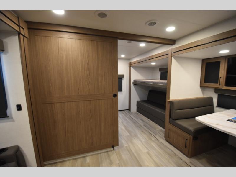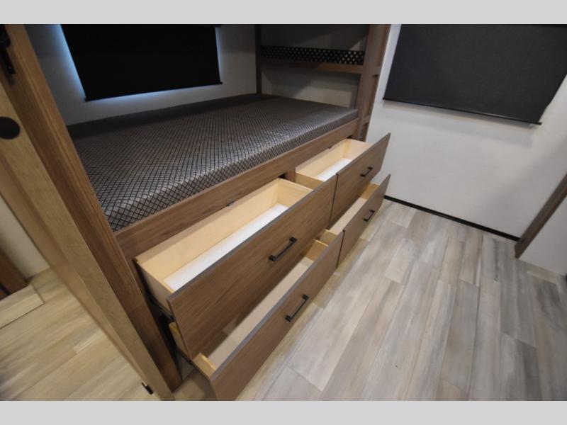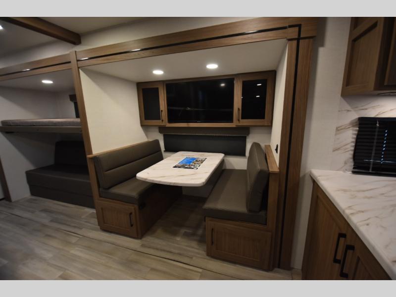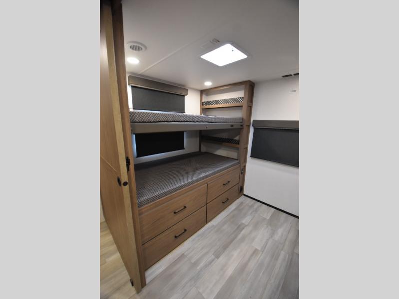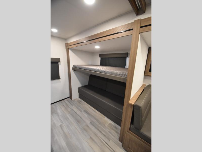 Enjoy glamping in this spacious travel trailer for eight! Your guests or the kids will love the rear bunkhouse with 40" x 72" bunk beds across from a third bunk with a cube sofa below, and the slide out will make this space more open. The slide out also includes the booth dinette in the main living area, which is across from the sofa slide out. The chef will love cooking in this Delta kitchen with generous counter space, a 10 cu. ft. 12V refrigerator, plus pull-out pantry trays for dry goods and snacks. The full bath with a 30" x 36" shower and a soft close porcelain foot flush toilet will allow you to fresh up each day without having to use the camp's facilities. And don't overlook the front private bedroom with a queen bed, wardrobe nightstands, a third wardrobe plus overhead storage; now nothing has to get left behind!