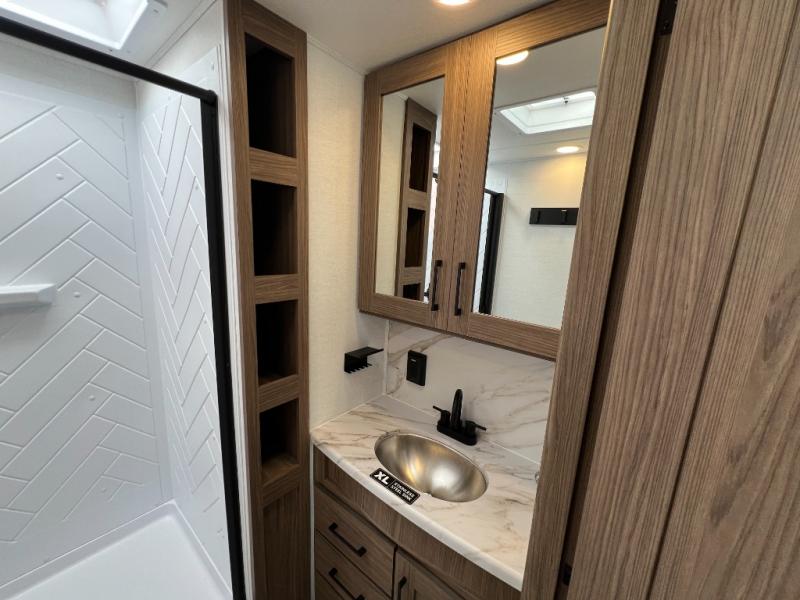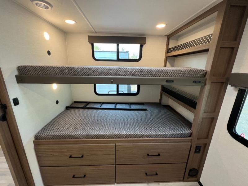 Enjoy glamping in this spacious travel trailer for eight! Your guests or the kids will love the rear bunkhouse with 40" x 72" bunk beds across from a third bunk with a cube sofa below, and the slide out will make this space more open. The slide out also includes the booth dinette in the main living area, which is across from the sofa slide out. The chef will love cooking in this Delta kitchen with generous counter space, a 10 cu. ft. 12V refrigerator, plus pull-out pantry trays for dry goods and snacks. The full bath with a 30" x 36" shower and a soft close porcelain foot flush toilet will allow you to fresh up each day without having to use the camp's facilities. And don't overlook the front private bedroom with a queen bed, wardrobe nightstands, a third wardrobe plus overhead storage; now nothing has to get left behind!