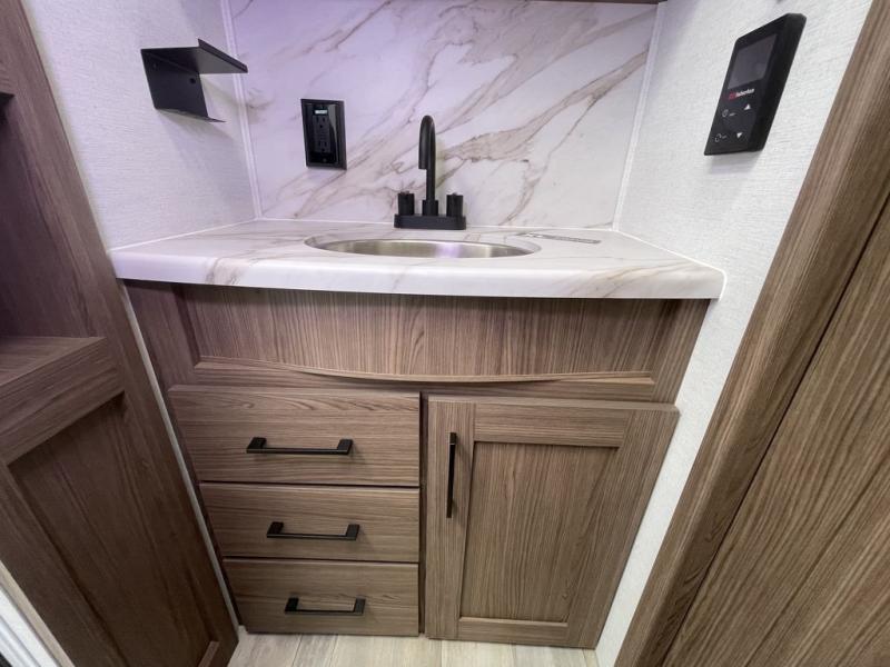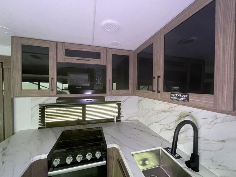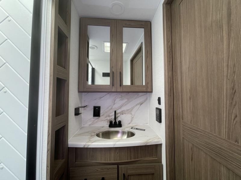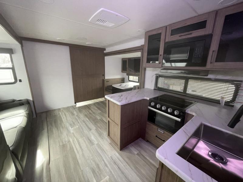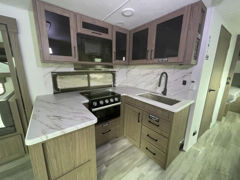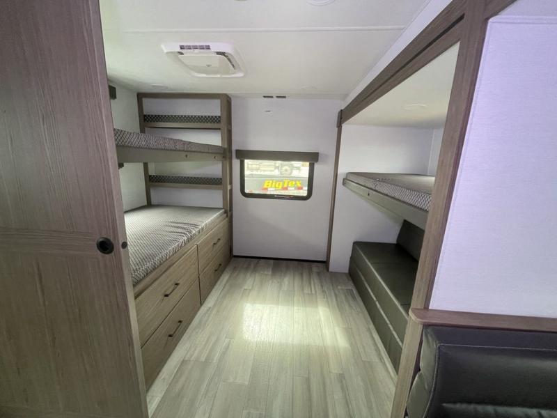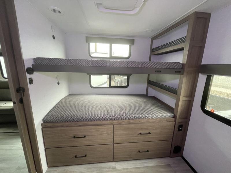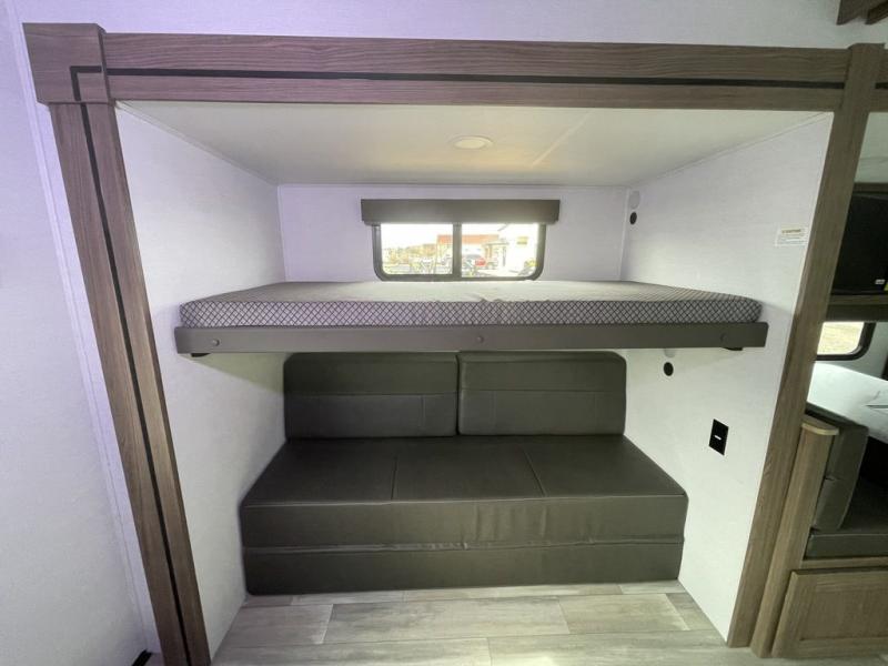 Enjoy glamping in this spacious travel trailer for eight! Your guests or the kids will love the rear bunkhouse with 40" x 72" bunk beds across from a third bunk with a cube sofa below, and the slide out will make this space more open. The slide out also includes the booth dinette in the main living area, which is across from the sofa slide out. The chef will love cooking in this Delta kitchen with generous counter space, a 10 cu. ft. 12V refrigerator, plus pull-out pantry trays for dry goods and snacks. The full bath with a 30" x 36" shower and a soft close porcelain foot flush toilet will allow you to fresh up each day without having to use the camp's facilities. And don't overlook the front private bedroom with a queen bed, wardrobe nightstands, a third wardrobe plus overhead storage; now nothing has to get left behind!