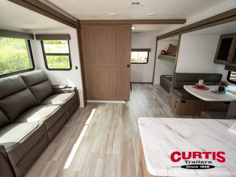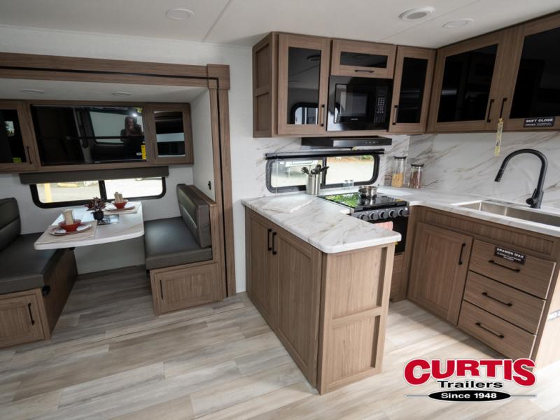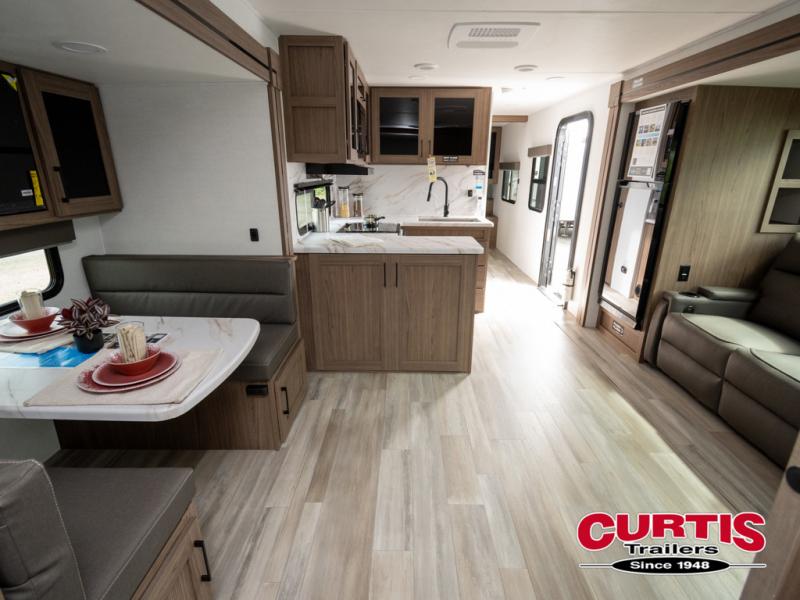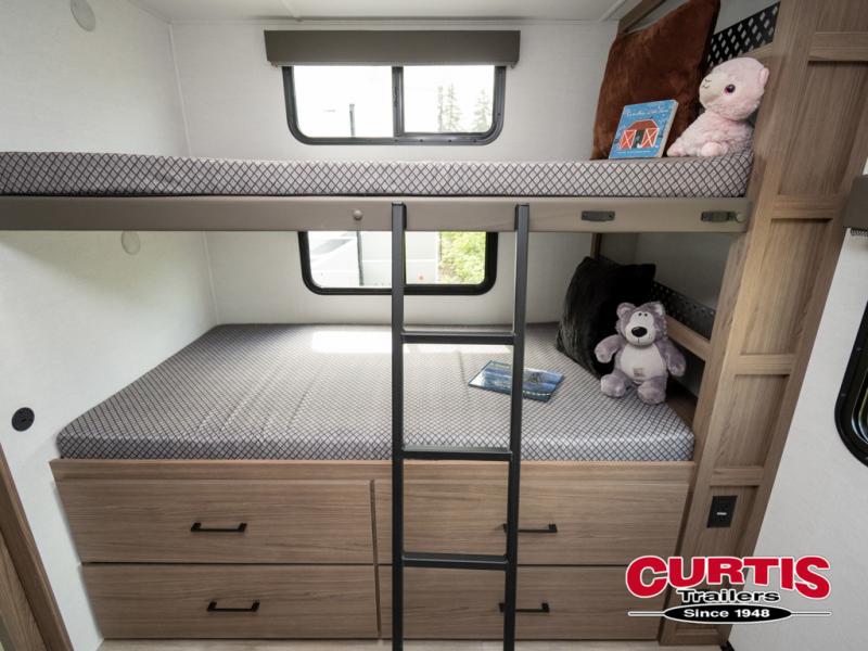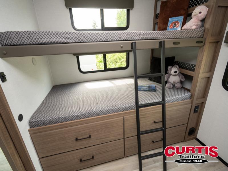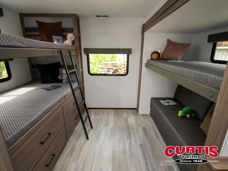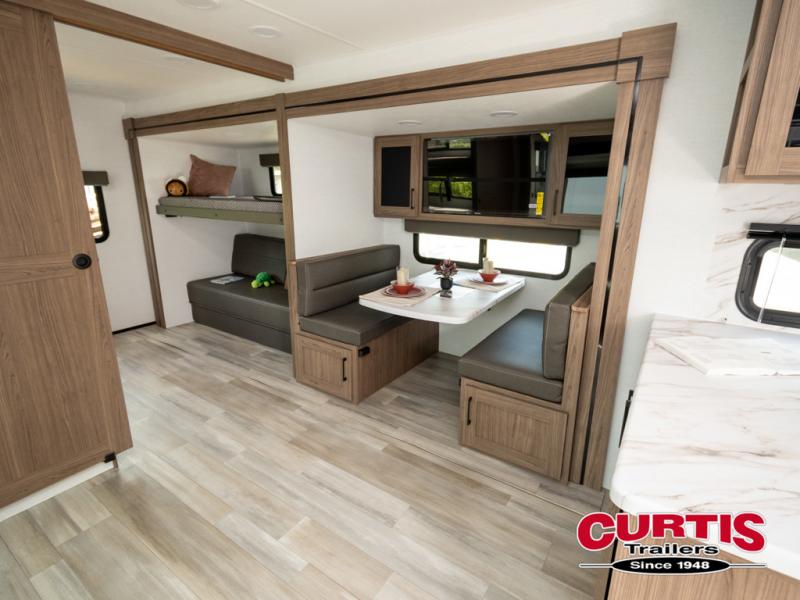 Enjoy glamping in this spacious travel trailer for eight! Your guests or the kids will love the rear bunkhouse with 40" x 72" bunk beds across from a third bunk with a cube sofa below, and the slide out will make this space more open. The slide out also includes the booth dinette in the main living area, which is across from the sofa slide out. The chef will love cooking in this Delta kitchen with generous counter space, a 10 cu. ft. 12V refrigerator, plus pull-out pantry trays for dry goods and snacks. The full bath with a 30" x 36" shower and a soft close porcelain foot flush toilet will allow you to fresh up each day without having to use the camp's facilities. And don't overlook the front private bedroom with a queen bed, wardrobe nightstands, a third wardrobe plus overhead storage; now nothing has to get left behind!