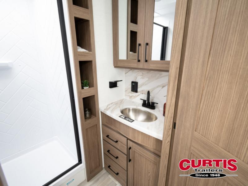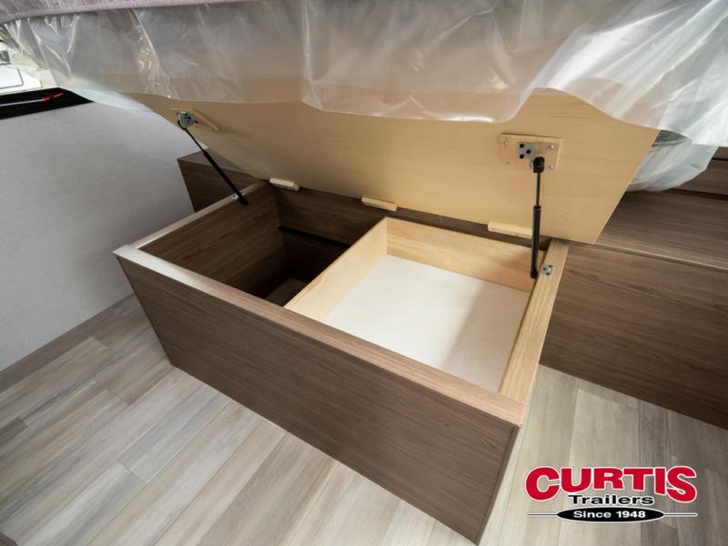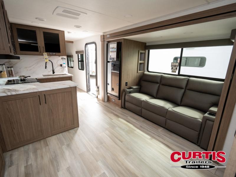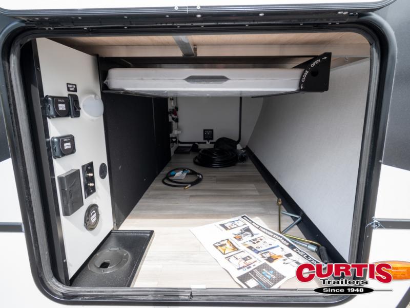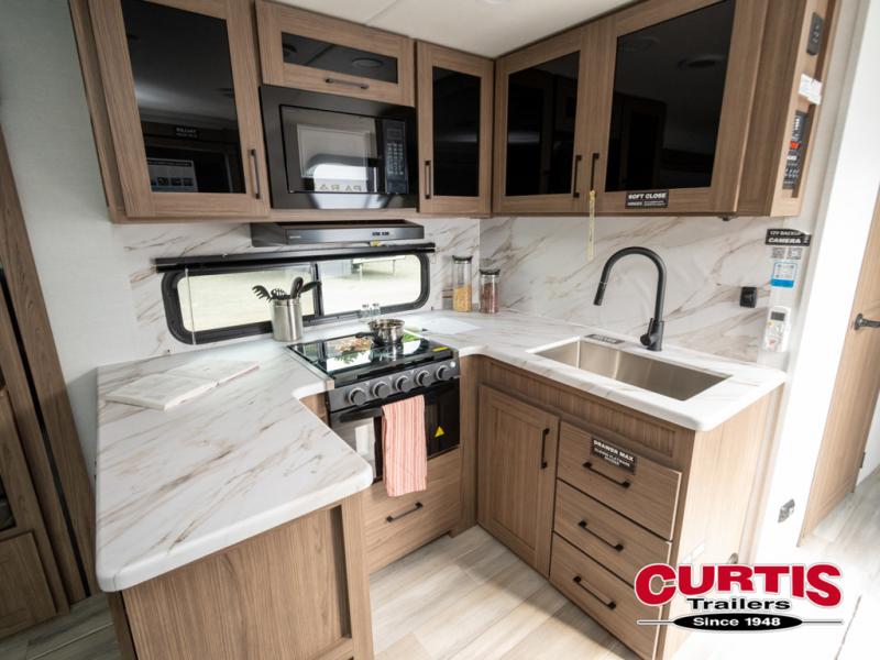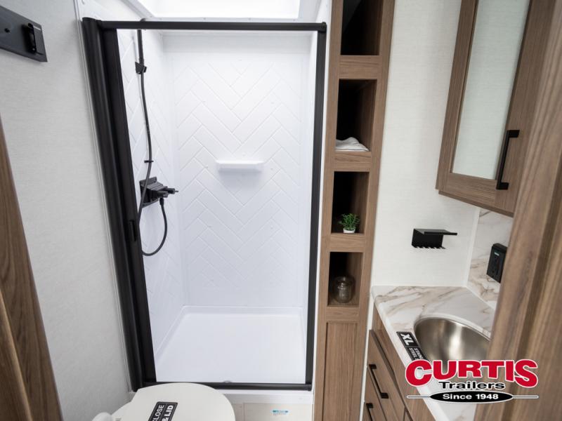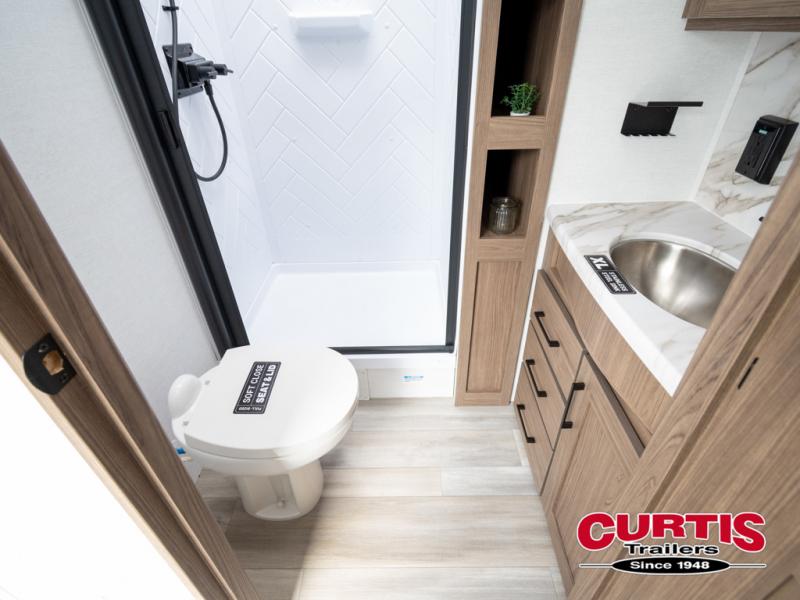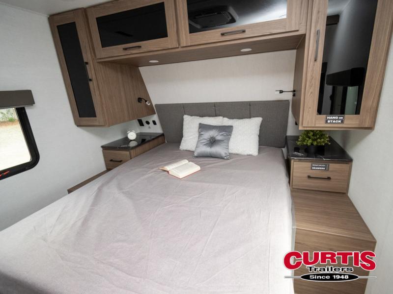 Enjoy glamping in this spacious travel trailer for eight! Your guests or the kids will love the rear bunkhouse with 40" x 72" bunk beds across from a third bunk with a cube sofa below, and the slide out will make this space more open. The slide out also includes the booth dinette in the main living area, which is across from the sofa slide out. The chef will love cooking in this Delta kitchen with generous counter space, a 10 cu. ft. 12V refrigerator, plus pull-out pantry trays for dry goods and snacks. The full bath with a 30" x 36" shower and a soft close porcelain foot flush toilet will allow you to fresh up each day without having to use the camp's facilities. And don't overlook the front private bedroom with a queen bed, wardrobe nightstands, a third wardrobe plus overhead storage; now nothing has to get left behind!