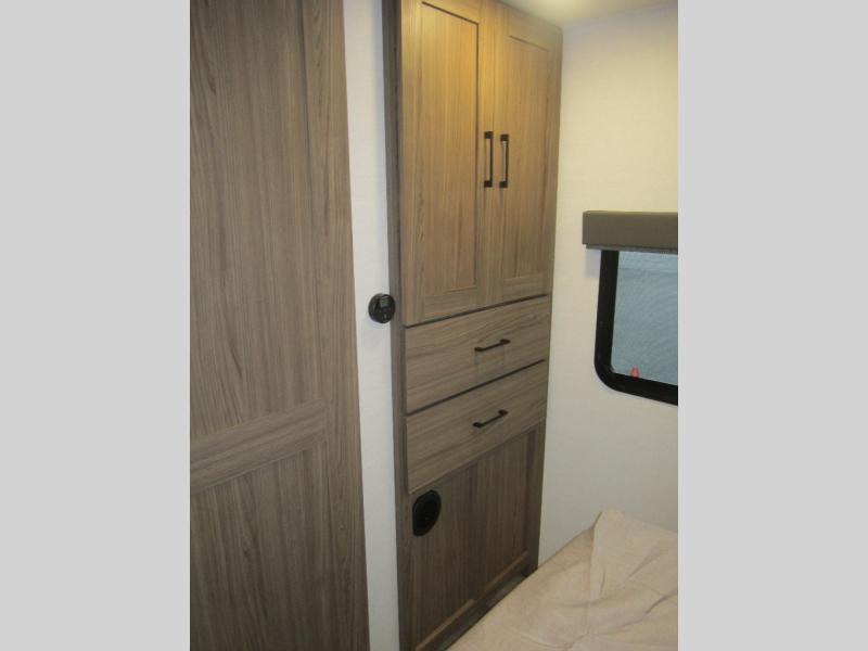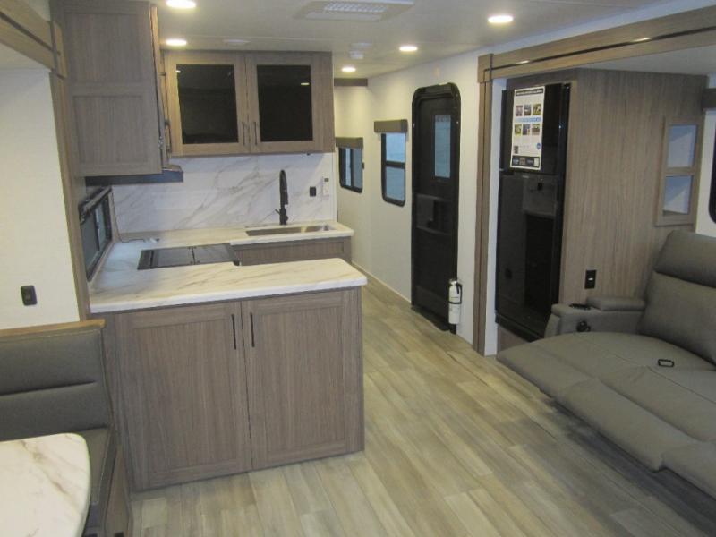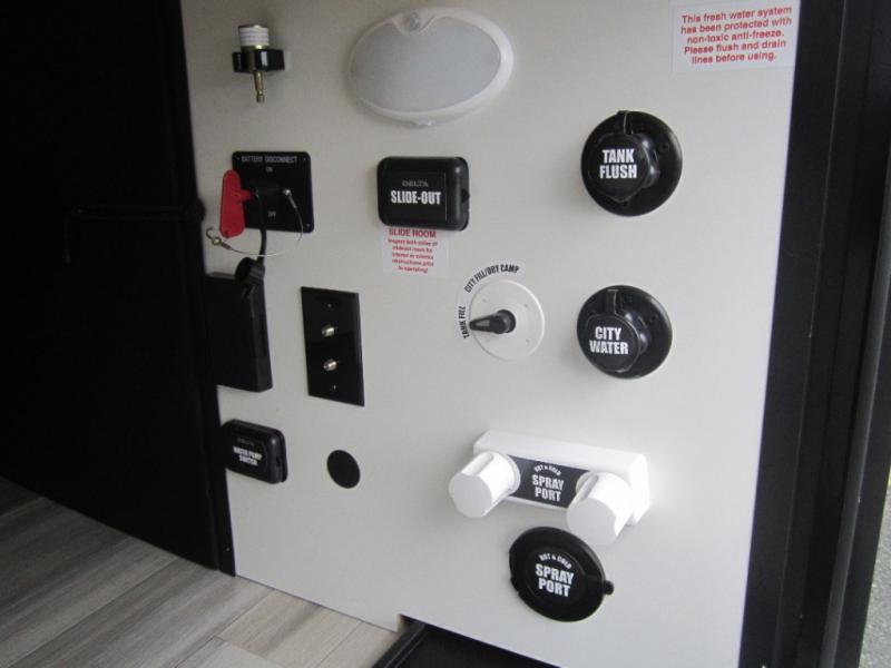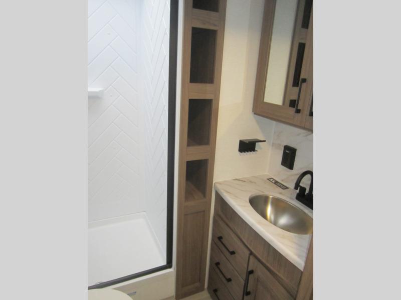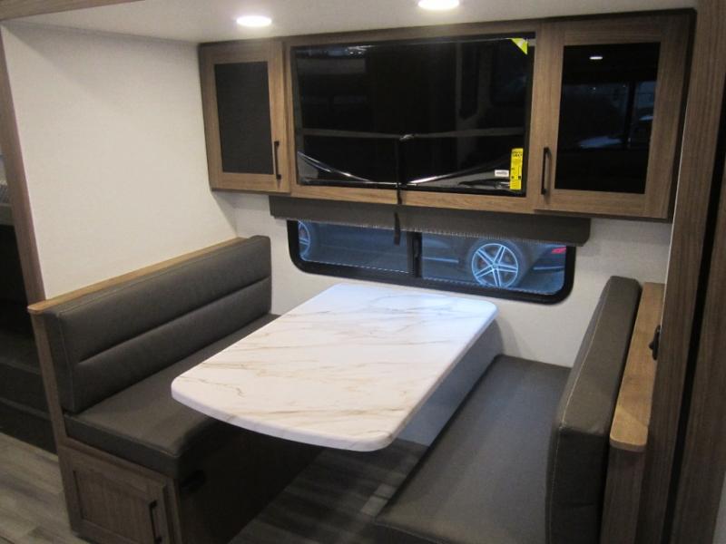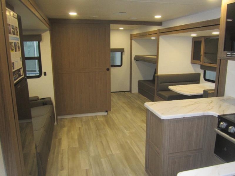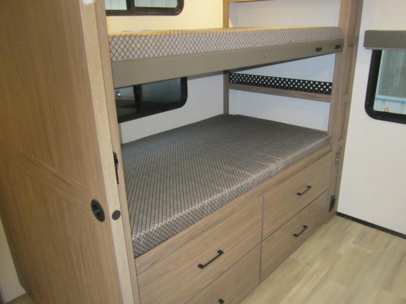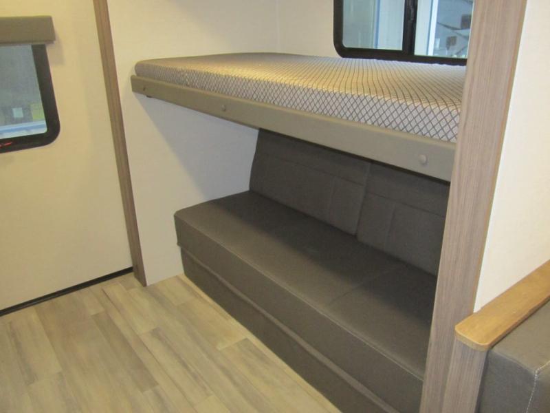 Enjoy glamping in this spacious travel trailer for eight! Your guests or the kids will love the rear bunkhouse with 40" x 72" bunk beds across from a third bunk with a cube sofa below, and the slide out will make this space more open. The slide out also includes the booth dinette in the main living area, which is across from the sofa slide out. The chef will love cooking in this Delta kitchen with generous counter space, a 10 cu. ft. 12V refrigerator, plus pull-out pantry trays for dry goods and snacks. The full bath with a 30" x 36" shower and a soft close porcelain foot flush toilet will allow you to fresh up each day without having to use the camp's facilities. And don't overlook the front private bedroom with a queen bed, wardrobe nightstands, a third wardrobe plus overhead storage; now nothing has to get left behind!