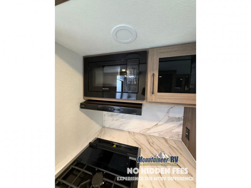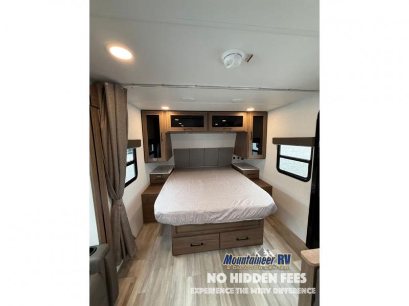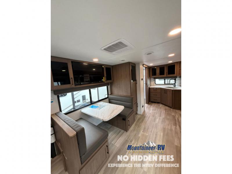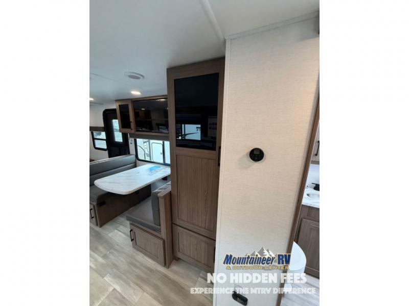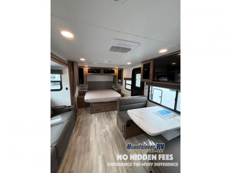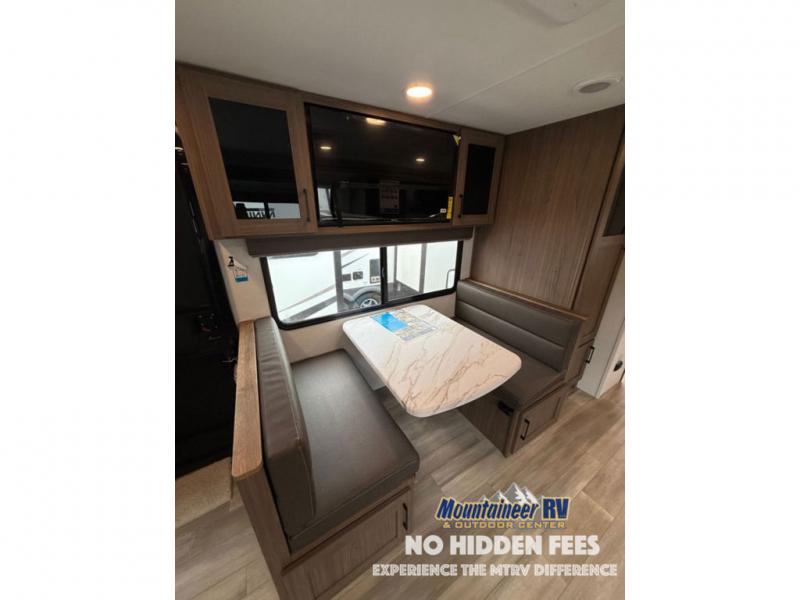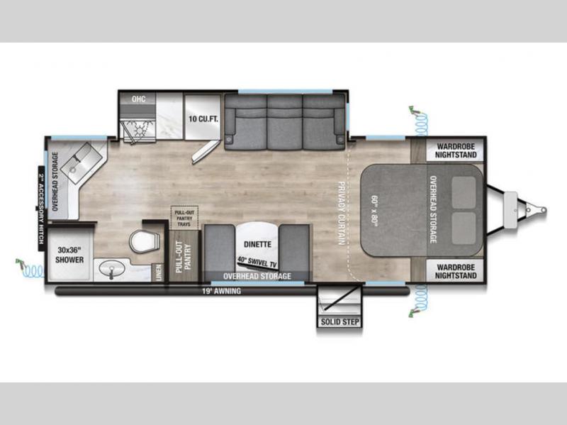 This travel trailer is perfect for three to four happy campers! You'll find a front bedroom with a queen-size bed, dual wardrobes and nightstands, plus a privacy curtain if you have someone staying over on the sofa. The booth dinette provides additional sleeping space when it's not being used to dine or play games at! A rear corner kitchen includes counter space to prep meals, a large sink, plus overhead storage for spices. After dinner, you can relax with a movie since there is a 40" swivel TV, or you can head outdoors to visit under the 19' patio awning!