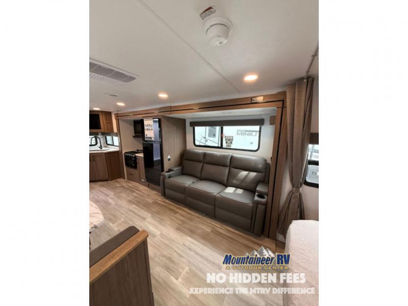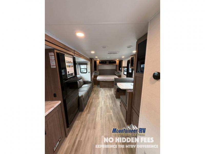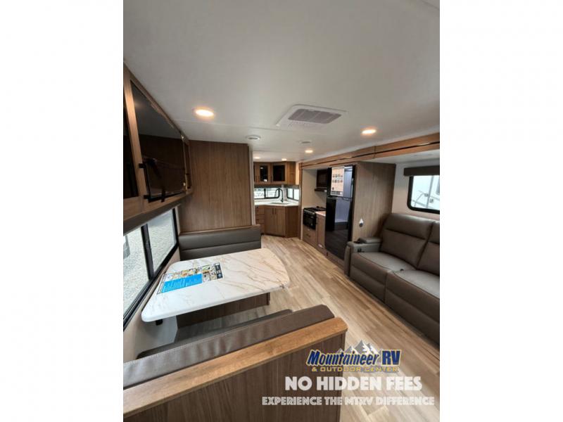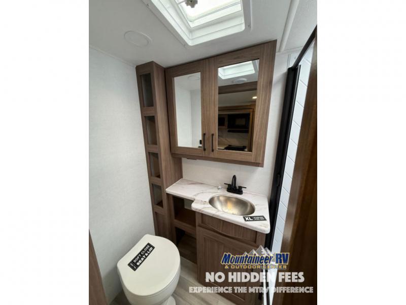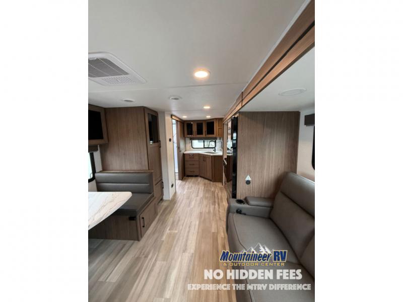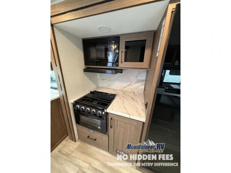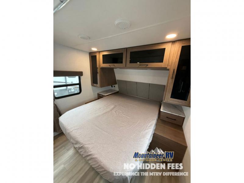 This travel trailer is perfect for three to four happy campers! You'll find a front bedroom with a queen-size bed, dual wardrobes and nightstands, plus a privacy curtain if you have someone staying over on the sofa. The booth dinette provides additional sleeping space when it's not being used to dine or play games at! A rear corner kitchen includes counter space to prep meals, a large sink, plus overhead storage for spices. After dinner, you can relax with a movie since there is a 40" swivel TV, or you can head outdoors to visit under the 19' patio awning!