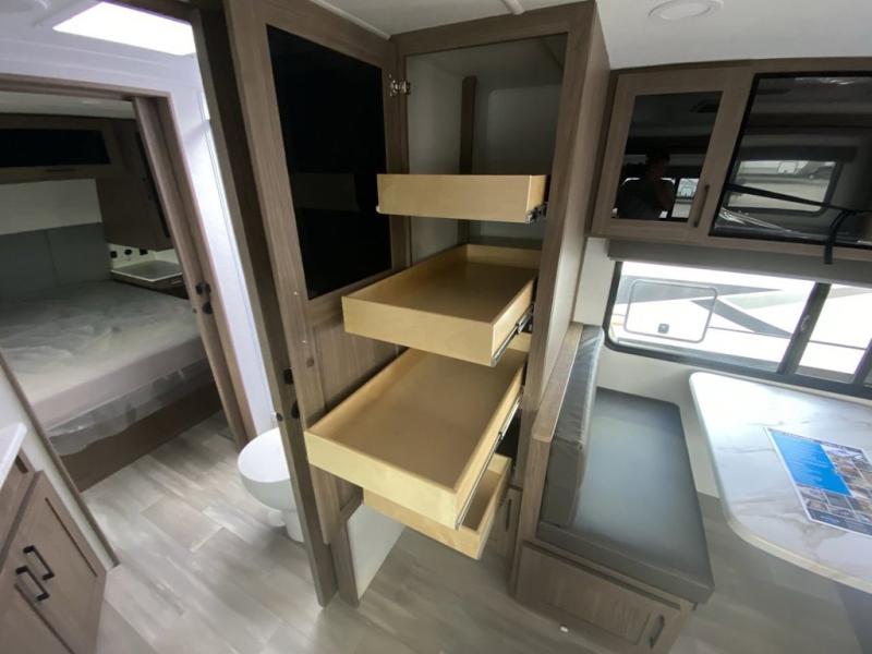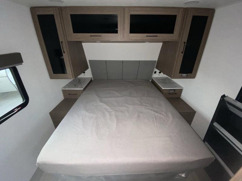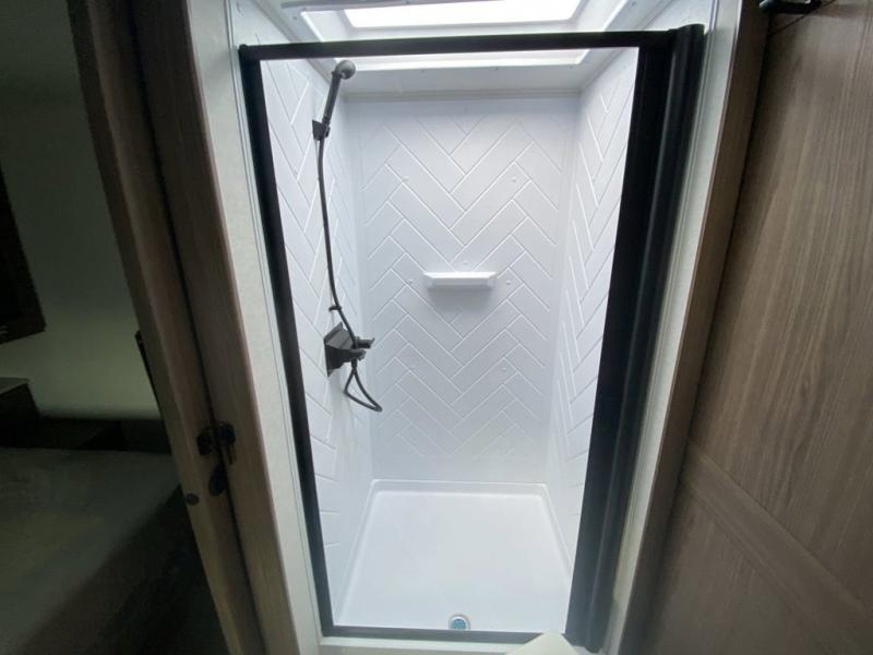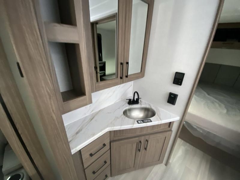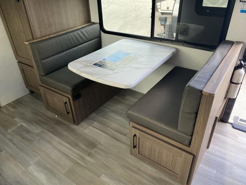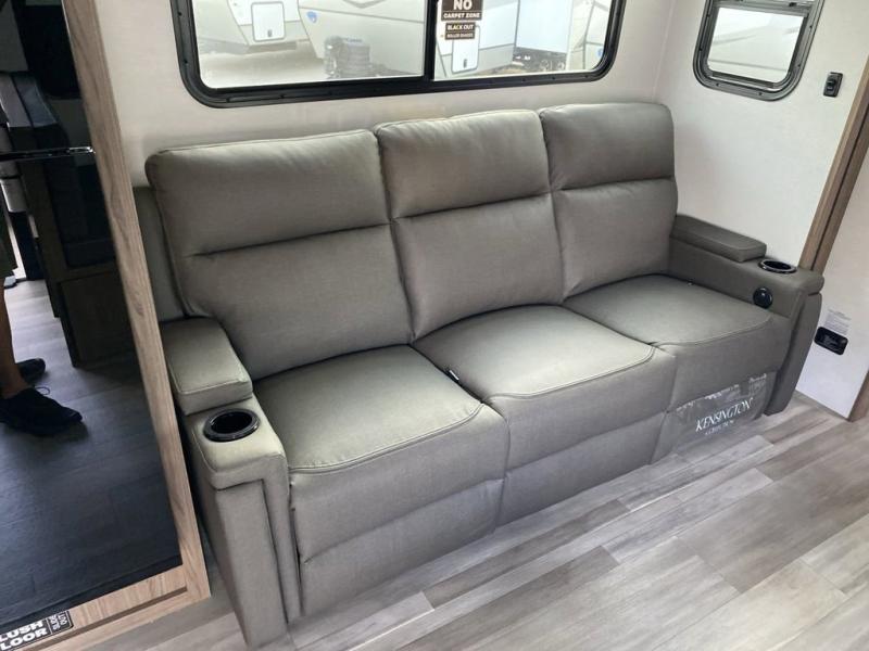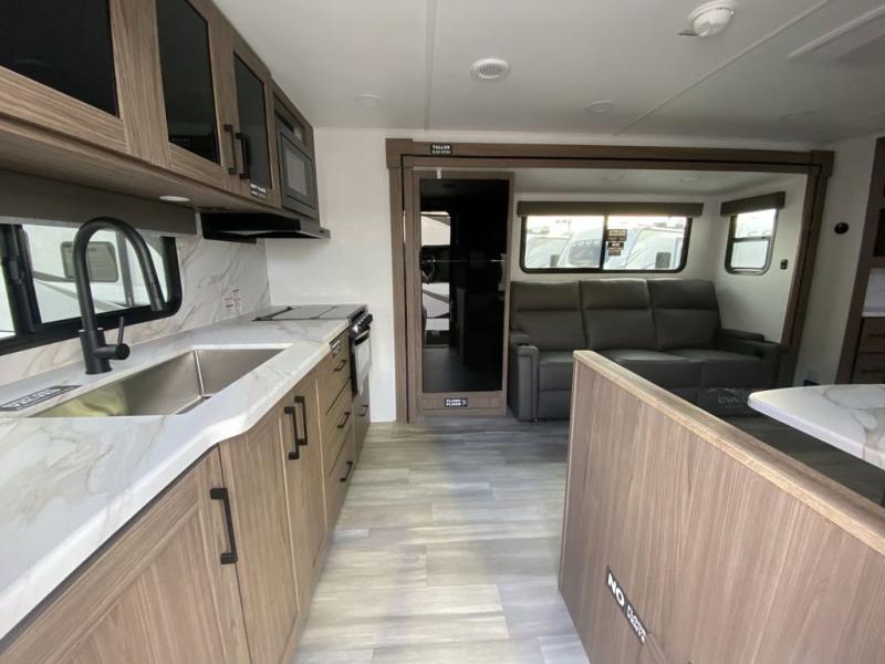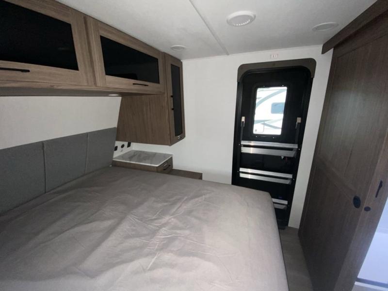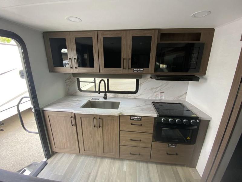You'll love camping in this rear kitchen travel trailer with generous counter space and overhead storage for spices, dishes, and more. You can dine each day at the booth dinette or relax on the sofa slide out, which will provide more floor space. The spacious walk-thru bath includes a 30" x 36" shower, toilet, and vanity so you can clean up each day. Head to the front master bedroom where you can sleep soundly on the walk-around queen bed with dual nightstands and wardrobes. The second entry door is also found in this room so you can slip out for an early morning run!