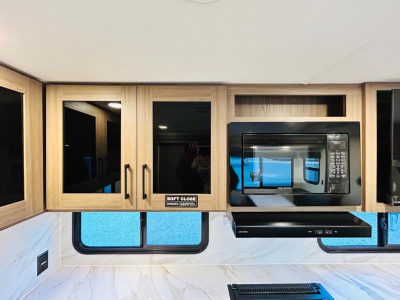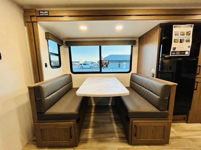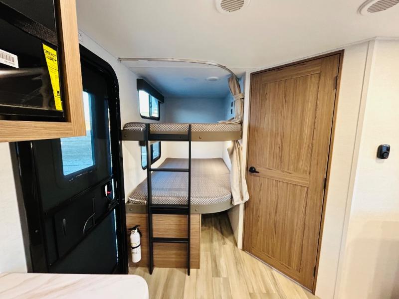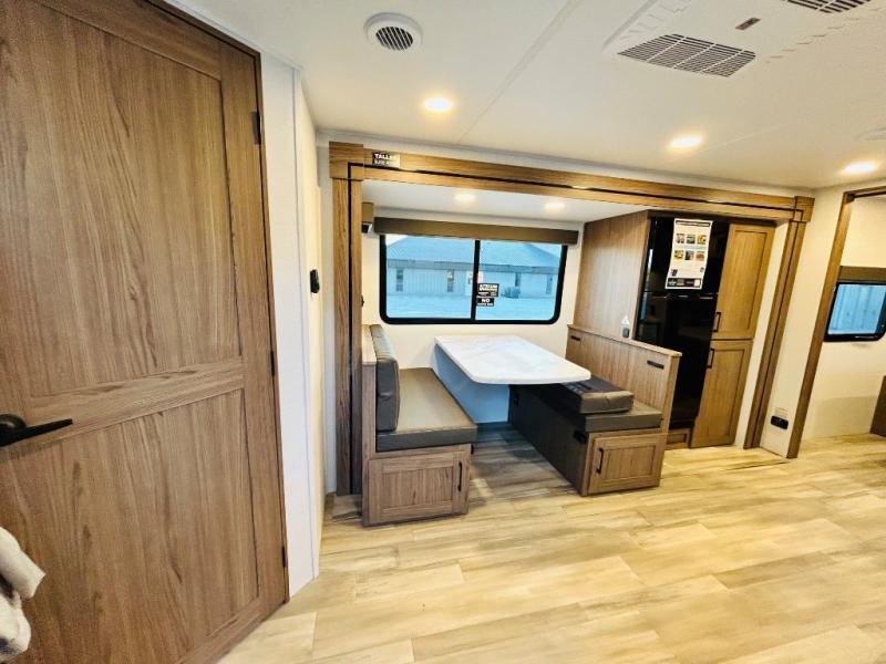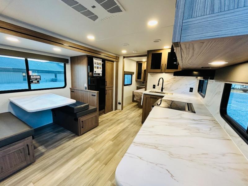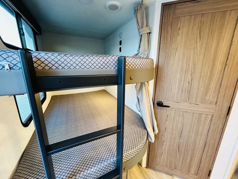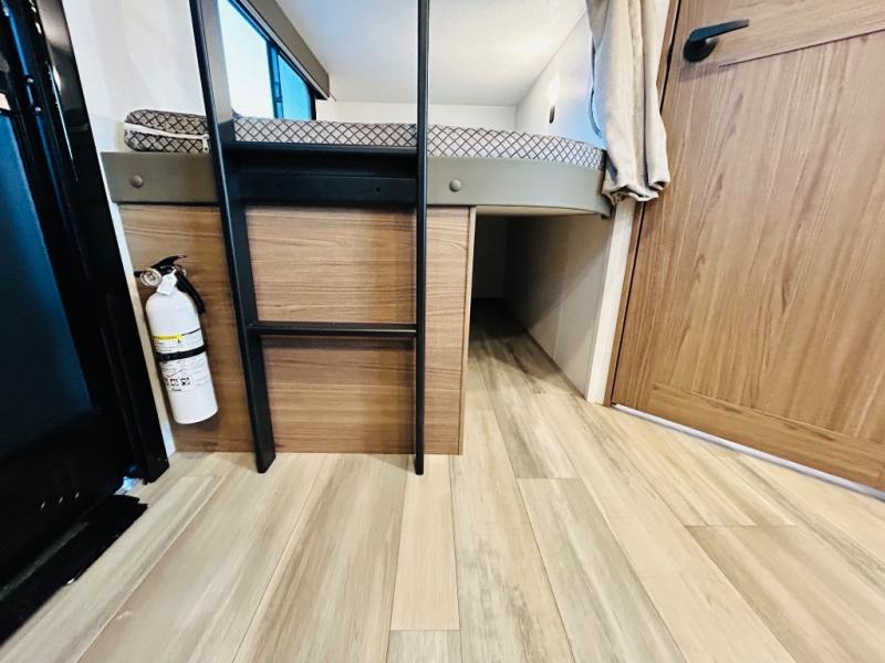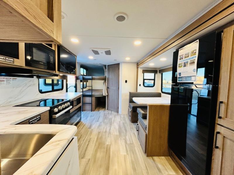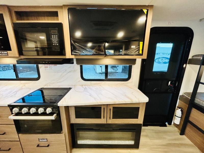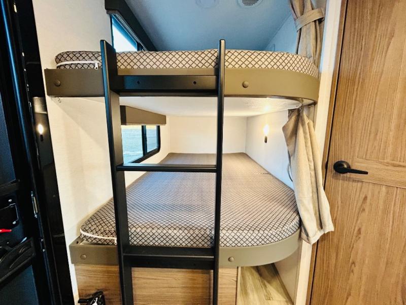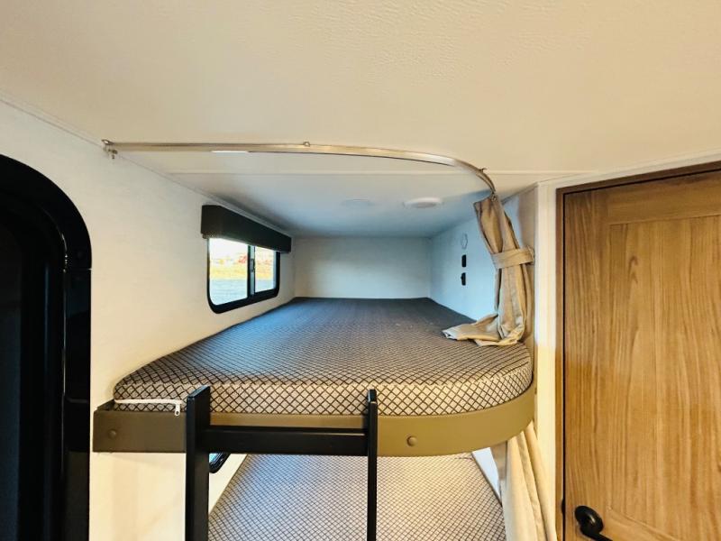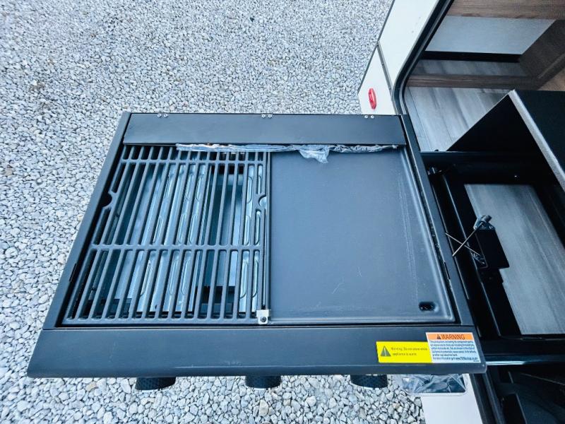 If you're looking for a trailer that can sleep more campers, this is the one! There are 46" x 74" bunks in the back right beside the full bath for easy nighttime use. You'll have your own bedroom up front, complete with a queen bed, dual wardrobe nightstands, and overhead storage. The large slide out in the main living area will provide your crew with plenty of space to dine at the booth dinette or just relax in front of the fireplace. There is a full kitchen inside, along with an exterior griddle/grill when you want to cook outdoors!