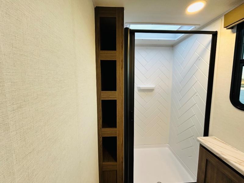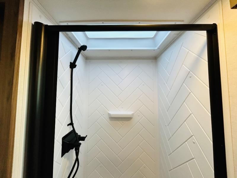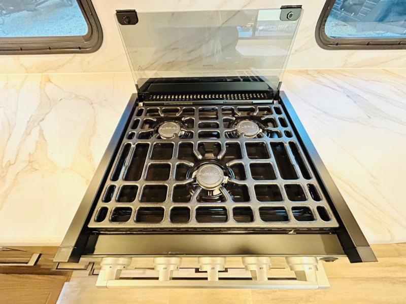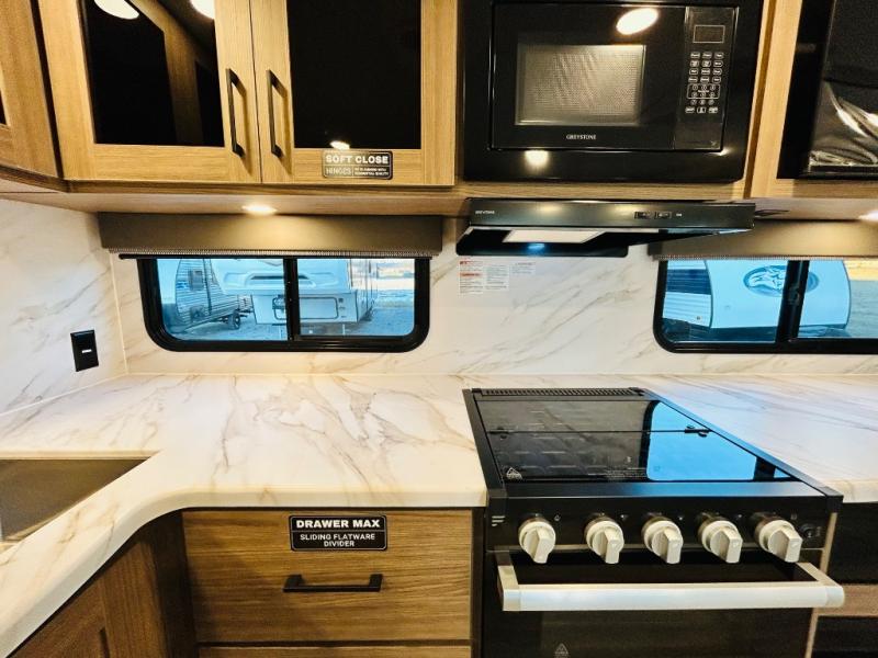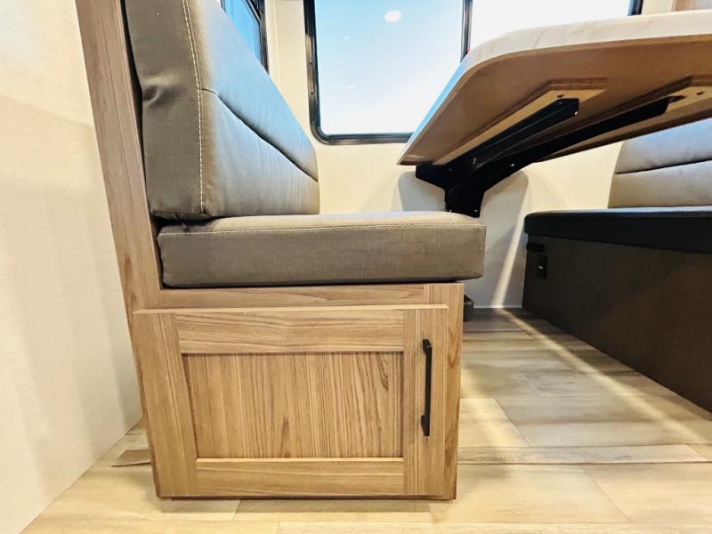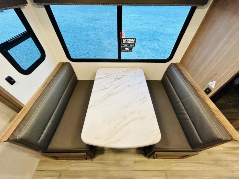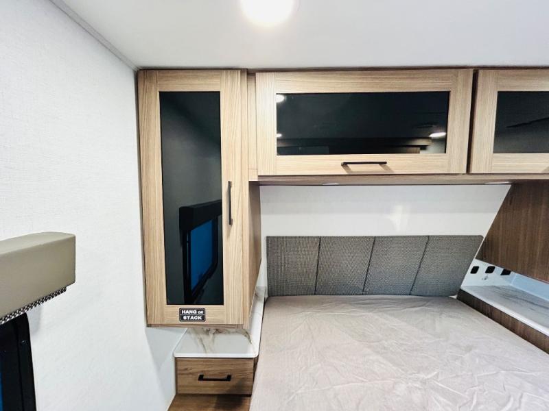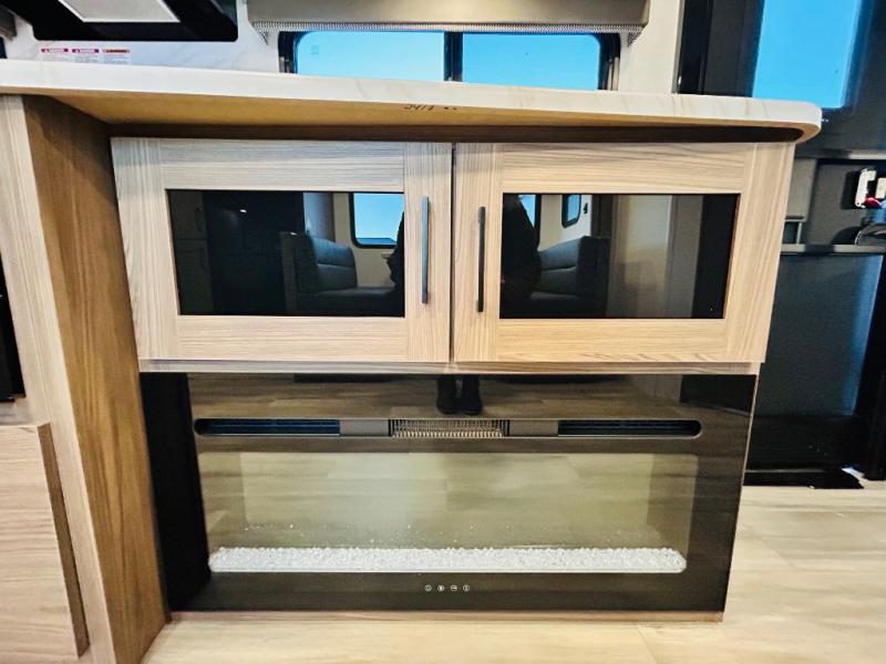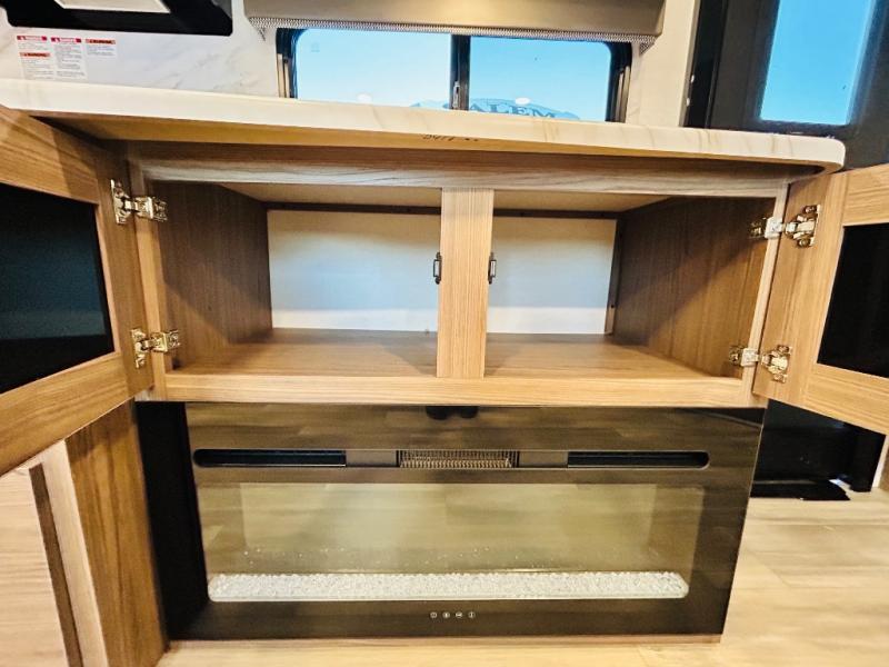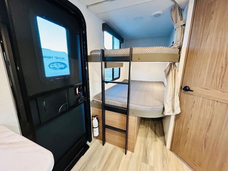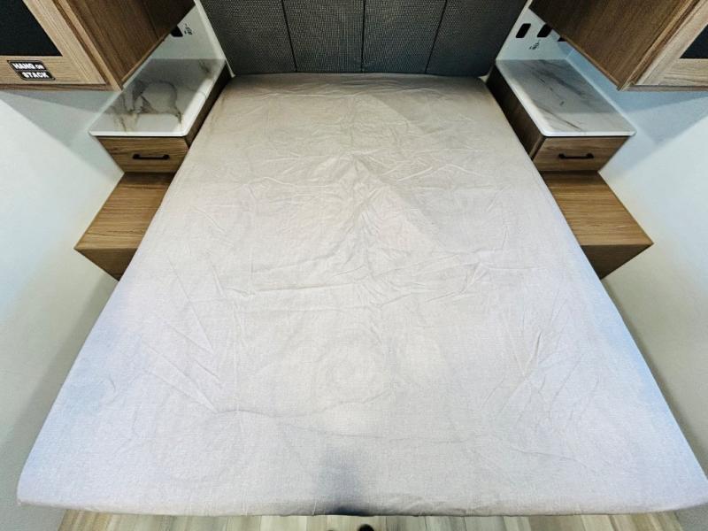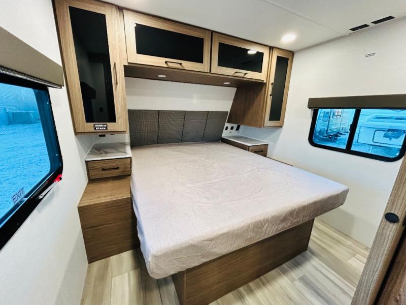 If you're looking for a trailer that can sleep more campers, this is the one! There are 46" x 74" bunks in the back right beside the full bath for easy nighttime use. You'll have your own bedroom up front, complete with a queen bed, dual wardrobe nightstands, and overhead storage. The large slide out in the main living area will provide your crew with plenty of space to dine at the booth dinette or just relax in front of the fireplace. There is a full kitchen inside, along with an exterior griddle/grill when you want to cook outdoors!