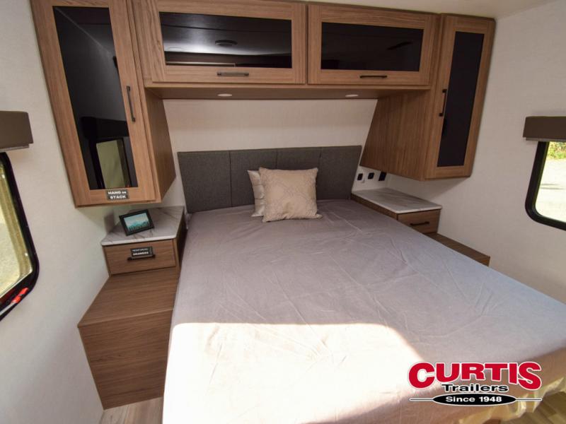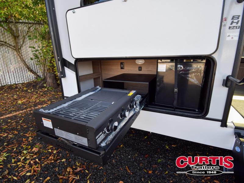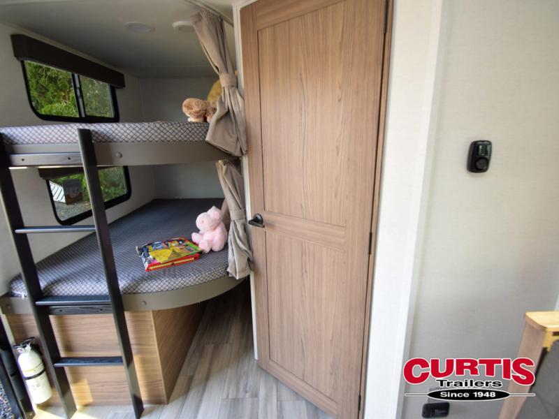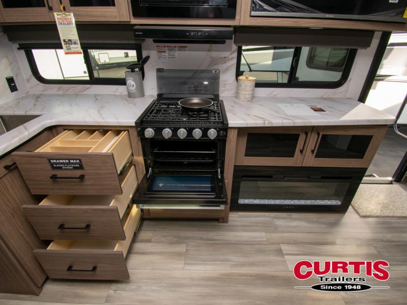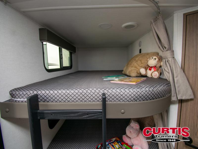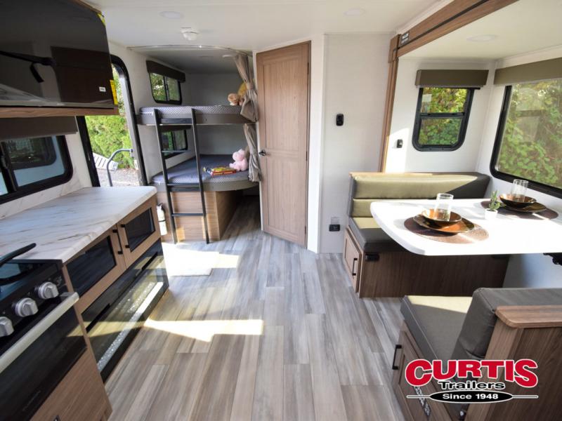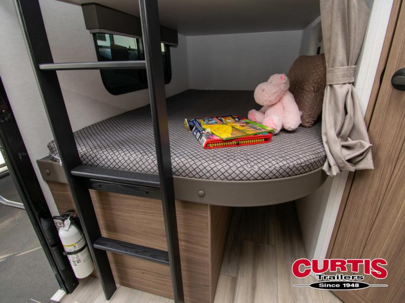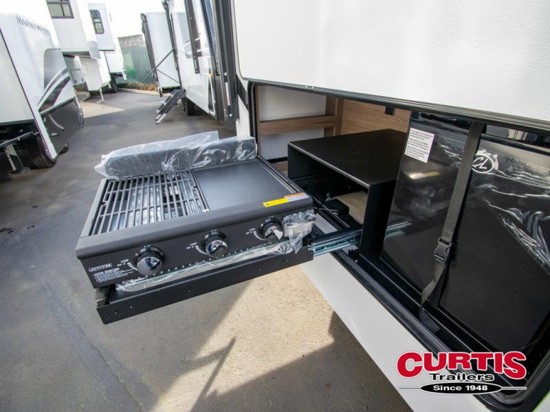 If you're looking for a trailer that can sleep more campers, this is the one! There are 46" x 74" bunks in the back right beside the full bath for easy nighttime use. You'll have your own bedroom up front, complete with a queen bed, dual wardrobe nightstands, and overhead storage. The large slide out in the main living area will provide your crew with plenty of space to dine at the booth dinette or just relax in front of the fireplace. There is a full kitchen inside, along with an exterior griddle/grill when you want to cook outdoors!