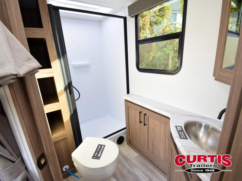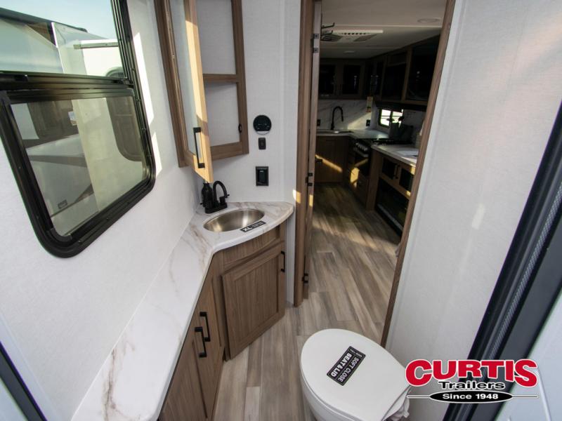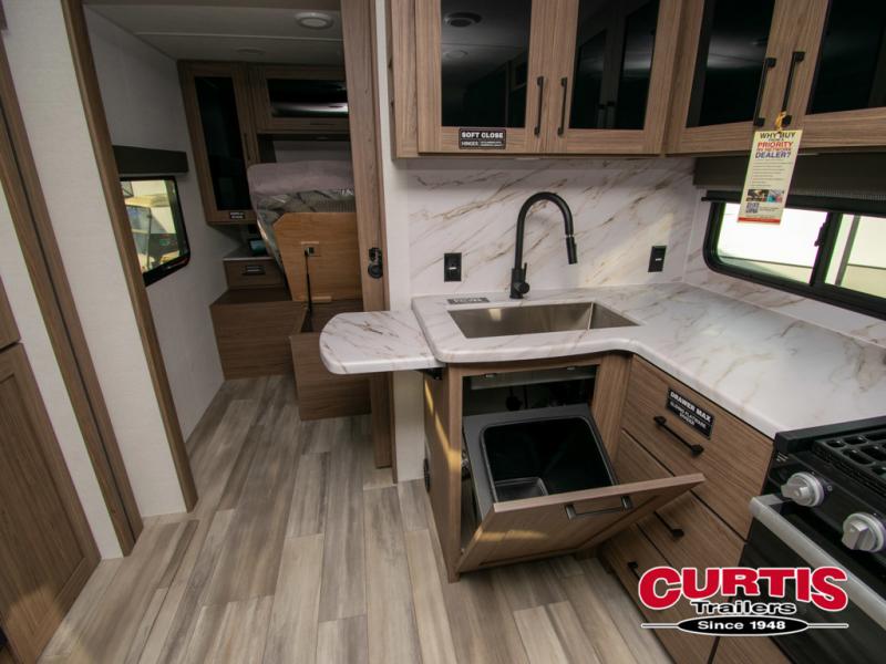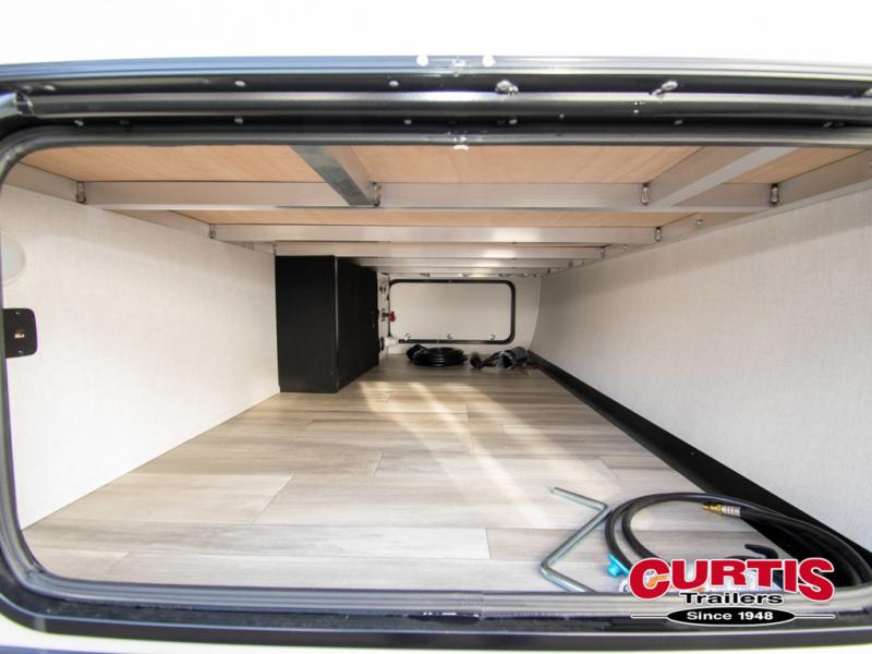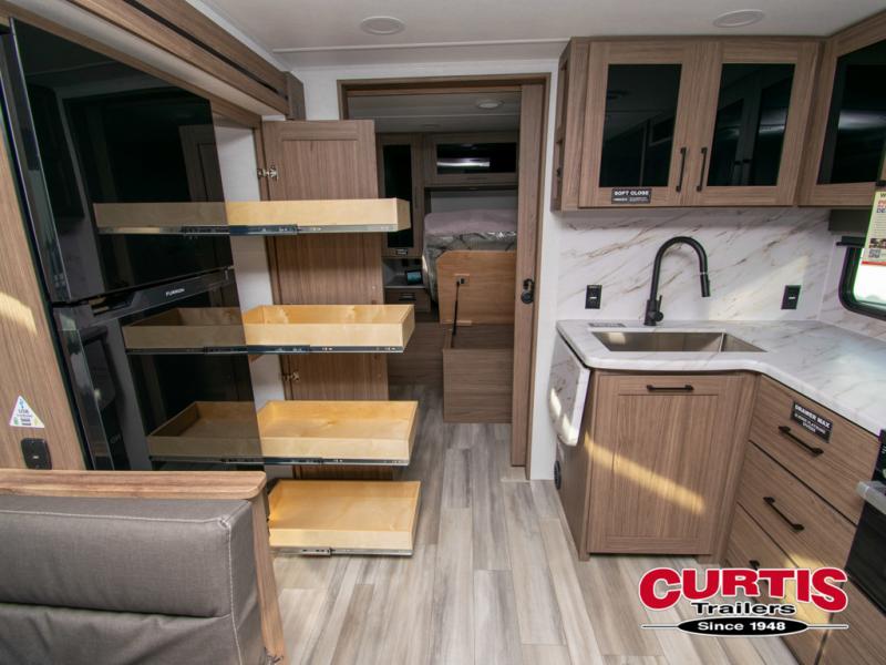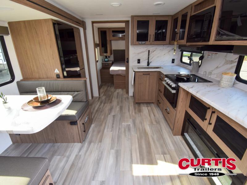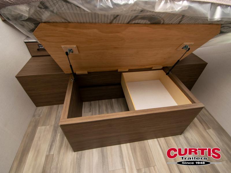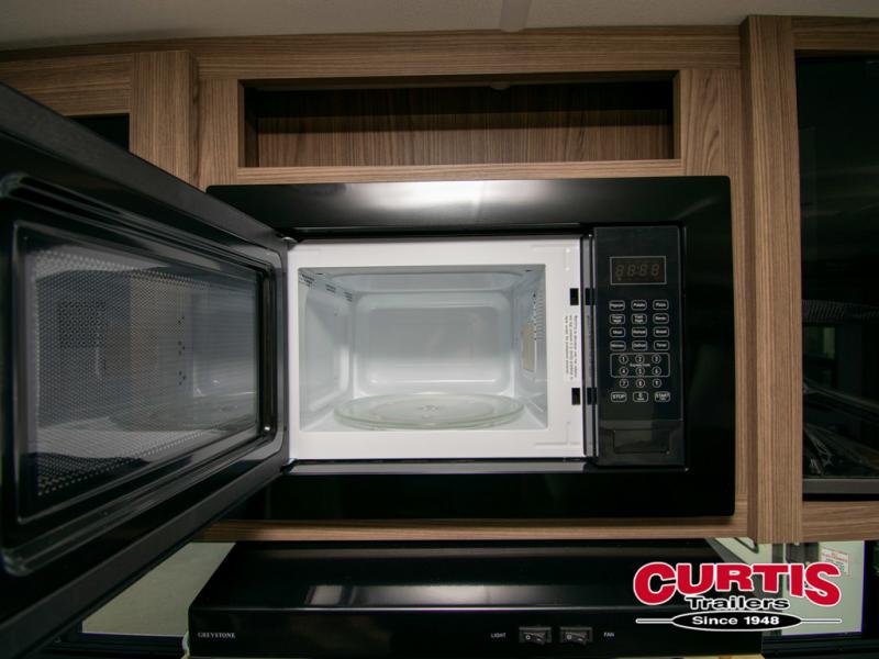 If you're looking for a trailer that can sleep more campers, this is the one! There are 46" x 74" bunks in the back right beside the full bath for easy nighttime use. You'll have your own bedroom up front, complete with a queen bed, dual wardrobe nightstands, and overhead storage. The large slide out in the main living area will provide your crew with plenty of space to dine at the booth dinette or just relax in front of the fireplace. There is a full kitchen inside, along with an exterior griddle/grill when you want to cook outdoors!