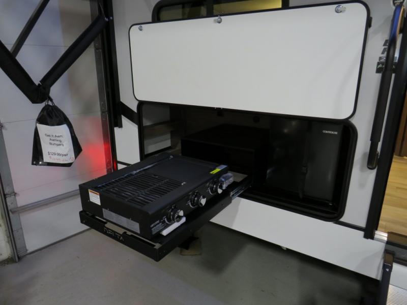If you're looking for a trailer that can sleep more campers, this is the one! There are 46" x 74" bunks in the back right beside the full bath for easy nighttime use. You'll have your own bedroom up front, complete with a queen bed, dual wardrobe nightstands, and overhead storage. The large slide out in the main living area will provide your crew with plenty of space to dine at the booth dinette or just relax in front of the fireplace. There is a full kitchen inside, along with an exterior griddle/grill when you want to cook outdoors!