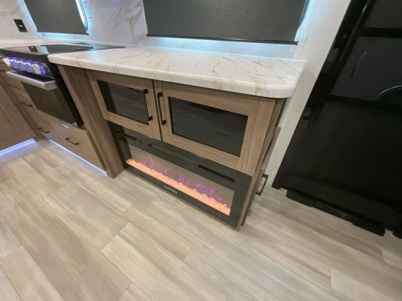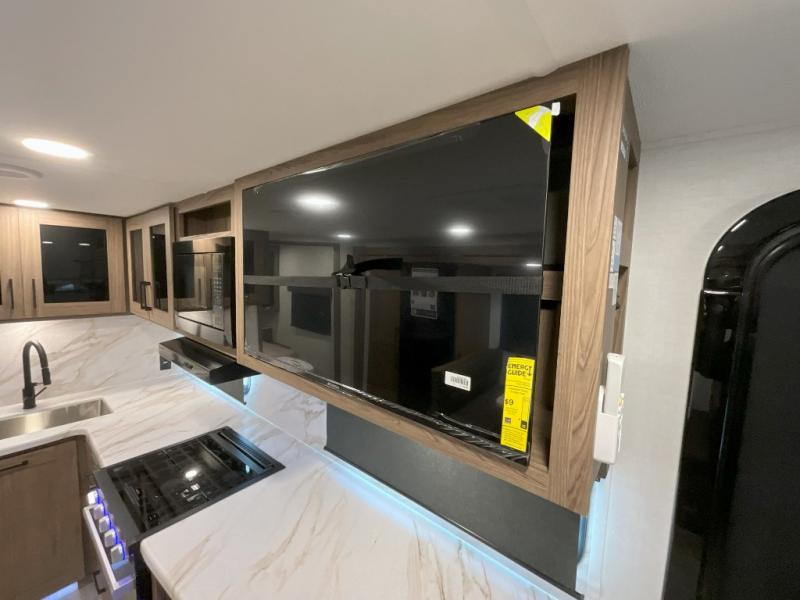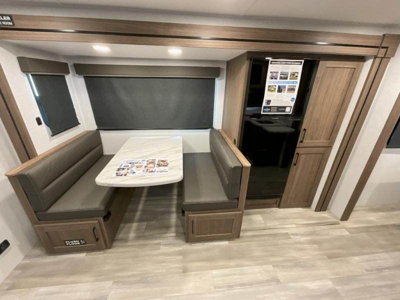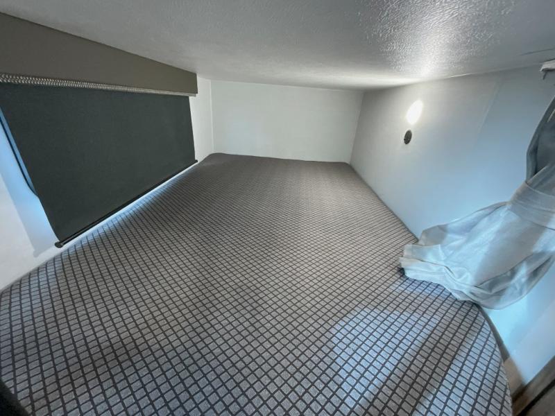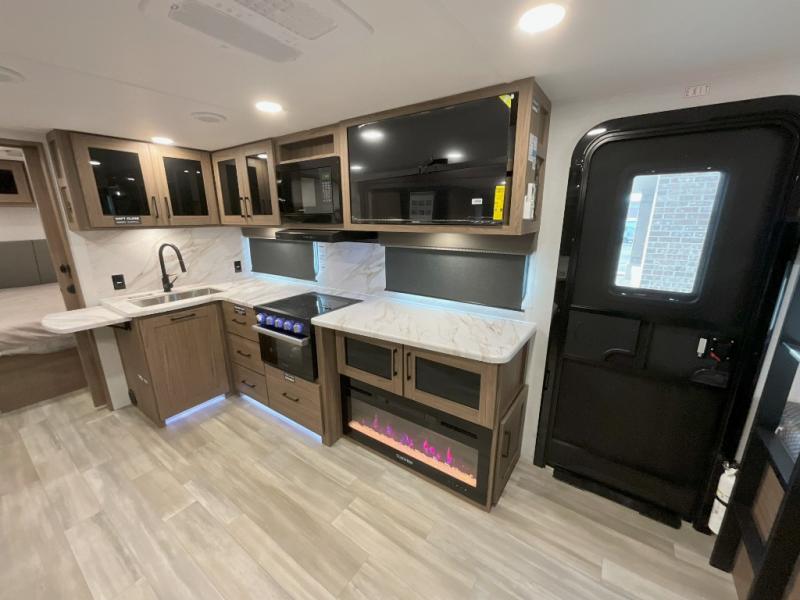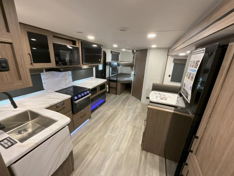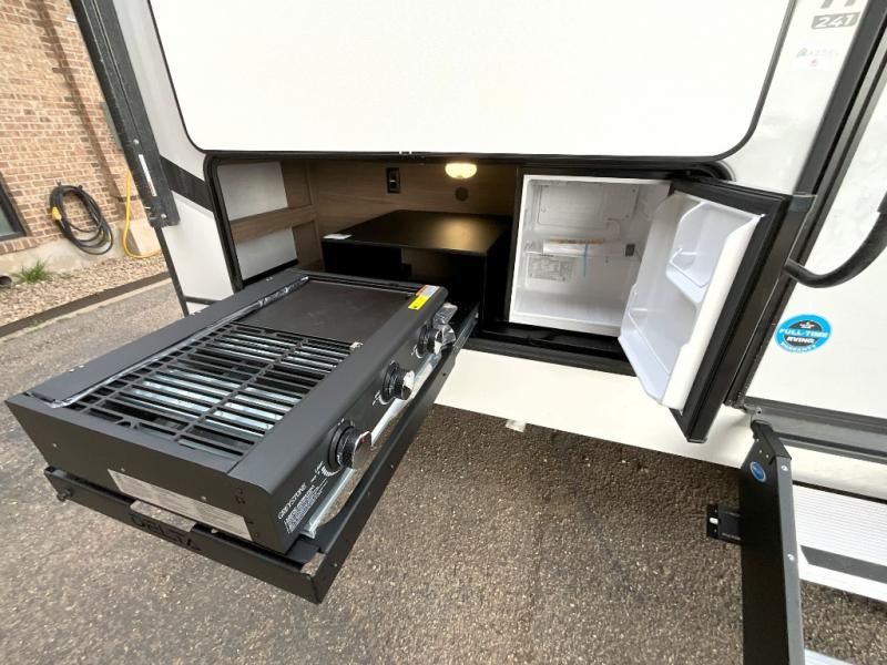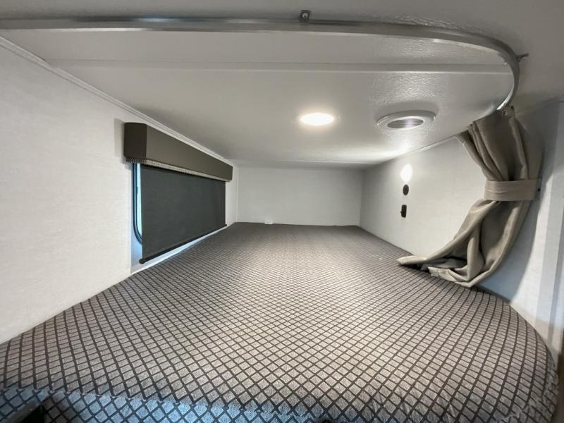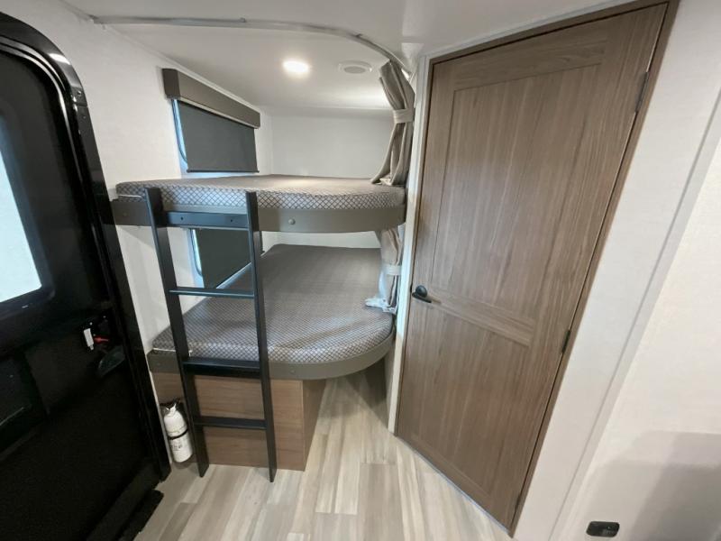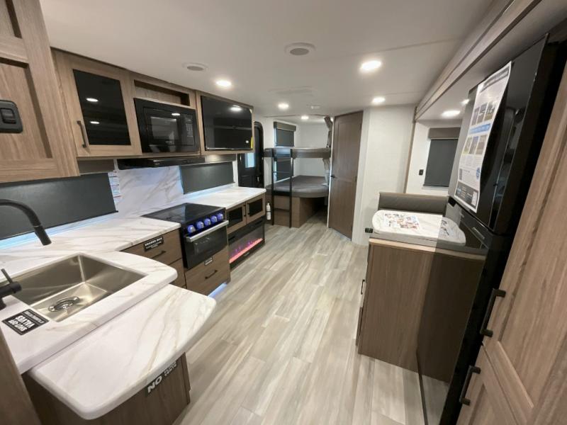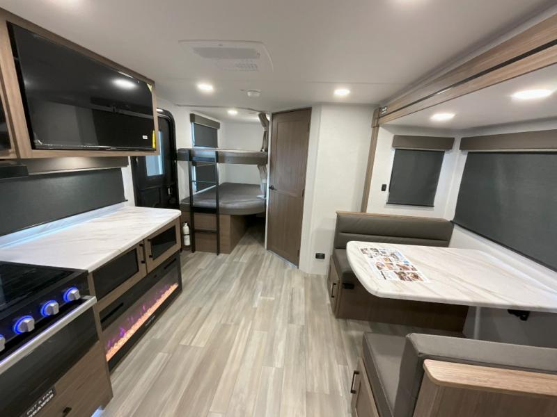 If you're looking for a trailer that can sleep more campers, this is the one! There are 46" x 74" bunks in the back right beside the full bath for easy nighttime use. You'll have your own bedroom up front, complete with a queen bed, dual wardrobe nightstands, and overhead storage. The large slide out in the main living area will provide your crew with plenty of space to dine at the booth dinette or just relax in front of the fireplace. There is a full kitchen inside, along with an exterior griddle/grill when you want to cook outdoors!