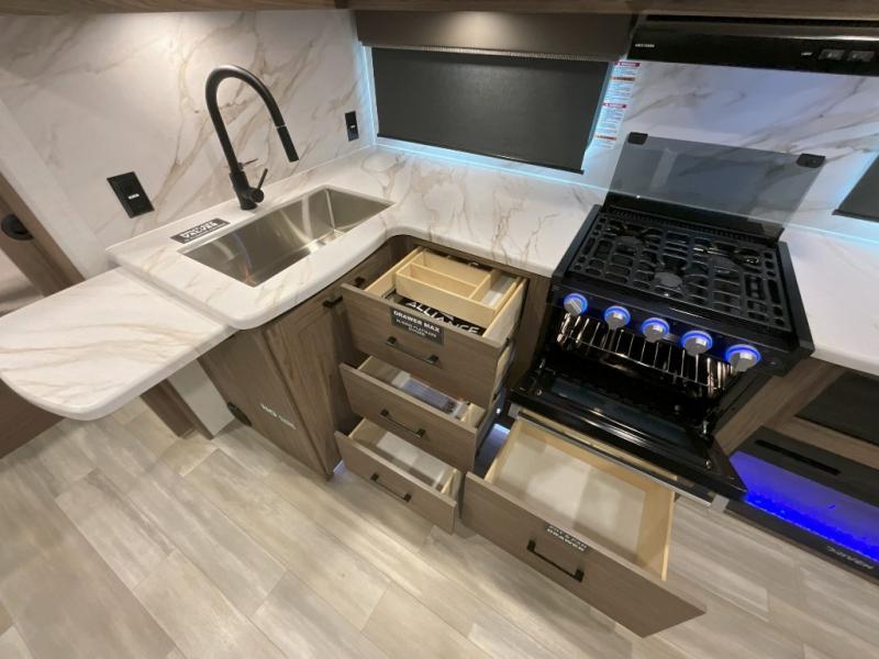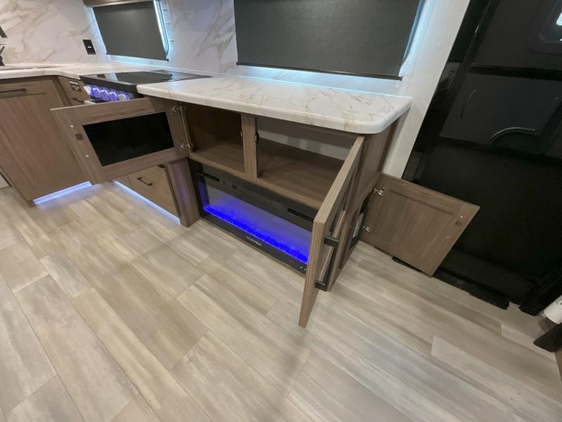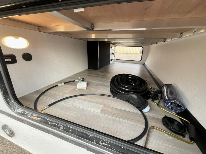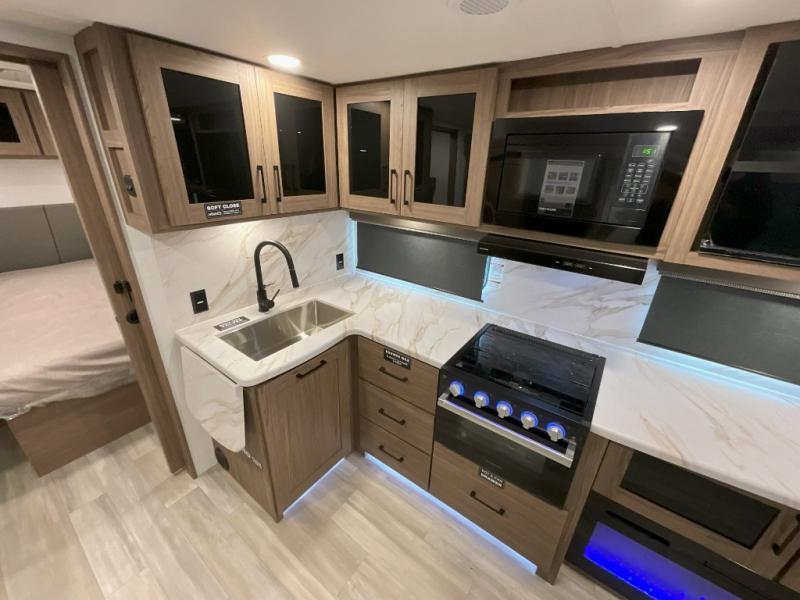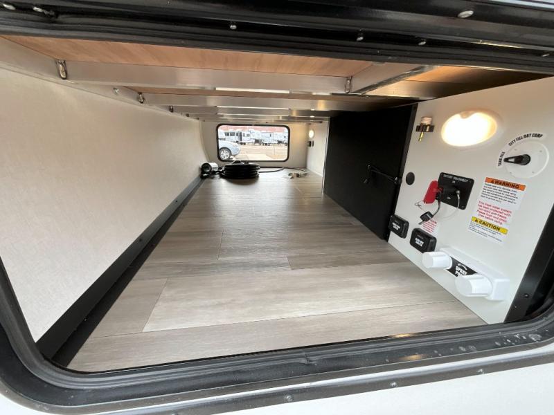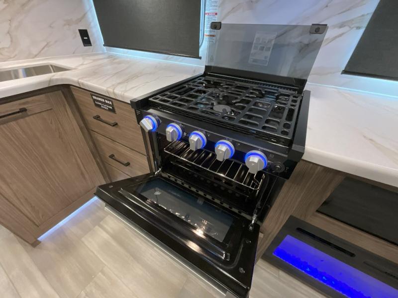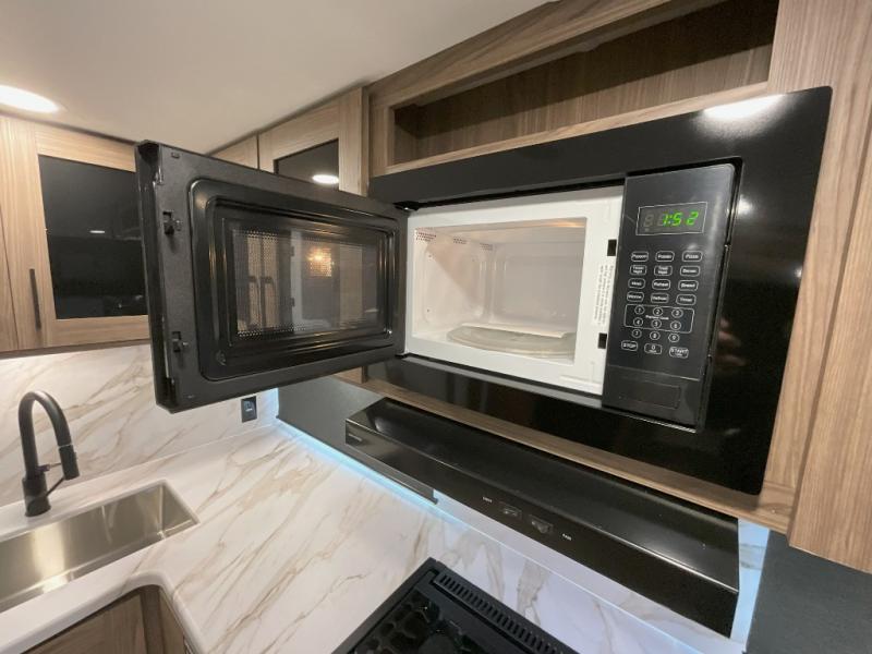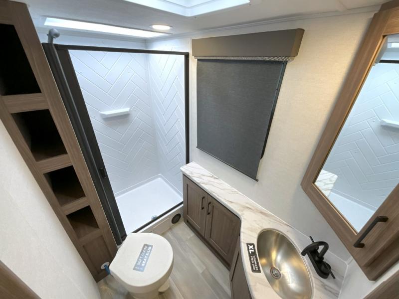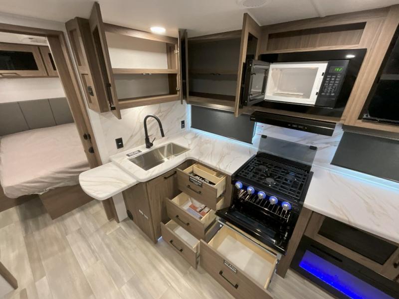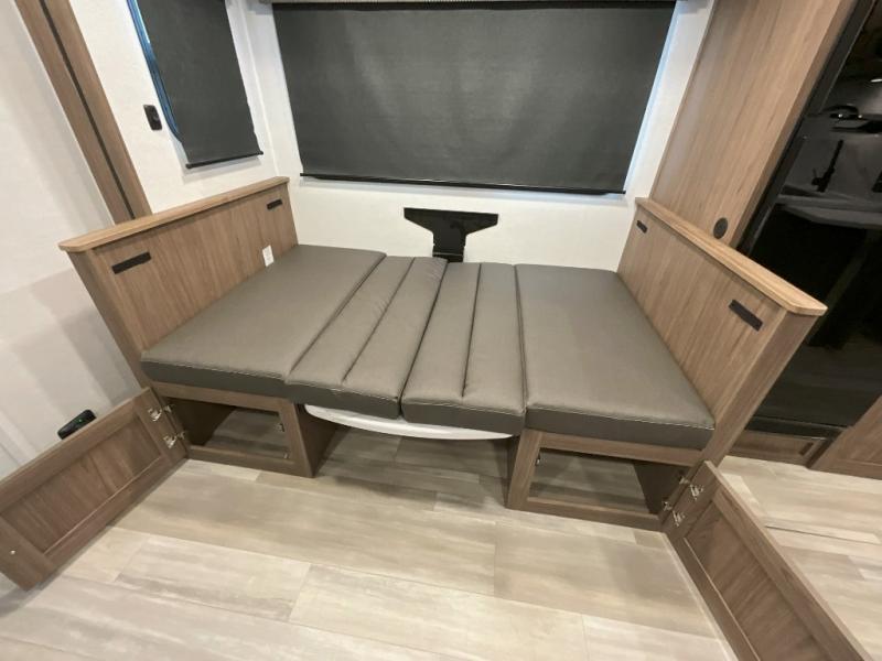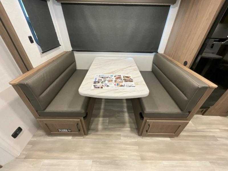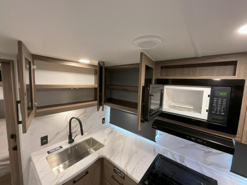 If you're looking for a trailer that can sleep more campers, this is the one! There are 46" x 74" bunks in the back right beside the full bath for easy nighttime use. You'll have your own bedroom up front, complete with a queen bed, dual wardrobe nightstands, and overhead storage. The large slide out in the main living area will provide your crew with plenty of space to dine at the booth dinette or just relax in front of the fireplace. There is a full kitchen inside, along with an exterior griddle/grill when you want to cook outdoors!