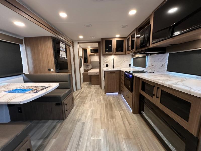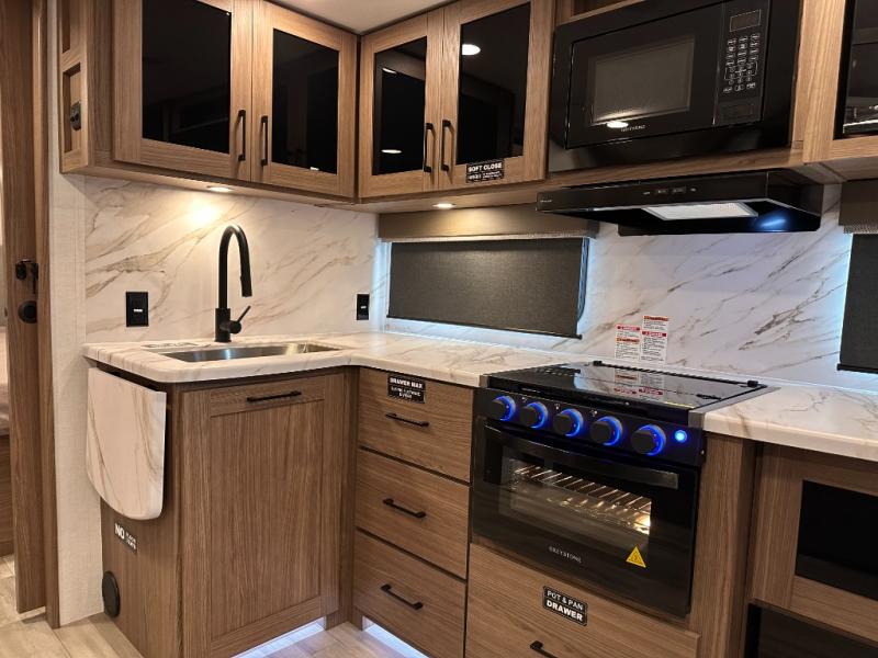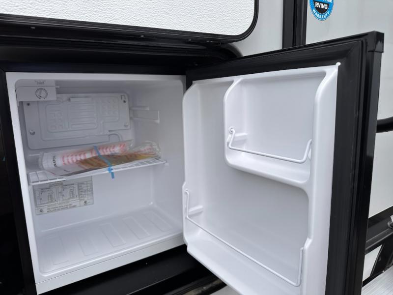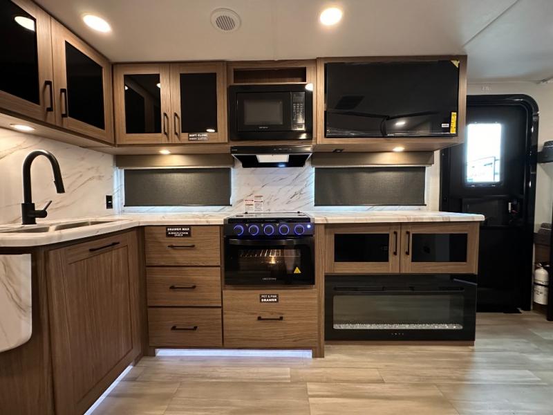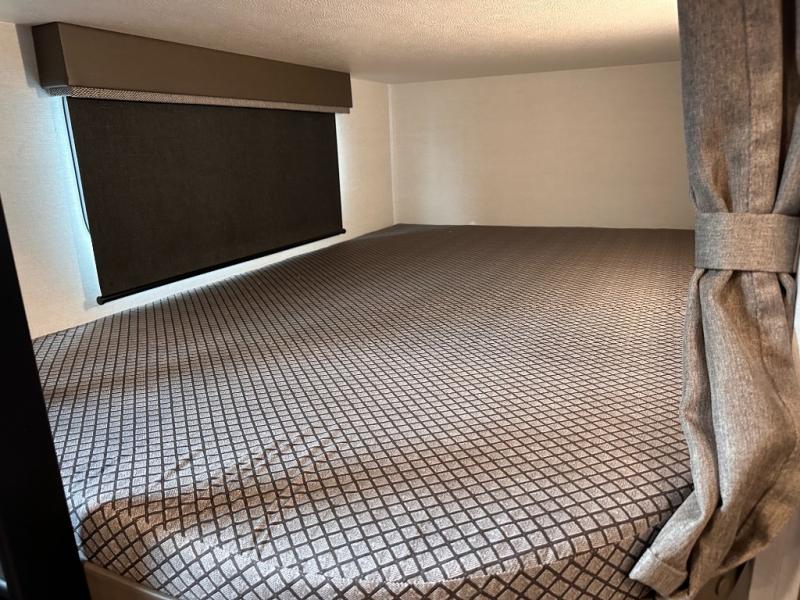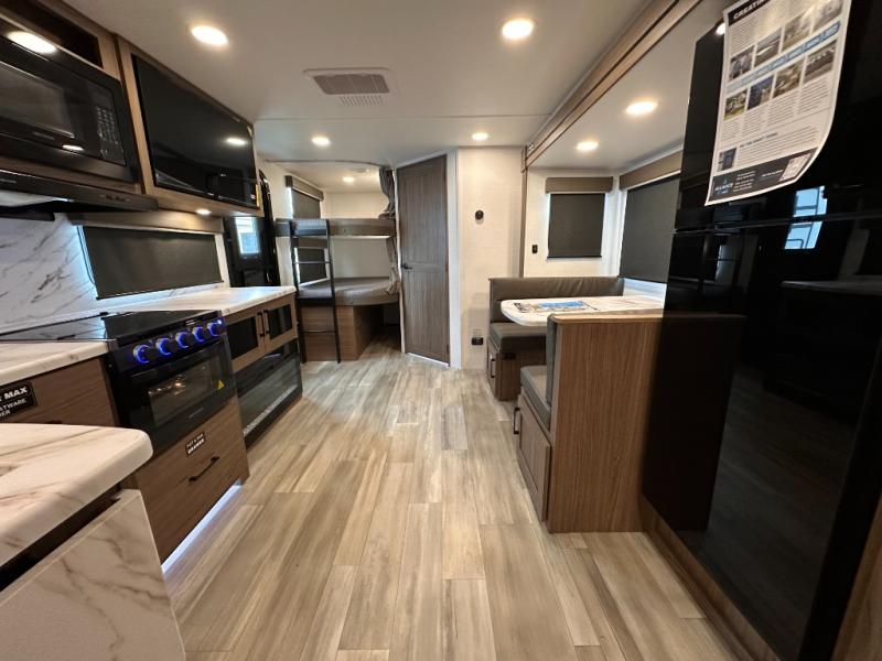 If you're looking for a trailer that can sleep more campers, this is the one! There are 46" x 74" bunks in the back right beside the full bath for easy nighttime use. You'll have your own bedroom up front, complete with a queen bed, dual wardrobe nightstands, and overhead storage. The large slide out in the main living area will provide your crew with plenty of space to dine at the booth dinette or just relax in front of the fireplace. There is a full kitchen inside, along with an exterior griddle/grill when you want to cook outdoors!