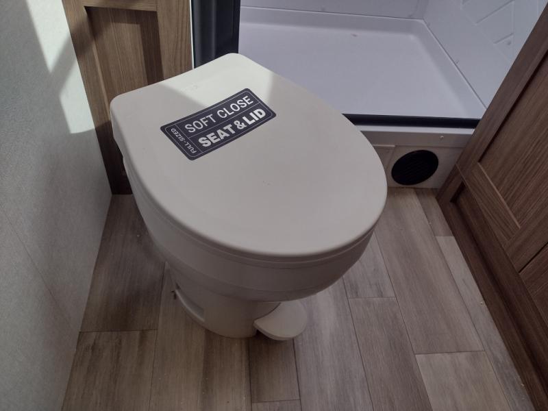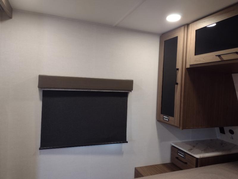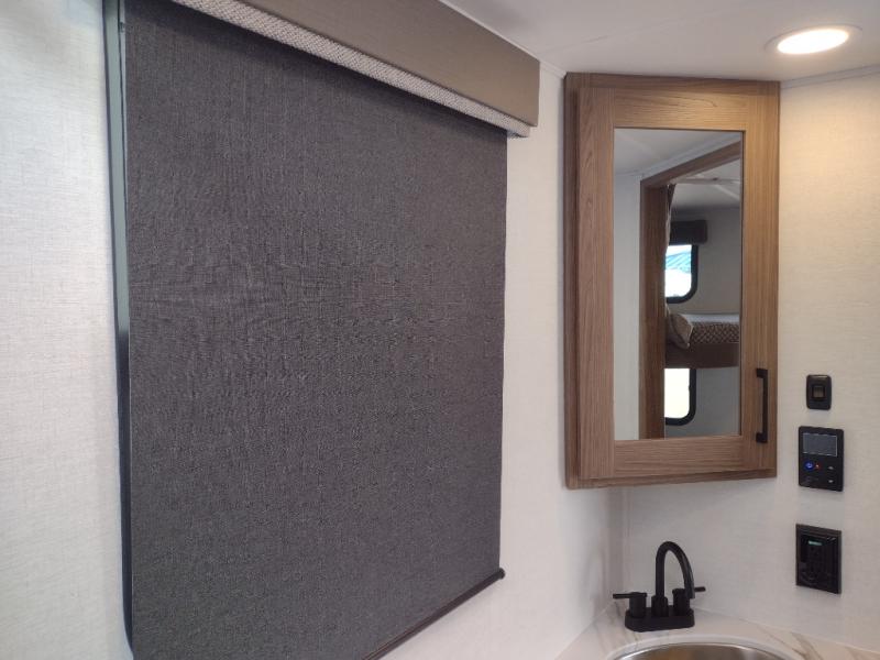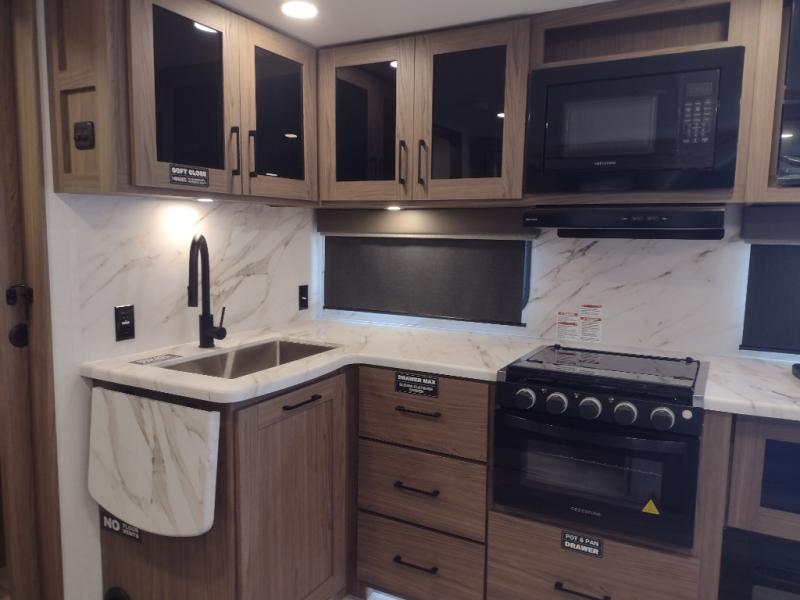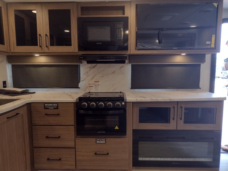 If you're looking for a trailer that can sleep more campers, this is the one! There are 46" x 74" bunks in the back right beside the full bath for easy nighttime use. You'll have your own bedroom up front, complete with a queen bed, dual wardrobe nightstands, and overhead storage. The large slide out in the main living area will provide your crew with plenty of space to dine at the booth dinette or just relax in front of the fireplace. There is a full kitchen inside, along with an exterior griddle/grill when you want to cook outdoors!