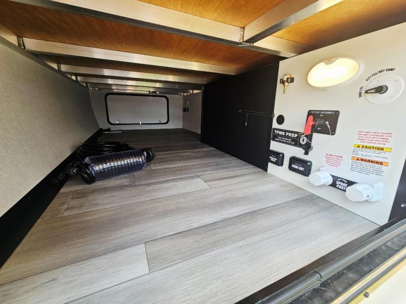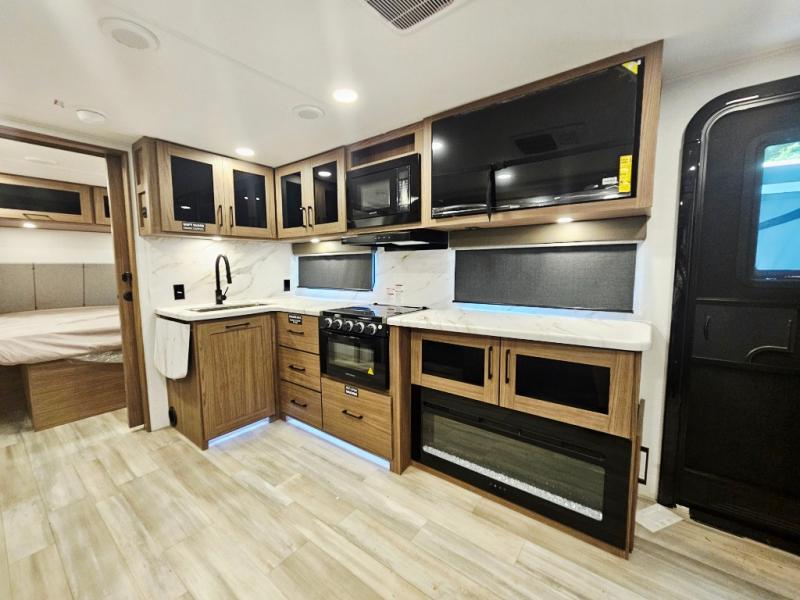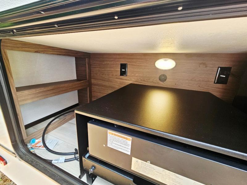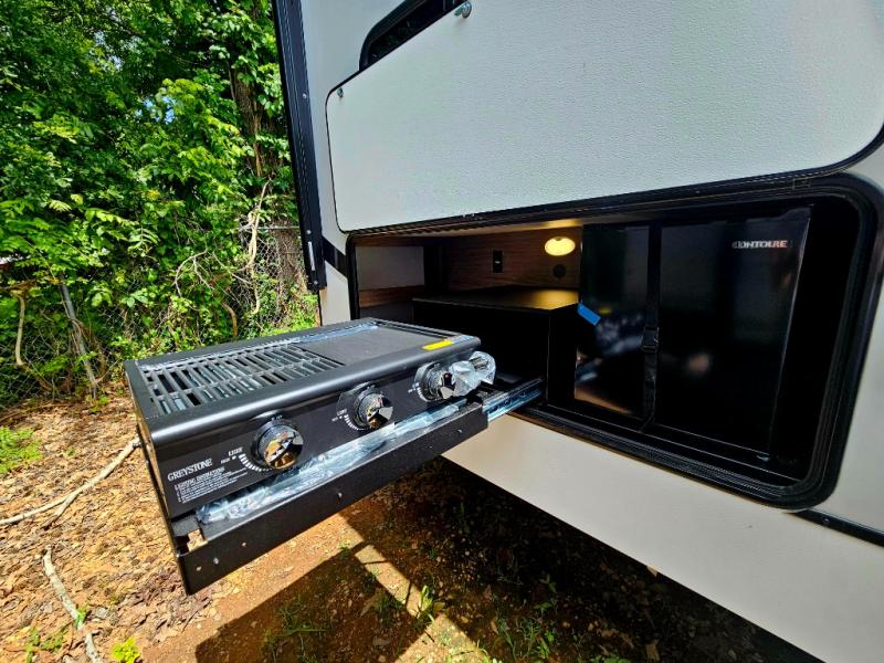 If you're looking for a trailer that can sleep more campers, this is the one! There are 46" x 74" bunks in the back right beside the full bath for easy nighttime use. You'll have your own bedroom up front, complete with a queen bed, dual wardrobe nightstands, and overhead storage. The large slide out in the main living area will provide your crew with plenty of space to dine at the booth dinette or just relax in front of the fireplace. There is a full kitchen inside, along with an exterior griddle/grill when you want to cook outdoors!