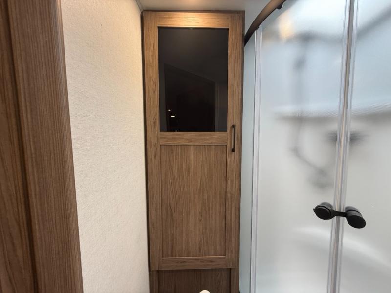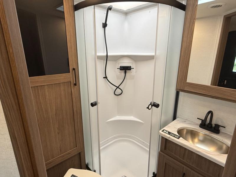Bathroom: “full rear bathroom” with a 32-inch radius / plastic/glass shower, sink, toilet, and some linen storage area
