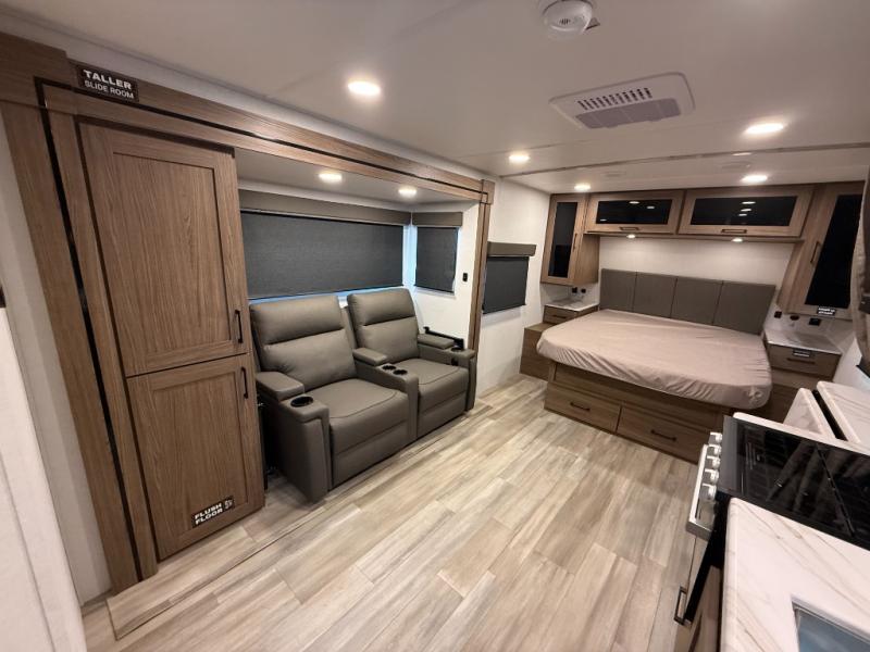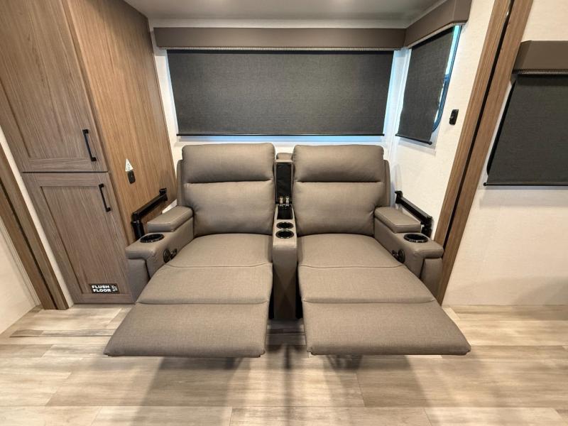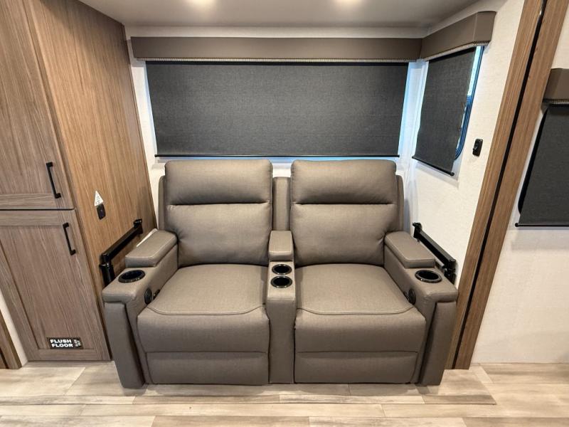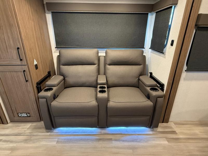 Theater seating slide-out in living area with fireplace across the room, providing a more home-like feel