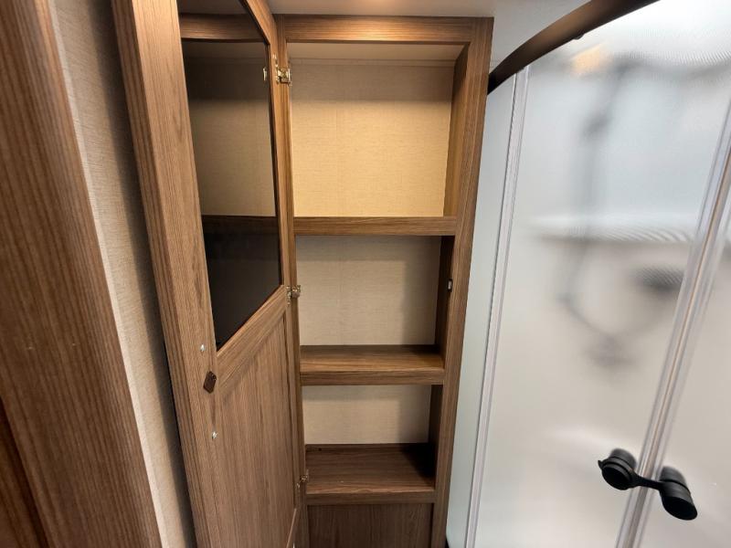 Kitchen has a three-burner cooktop, a full-size (˜ 10 cu ft) 12-V refrigerator, large sink, and a pull-out pantry with trays