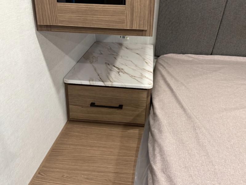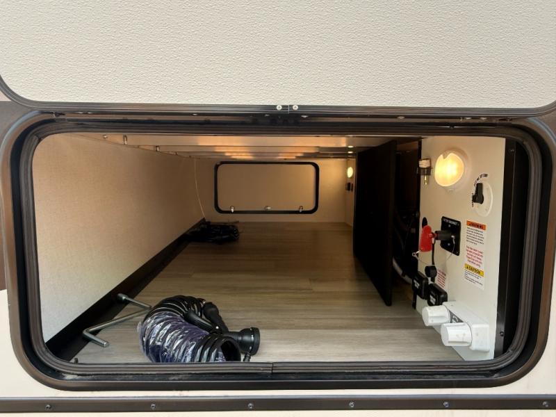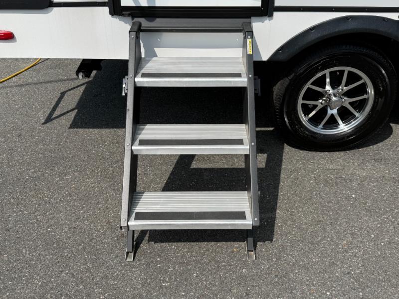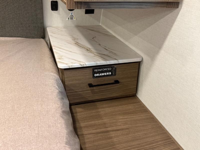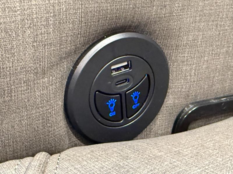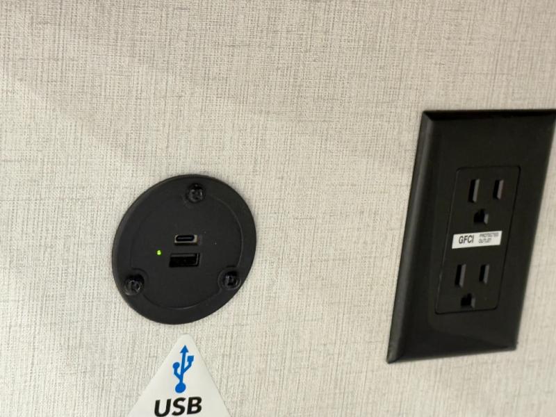 Exterior features include a 15 ft awning, pass-through storage, exterior spray ports, a large single window “atrium” style, USB ports throughout, etc.