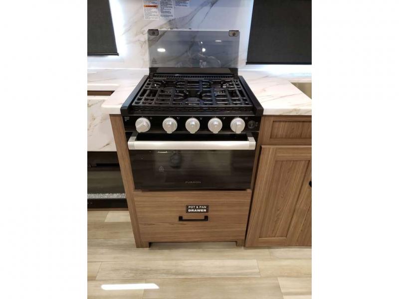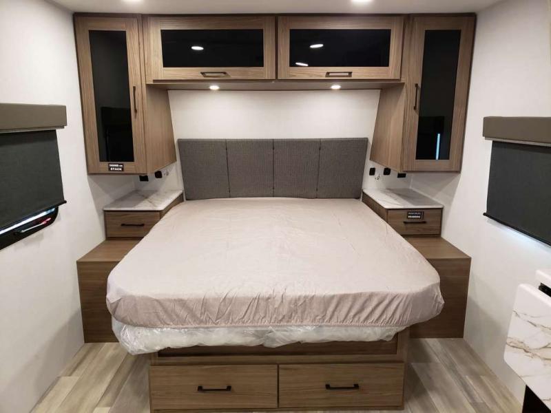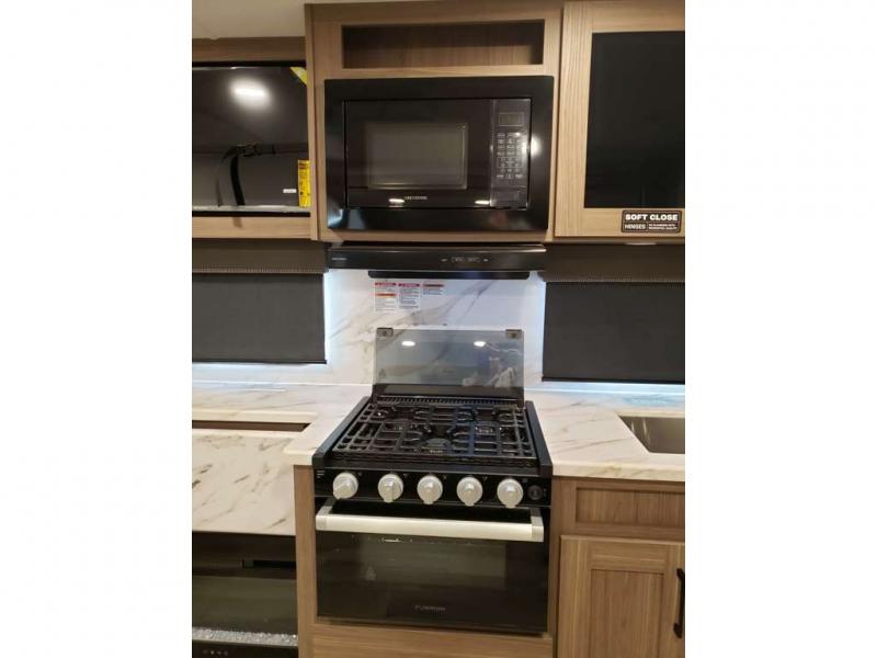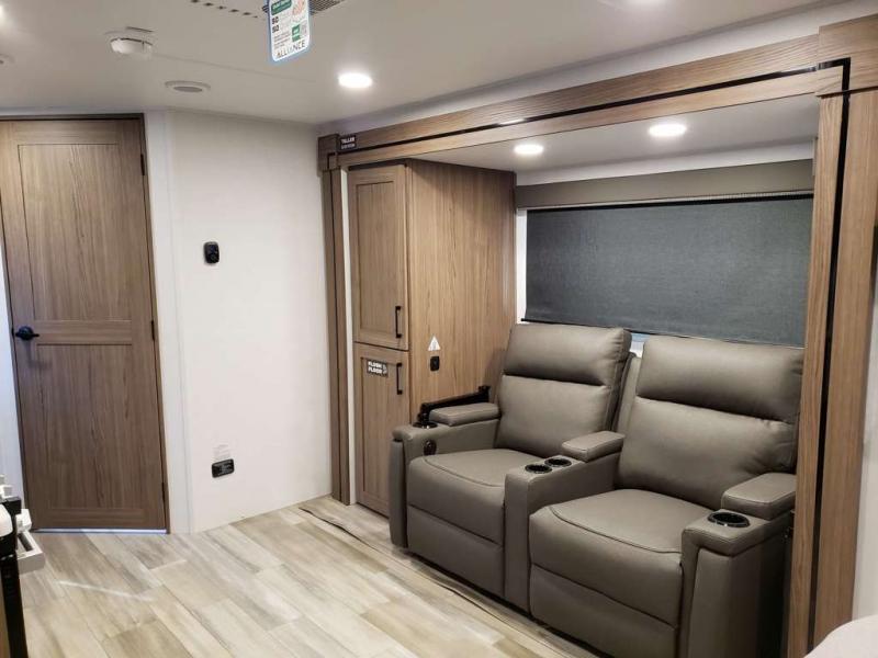 This couple's trailer is perfect for weekend trips to your favorite campground. The theater seat slide will provide comfort and space, while the fireplace across the room will have you feeling right at home. There are also two tables for the sofa and a flip-up extension by the fireplace for more counter space. All of your meals can be made on the three burner cooktop, and clean up will be a breeze with the large kitchen sink. A full bath is complete with a toilet, sink, 32" shower and a linen closet, and the front queen bed with a privacy curtain is sure to provide a great night's rest. You'll also find dual wardrobes and nightstands, along with overhead storage to keep everything organized!