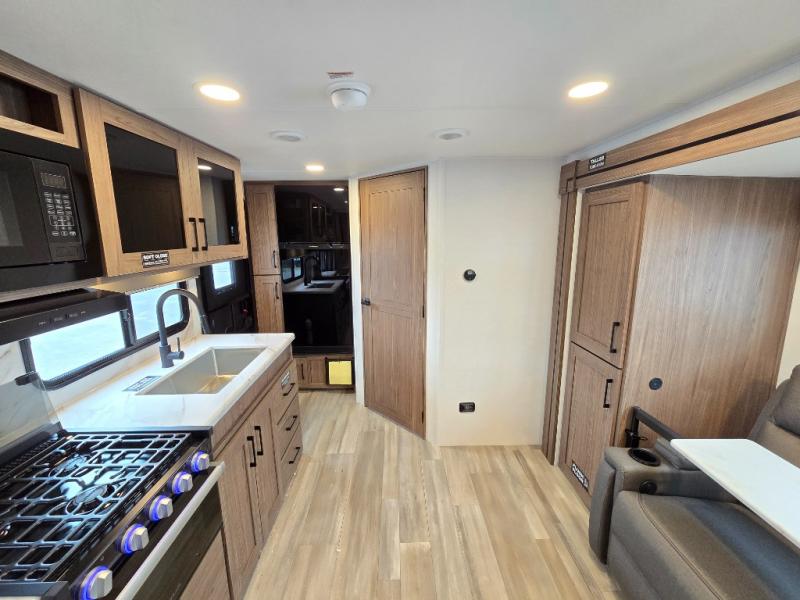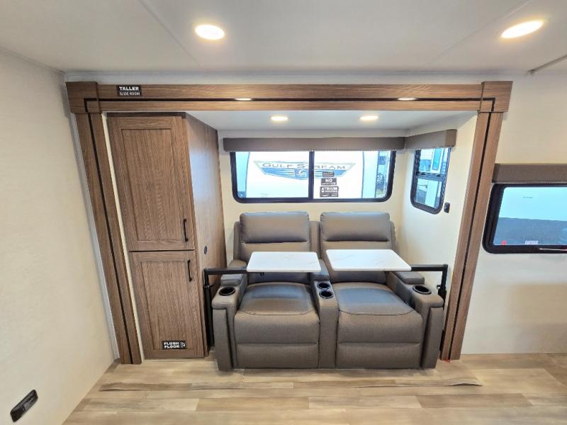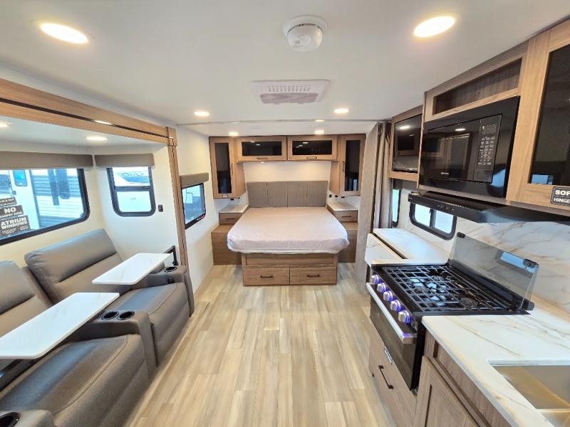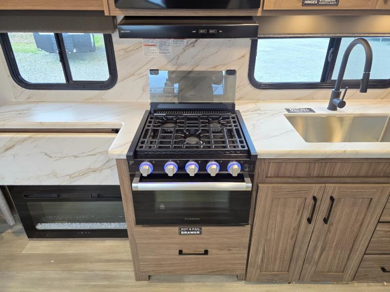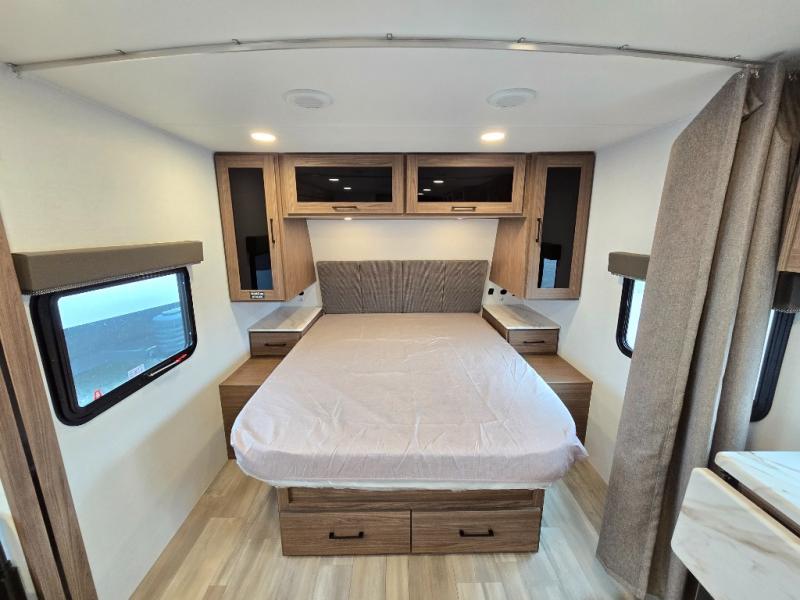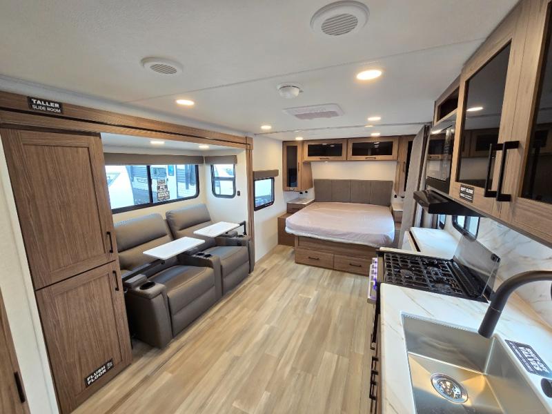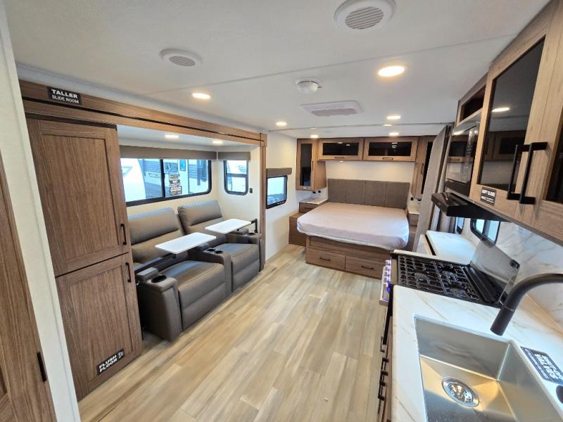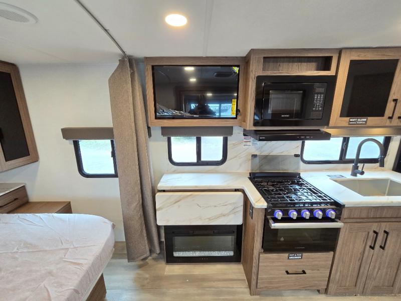 This couple's trailer is perfect for weekend trips to your favorite campground. The theater seat slide will provide comfort and space, while the fireplace across the room will have you feeling right at home. There are also two tables for the sofa and a flip-up extension by the fireplace for more counter space. All of your meals can be made on the three burner cooktop, and clean up will be a breeze with the large kitchen sink. A full bath is complete with a toilet, sink, 32" shower and a linen closet, and the front queen bed with a privacy curtain is sure to provide a great night's rest. You'll also find dual wardrobes and nightstands, along with overhead storage to keep everything organized!
