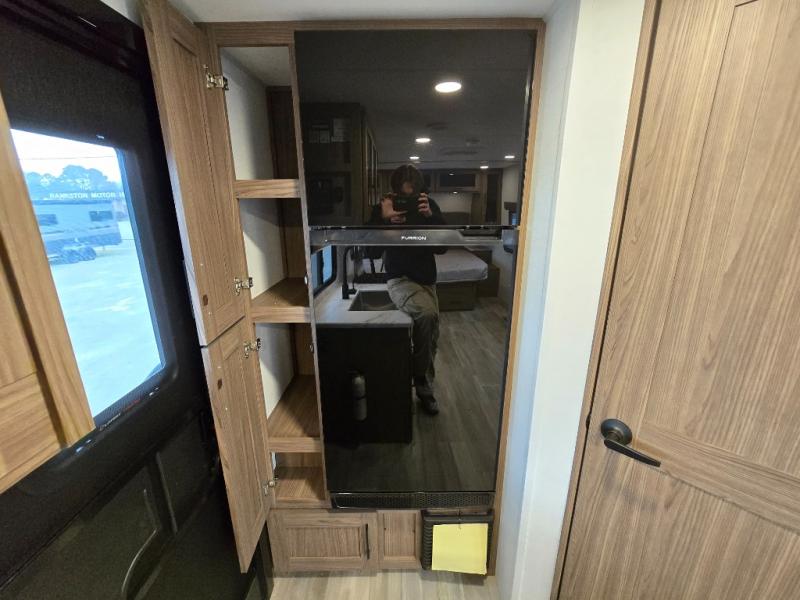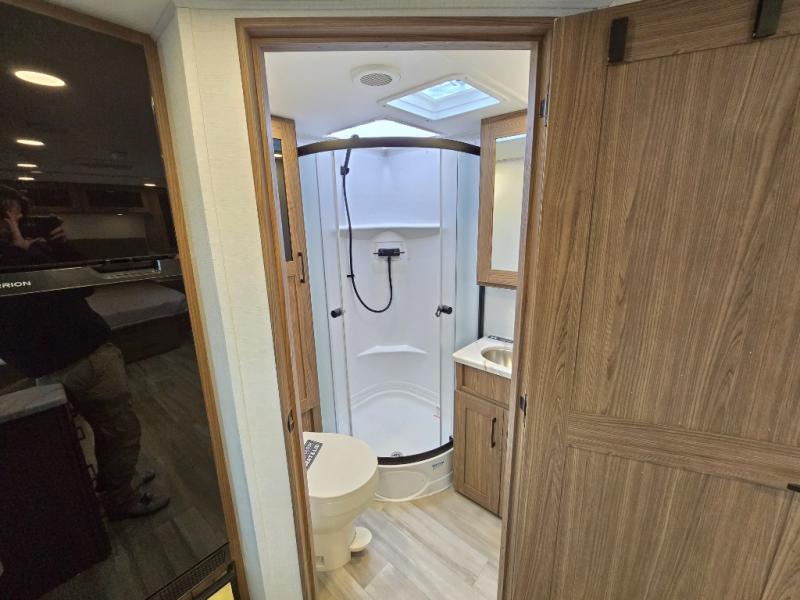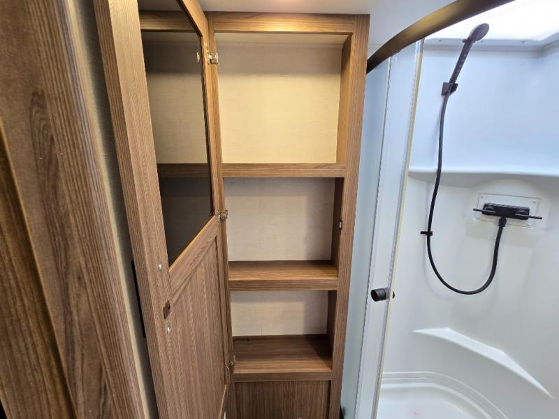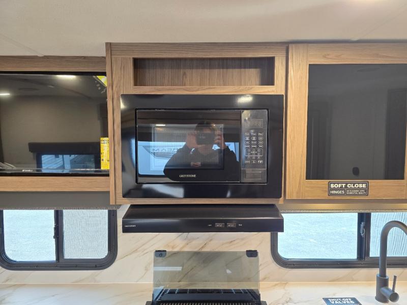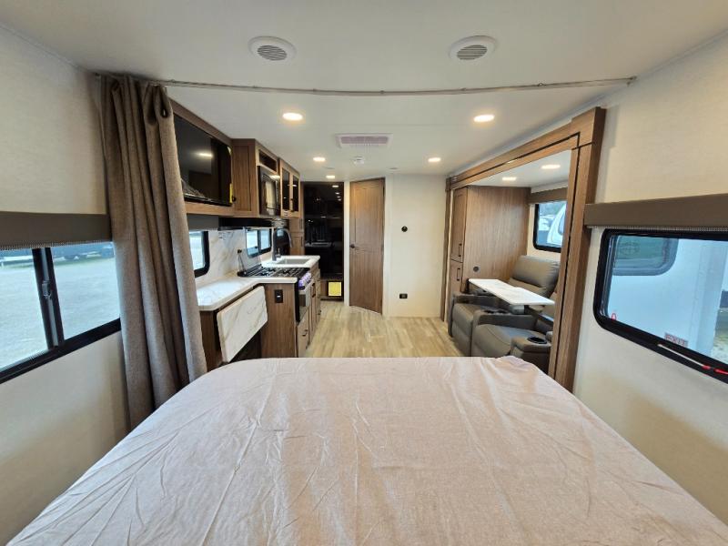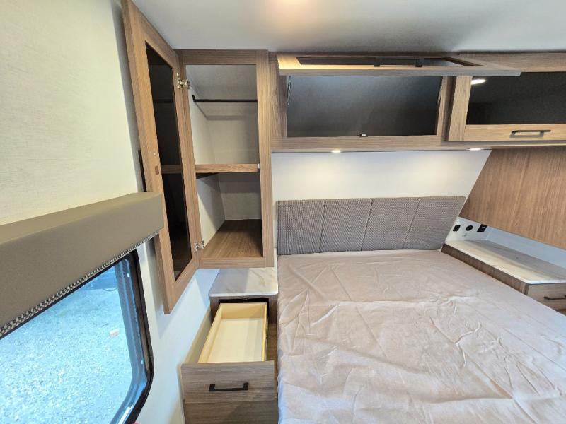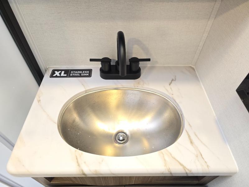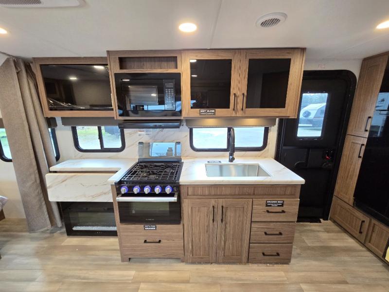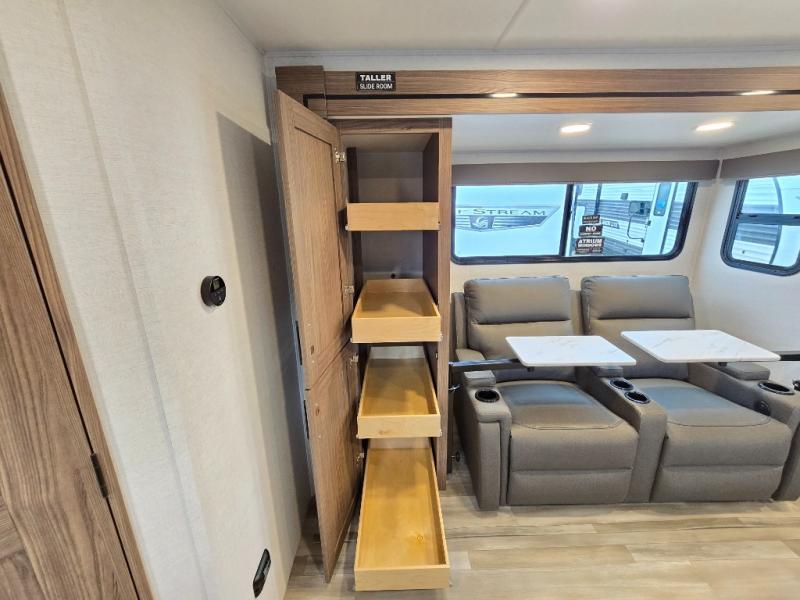 This couple's trailer is perfect for weekend trips to your favorite campground. The theater seat slide will provide comfort and space, while the fireplace across the room will have you feeling right at home. There are also two tables for the sofa and a flip-up extension by the fireplace for more counter space. All of your meals can be made on the three burner cooktop, and clean up will be a breeze with the large kitchen sink. A full bath is complete with a toilet, sink, 32" shower and a linen closet, and the front queen bed with a privacy curtain is sure to provide a great night's rest. You'll also find dual wardrobes and nightstands, along with overhead storage to keep everything organized!