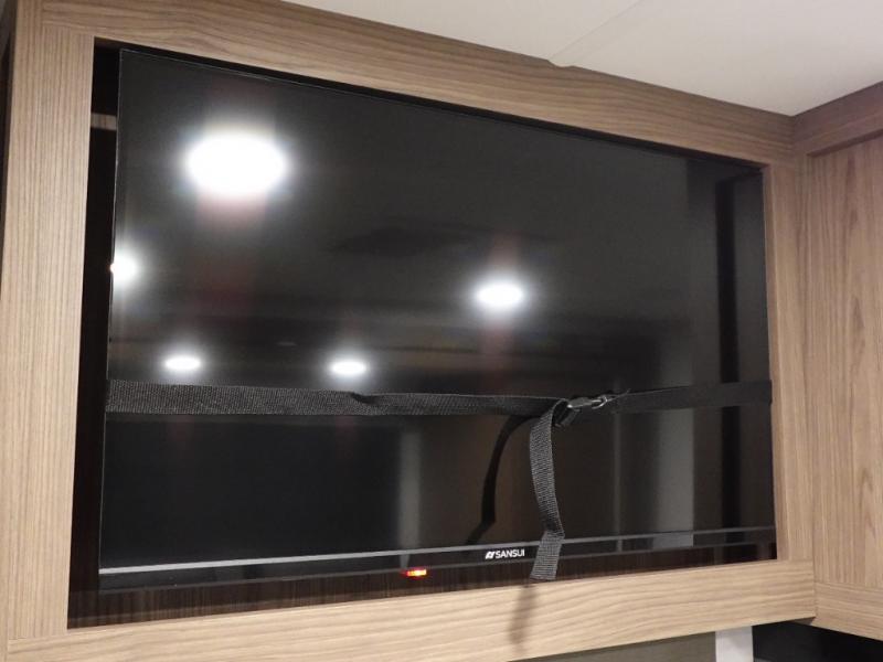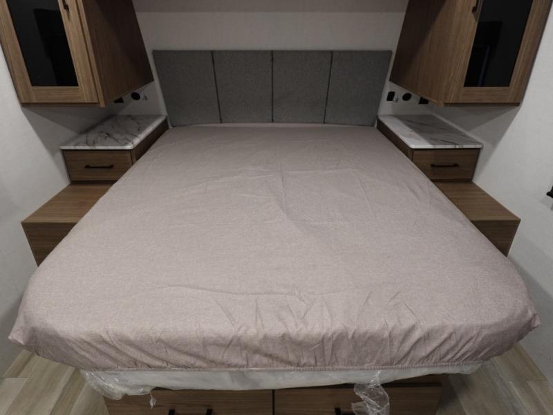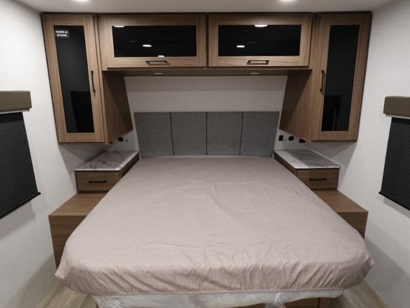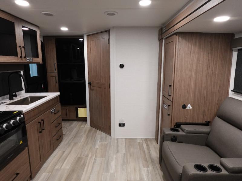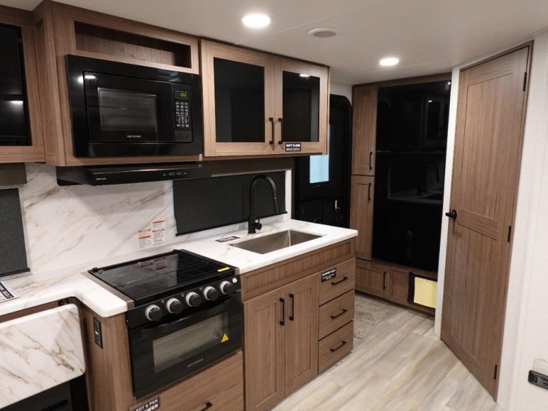 This couple's trailer is perfect for weekend trips to your favorite campground. The theater seat slide will provide comfort and space, while the fireplace across the room will have you feeling right at home. There are also two tables for the sofa and a flip-up extension by the fireplace for more counter space. All of your meals can be made on the three burner cooktop, and clean up will be a breeze with the large kitchen sink. A full bath is complete with a toilet, sink, 32" shower and a linen closet, and the front queen bed with a privacy curtain is sure to provide a great night's rest. You'll also find dual wardrobes and nightstands, along with overhead storage to keep everything organized!