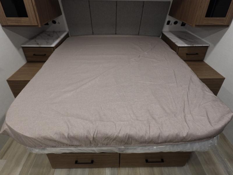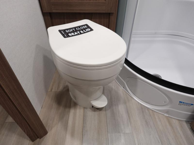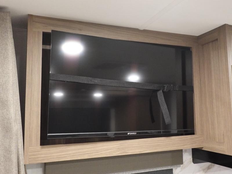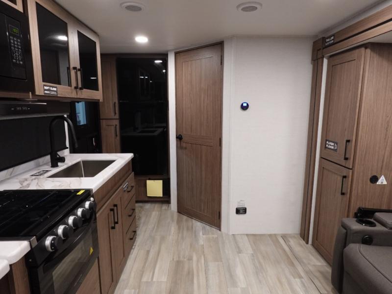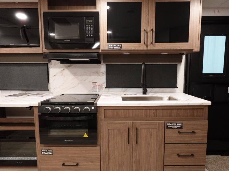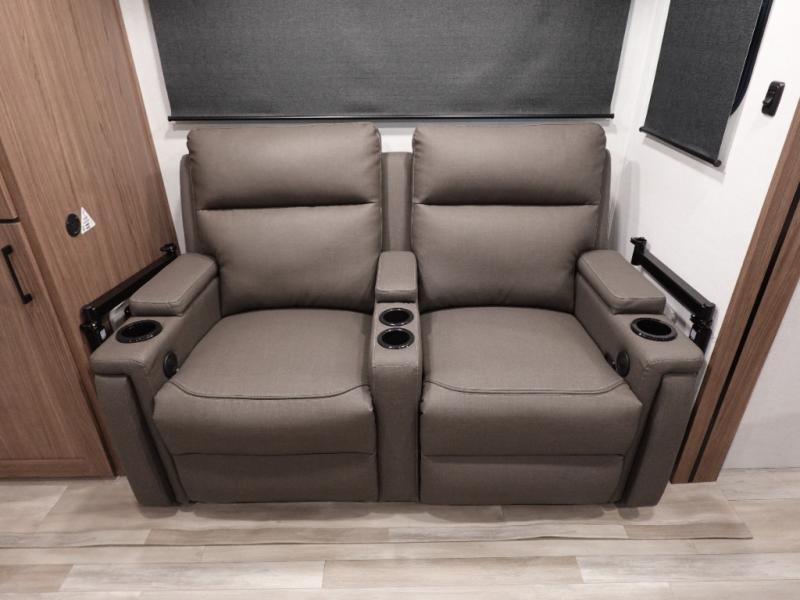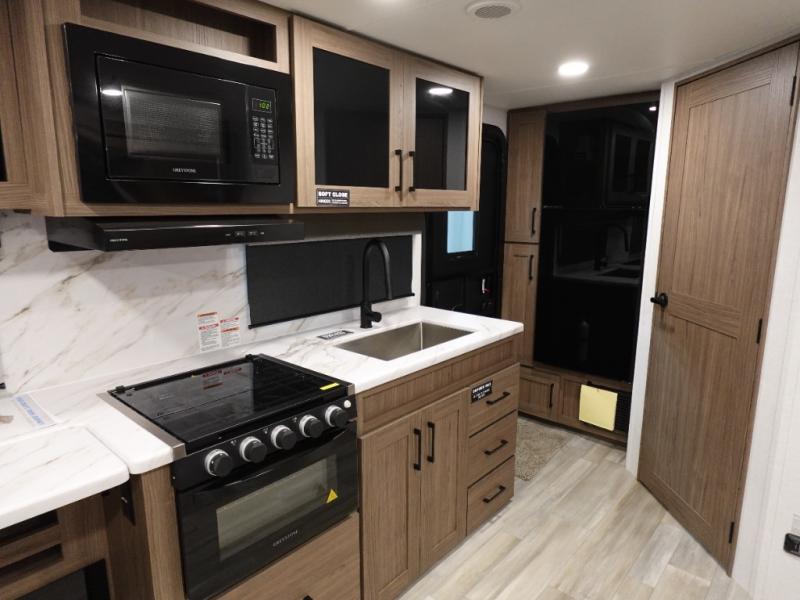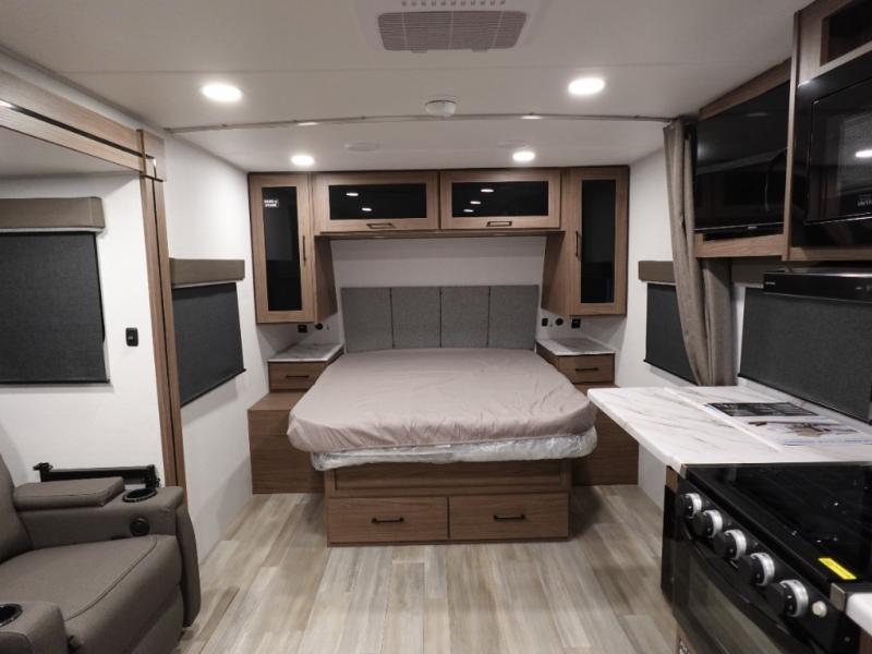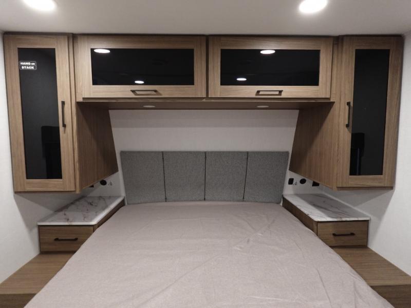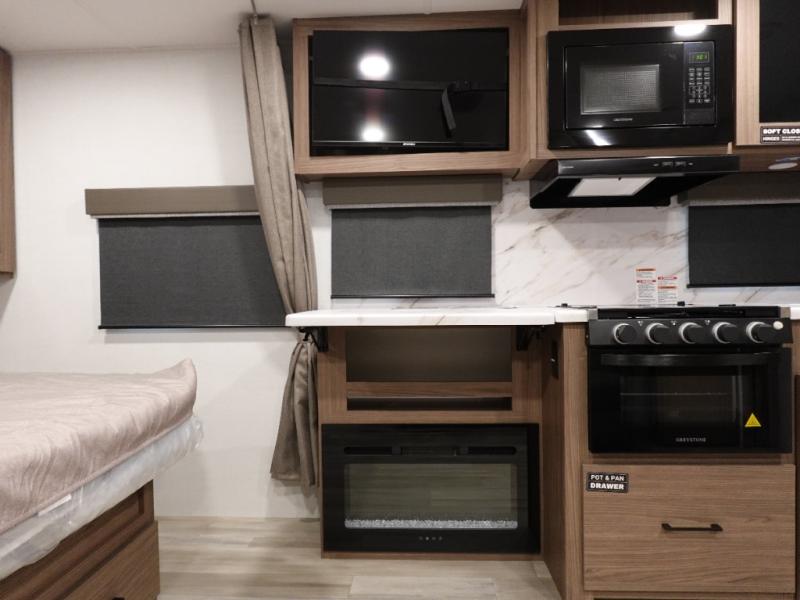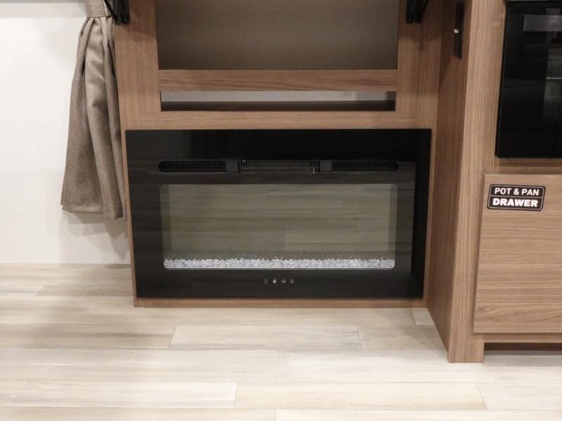 This couple's trailer is perfect for weekend trips to your favorite campground. The theater seat slide will provide comfort and space, while the fireplace across the room will have you feeling right at home. There are also two tables for the sofa and a flip-up extension by the fireplace for more counter space. All of your meals can be made on the three burner cooktop, and clean up will be a breeze with the large kitchen sink. A full bath is complete with a toilet, sink, 32" shower and a linen closet, and the front queen bed with a privacy curtain is sure to provide a great night's rest. You'll also find dual wardrobes and nightstands, along with overhead storage to keep everything organized!