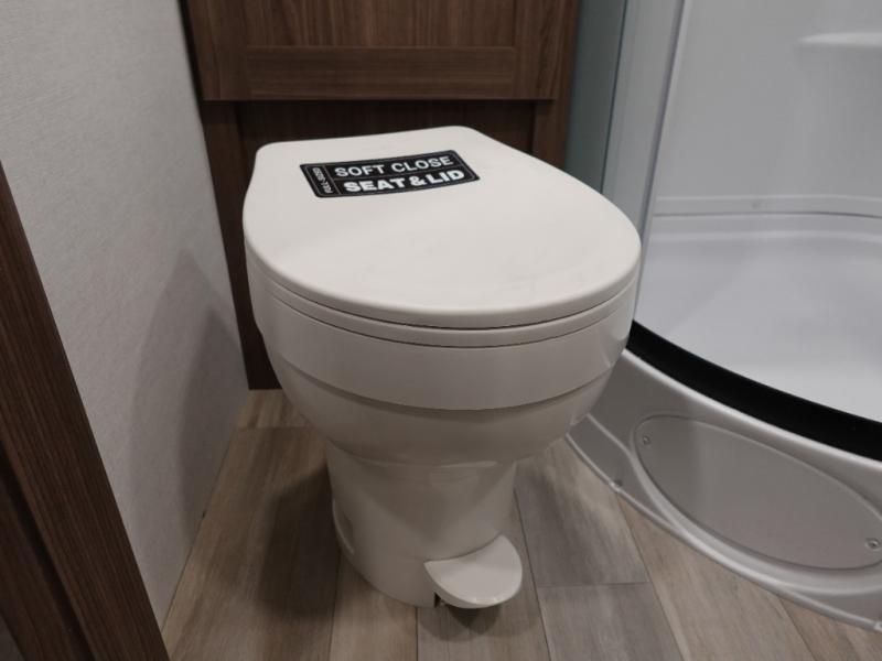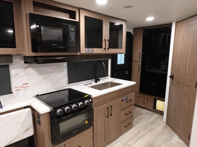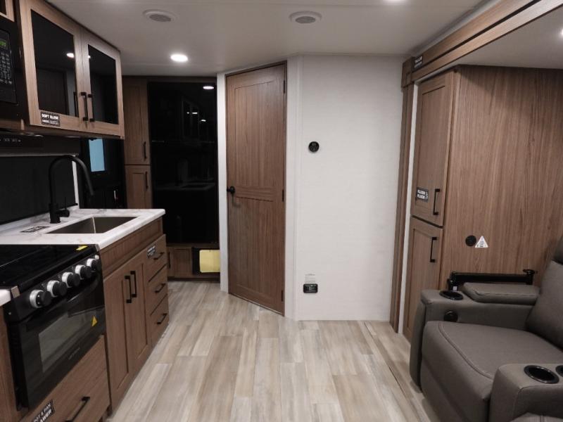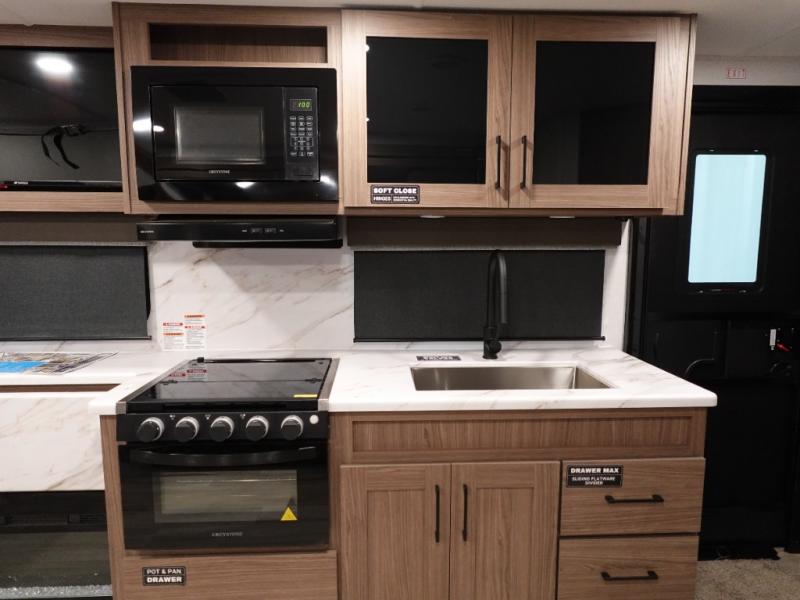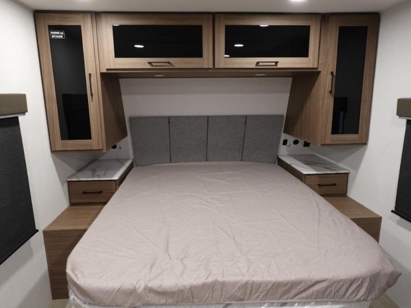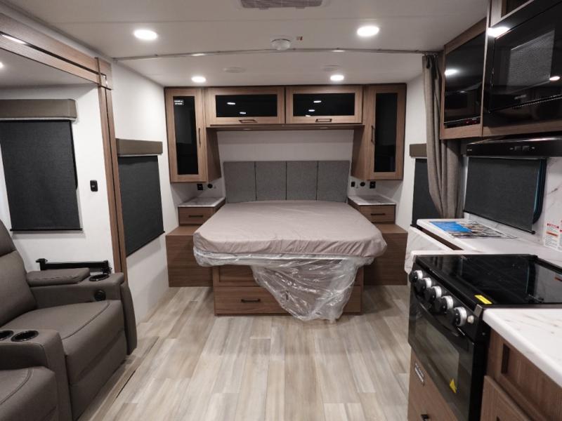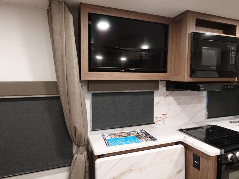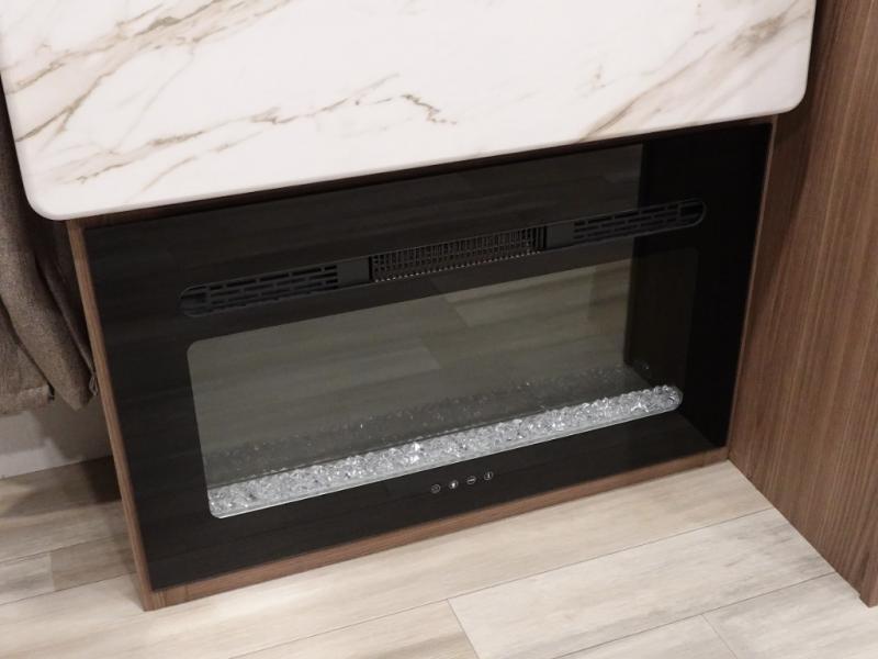 This couple's trailer is perfect for weekend trips to your favorite campground. The theater seat slide will provide comfort and space, while the fireplace across the room will have you feeling right at home. There are also two tables for the sofa and a flip-up extension by the fireplace for more counter space. All of your meals can be made on the three burner cooktop, and clean up will be a breeze with the large kitchen sink. A full bath is complete with a toilet, sink, 32" shower and a linen closet, and the front queen bed with a privacy curtain is sure to provide a great night's rest. You'll also find dual wardrobes and nightstands, along with overhead storage to keep everything organized!