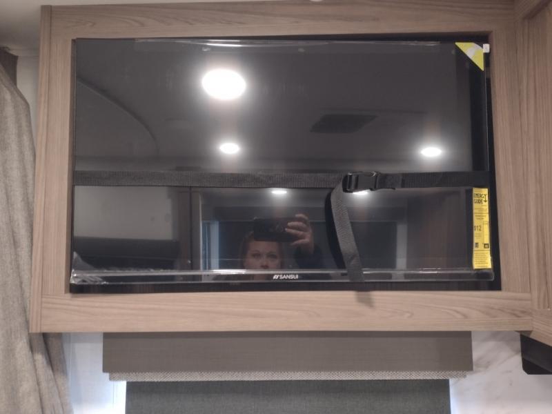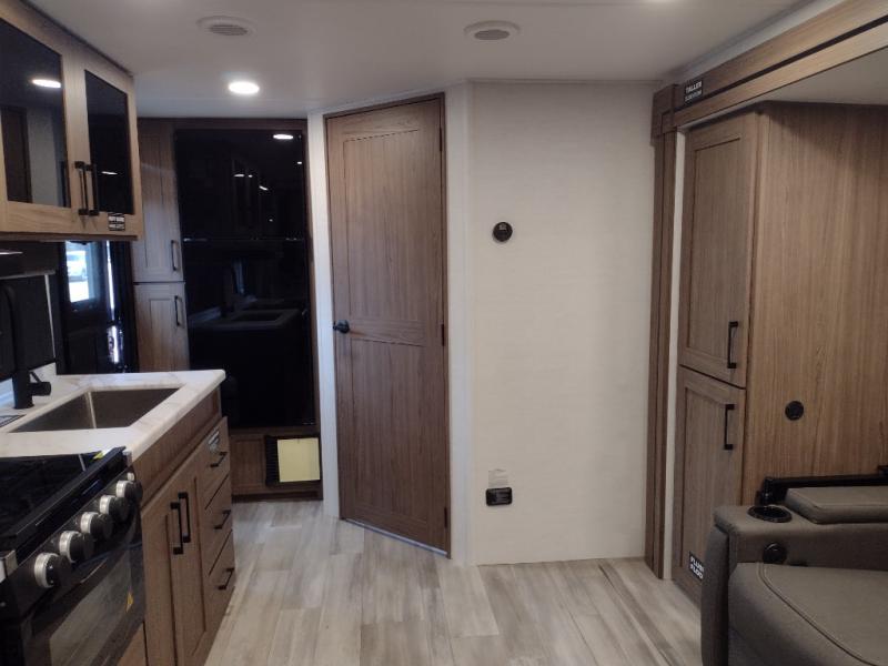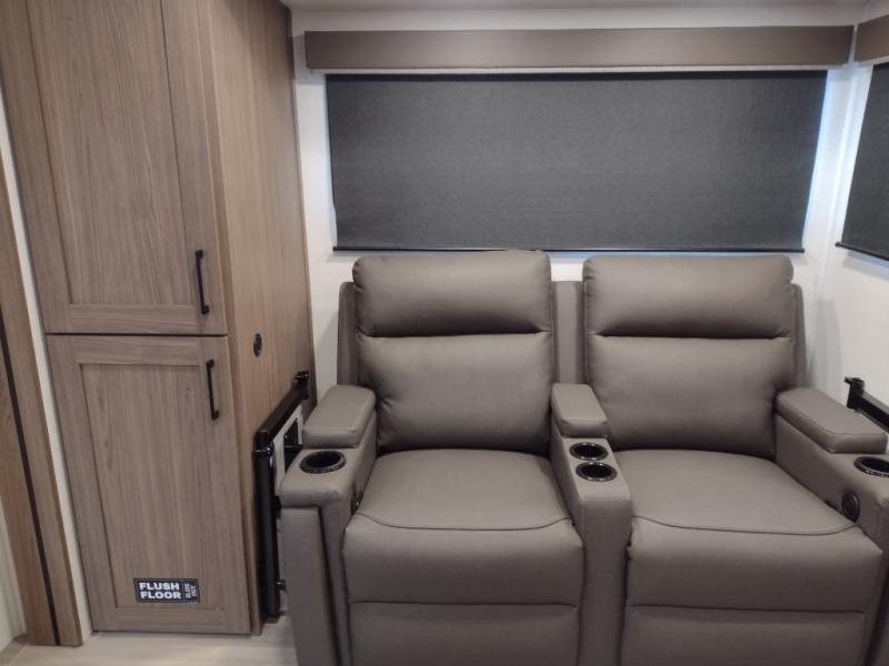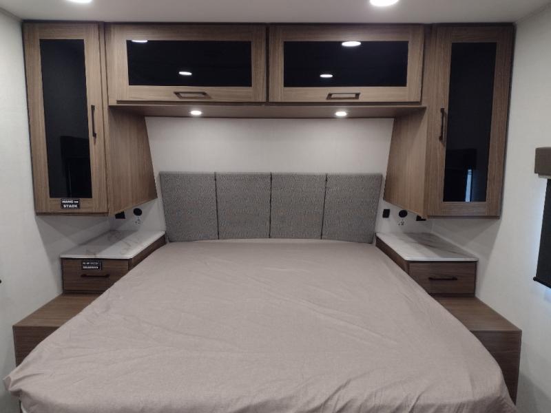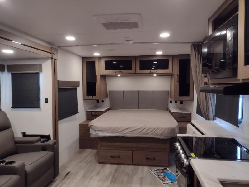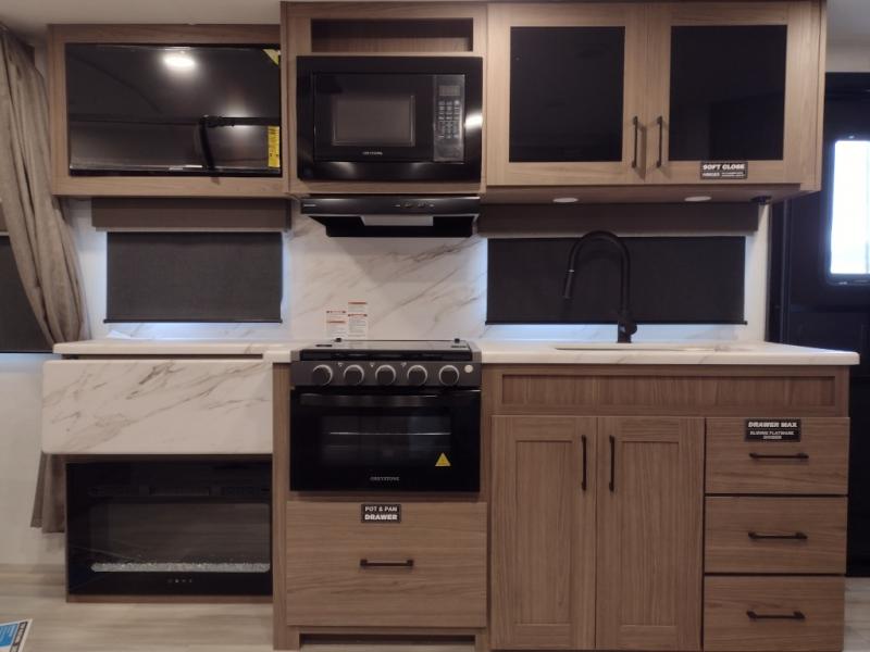 This couple's trailer is perfect for weekend trips to your favorite campground. The theater seat slide will provide comfort and space, while the fireplace across the room will have you feeling right at home. There are also two tables for the sofa and a flip-up extension by the fireplace for more counter space. All of your meals can be made on the three burner cooktop, and clean up will be a breeze with the large kitchen sink. A full bath is complete with a toilet, sink, 32" shower and a linen closet, and the front queen bed with a privacy curtain is sure to provide a great night's rest. You'll also find dual wardrobes and nightstands, along with overhead storage to keep everything organized!